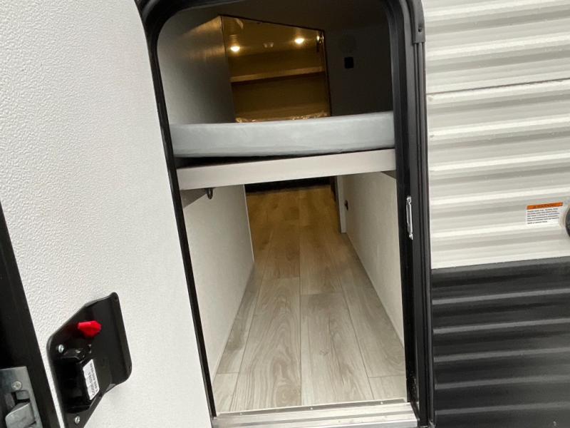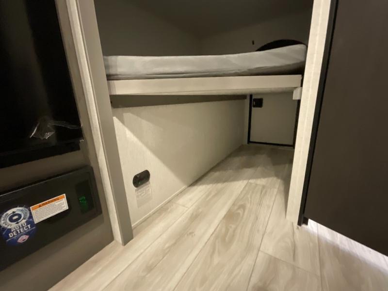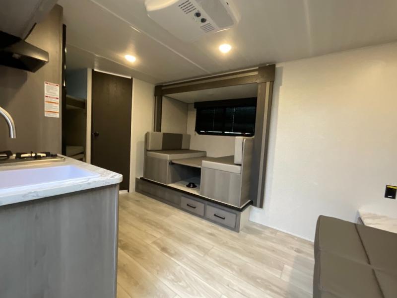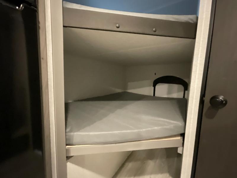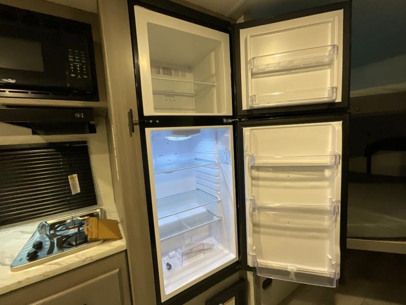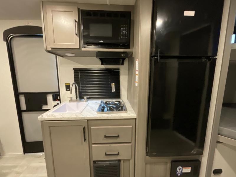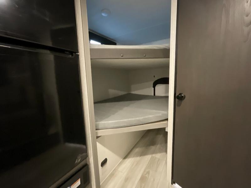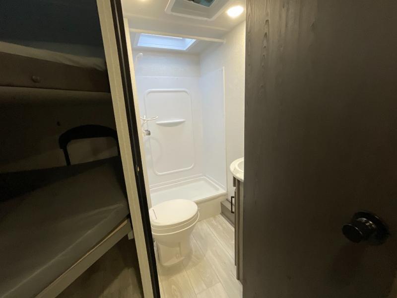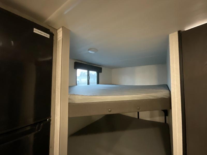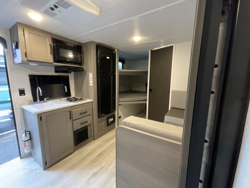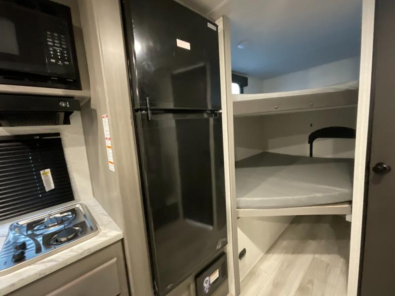 Inside, you’ll find a bright, thoughtfully laid-out interior with everything you need for memorable trips. The 181BH includes comfortable double-over-double bunks, giving kids or guests a cozy place to sleep without taking up valuable living space. The queen bed offers a relaxing spot to unwind after a full day outdoors, while the convertible dinette adds extra flexibility for sleeping or dining. The kitchen is equipped with modern appliances, plenty of storage, and all the essentials for cooking meals on the go. A well-designed bathroom with a shower and tub adds convenience for families.