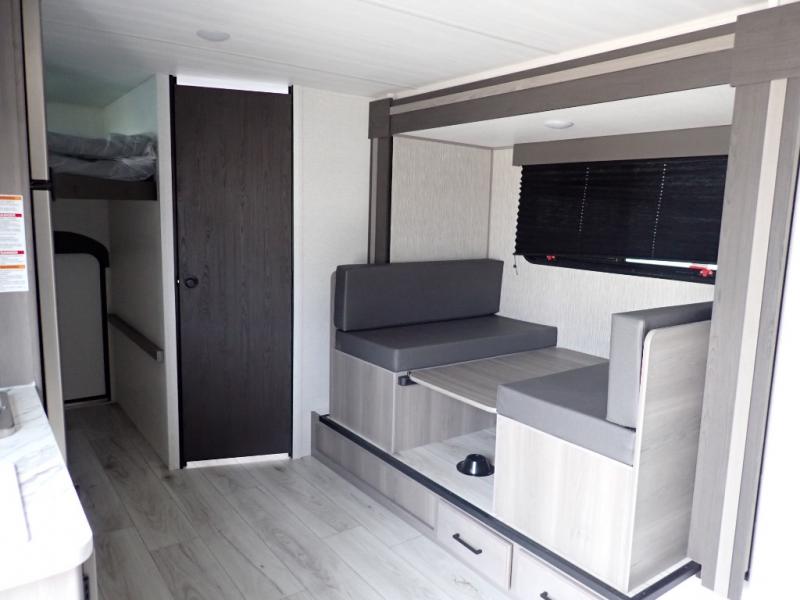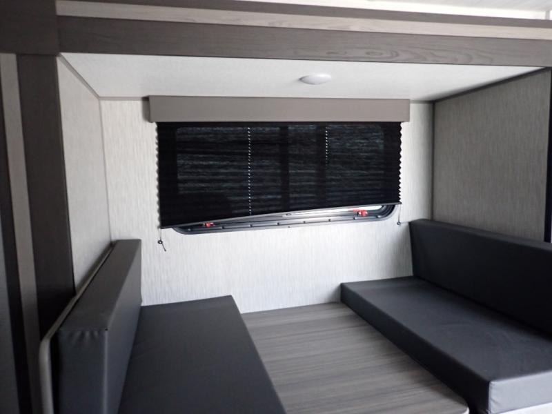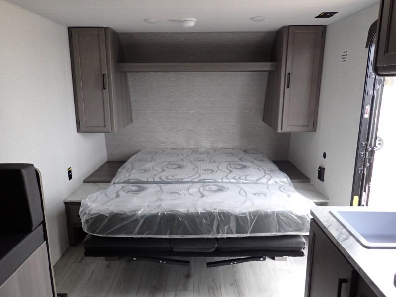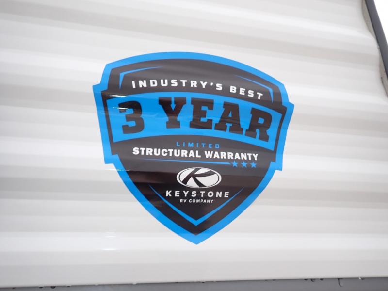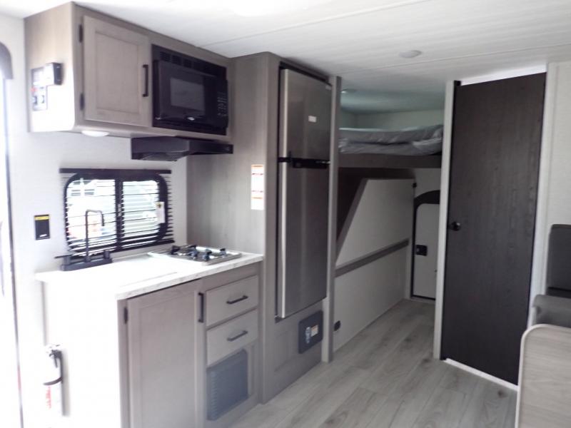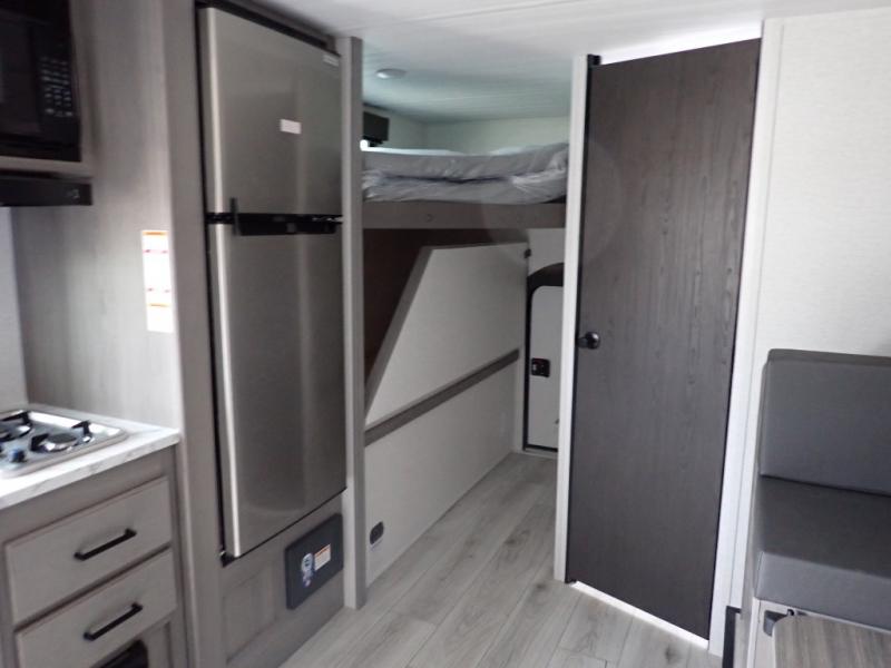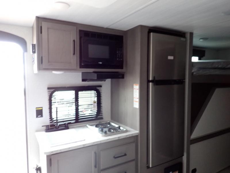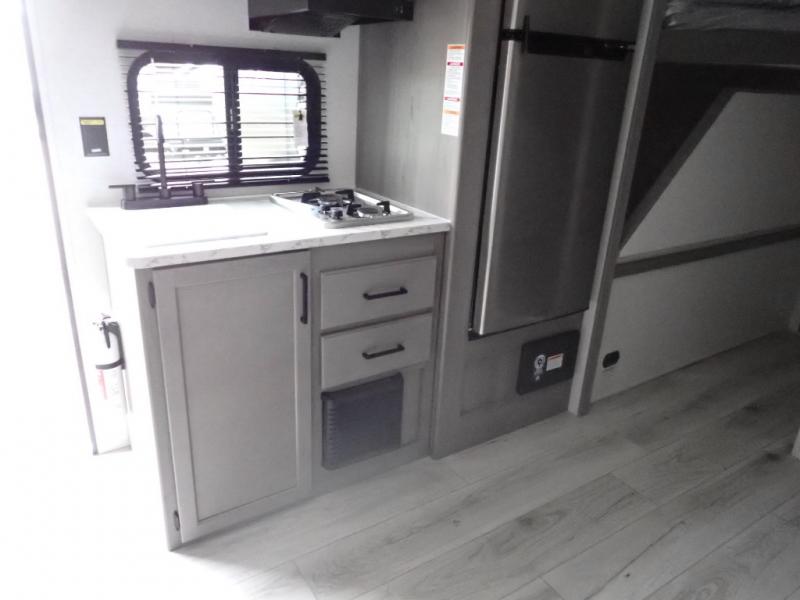 You will love how versatile this travel trailer is with its front Murphy bed that has a queen bed to lay your head on at night, folds down into a sofa, and even has shoe storage underneath it! There is a set of double bunk beds in the rear corner and a U-shaped dinette slide with storage drawers to keep your games out of the way. There is also outside storage under the bunks where you can easily flip up the bottom bunk to unload everything! You can keep everyone well fed with the two burner cooktop and 7.7 cu. ft. refrigerator, and the 15' power awning outdoors will provide a place for you all to visit after dinner.