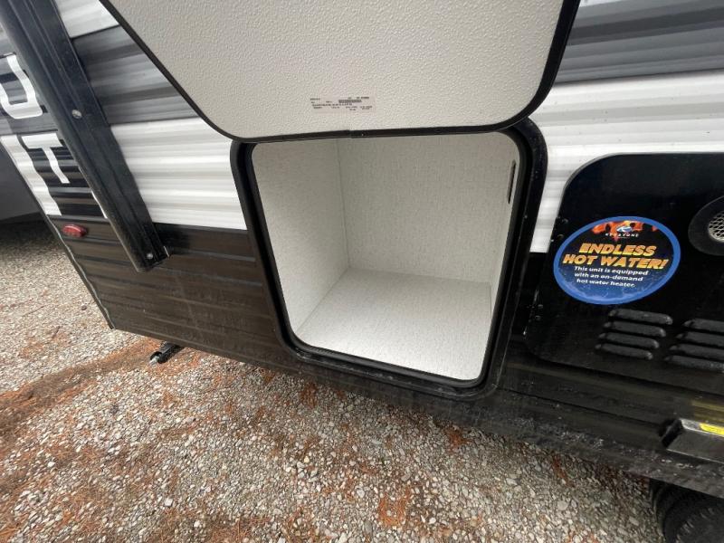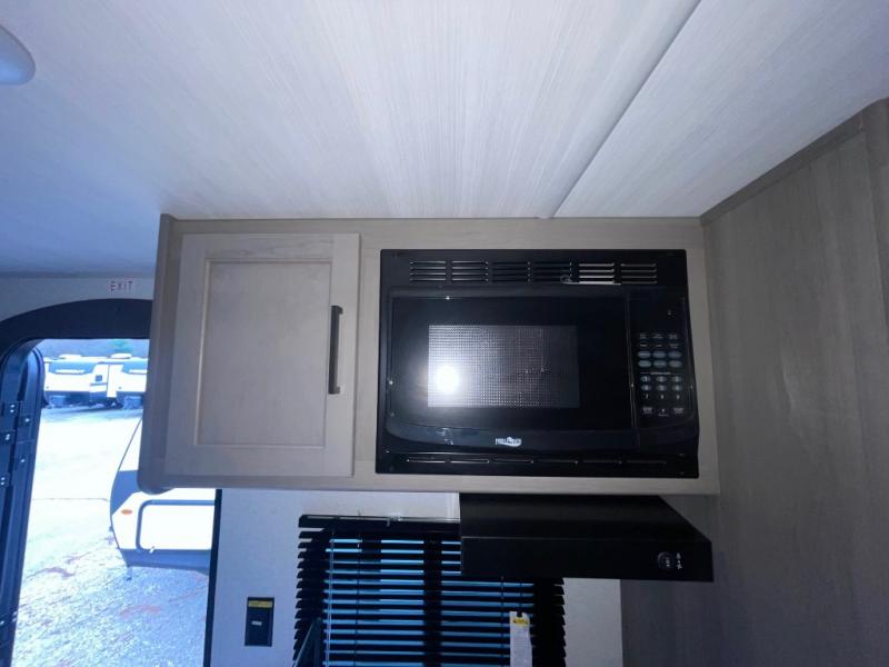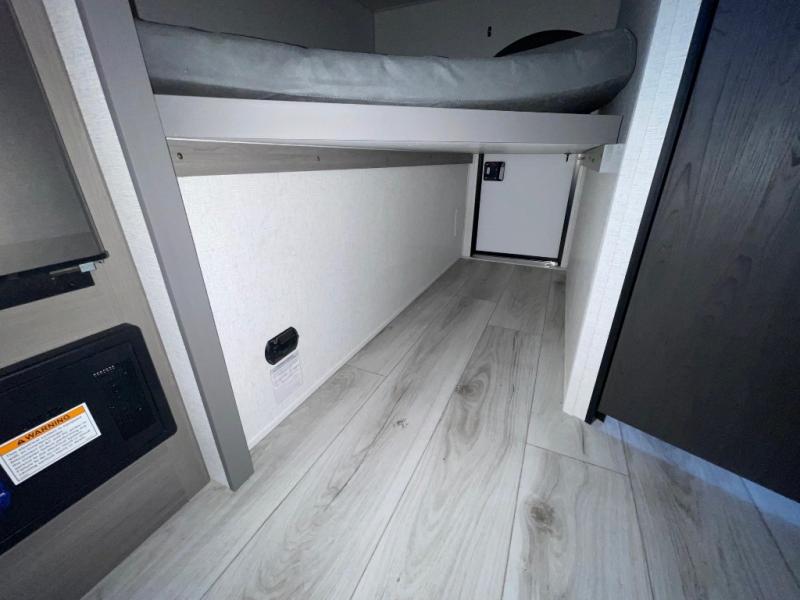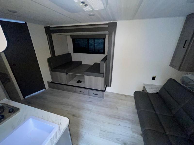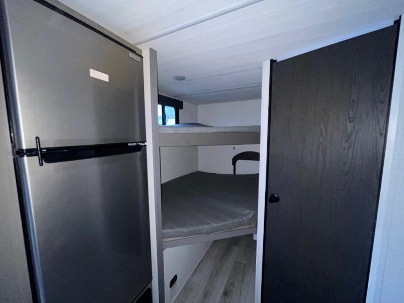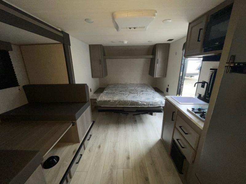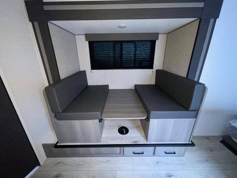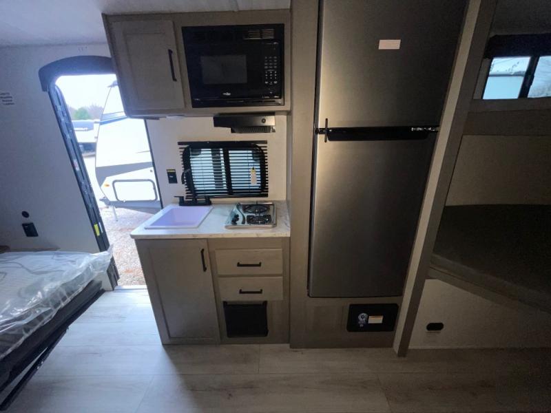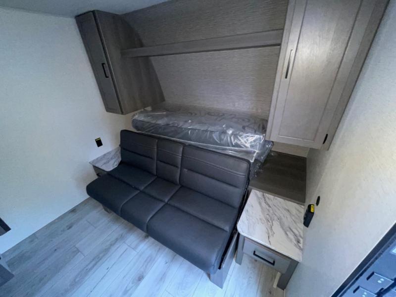You will love how versatile this travel trailer is with its front Murphy bed that has a queen bed to lay your head on at night, folds down into a sofa, and even has shoe storage underneath it! There is a set of double bunk beds in the rear corner and a U-shaped dinette slide with storage drawers to keep your games out of the way. There is also outside storage under the bunks where you can easily flip up the bottom bunk to unload everything! You can keep everyone well fed with the two burner cooktop and 7.7 cu. ft. refrigerator, and the 15' power awning outdoors will provide a place for you all to visit after dinner.