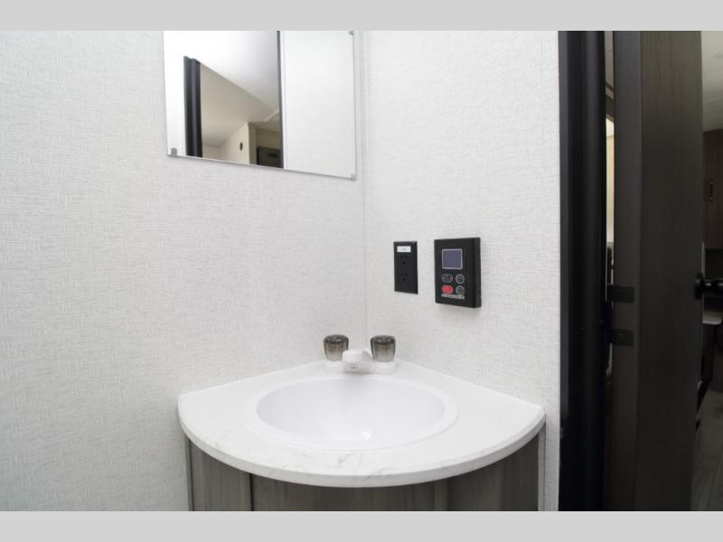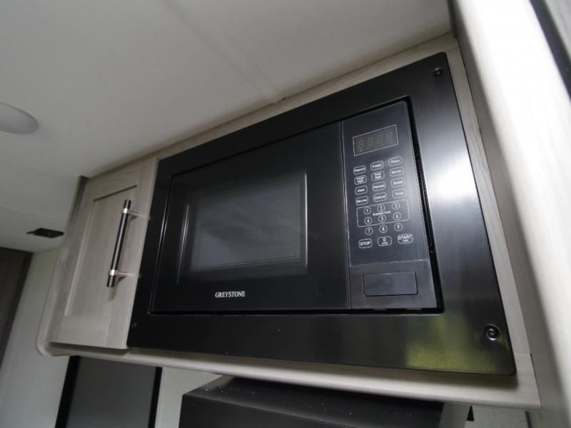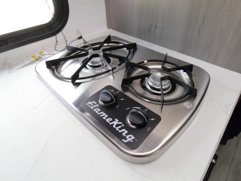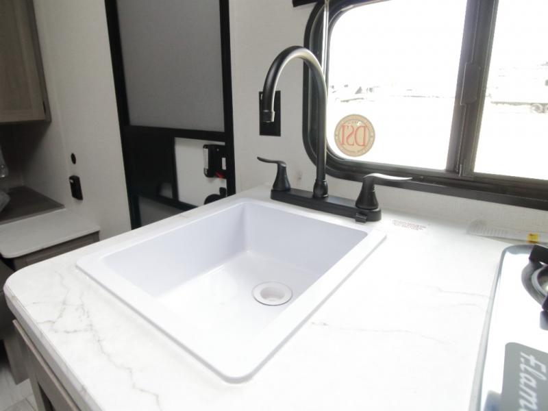 Inside, you’ll appreciate blackout night shades for restful sleep, solid wood doors and drawers for a residential feel, and bright LED lighting throughout. A Girard tankless water heater ensures on-demand hot water, making this travel trailer a true upgrade from tent camping or pop-ups.