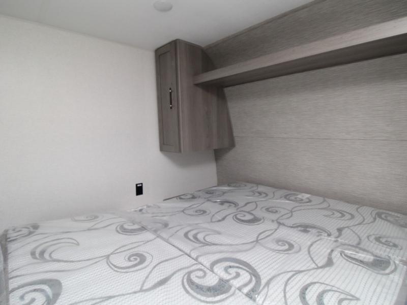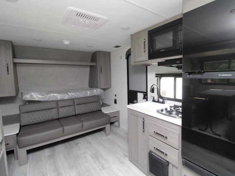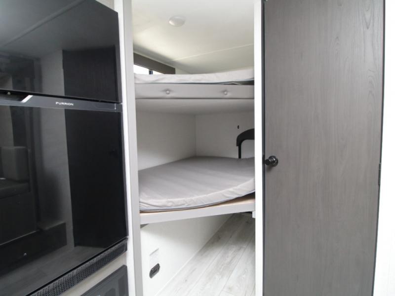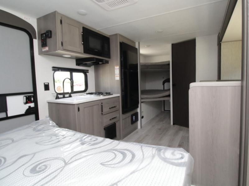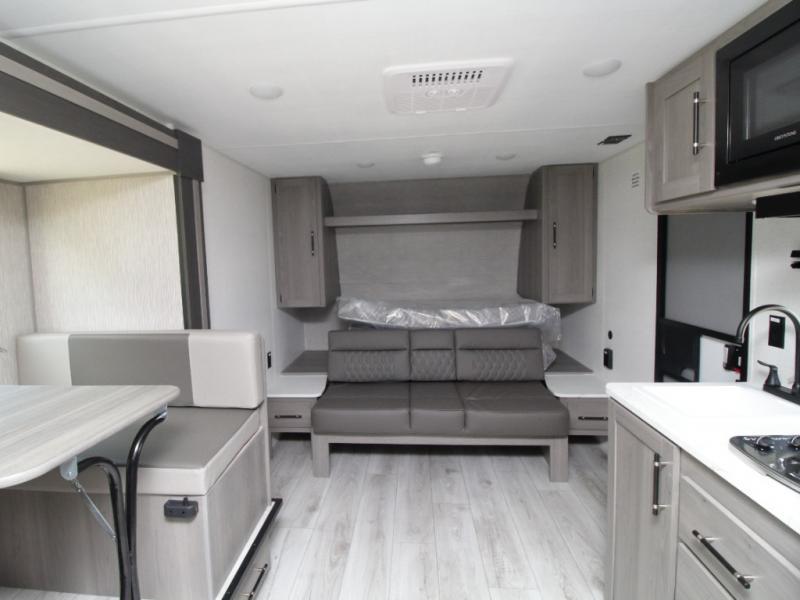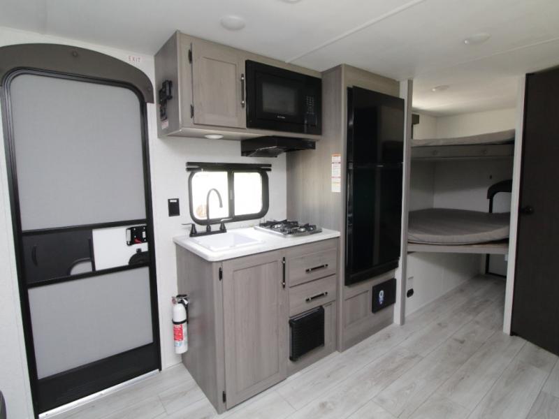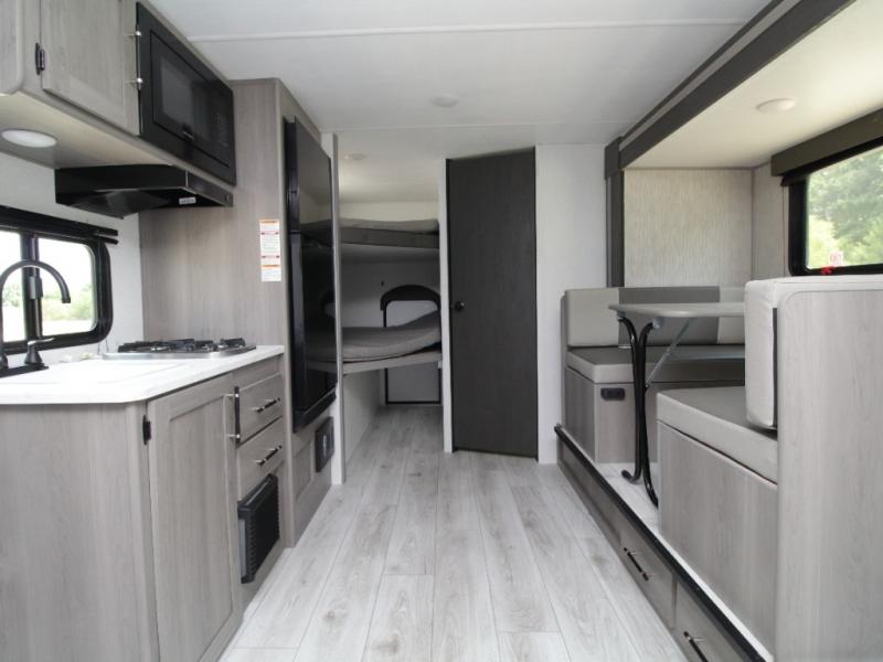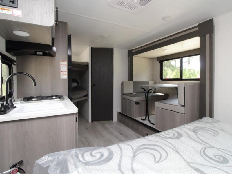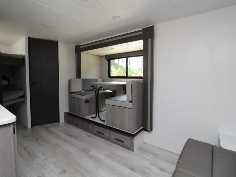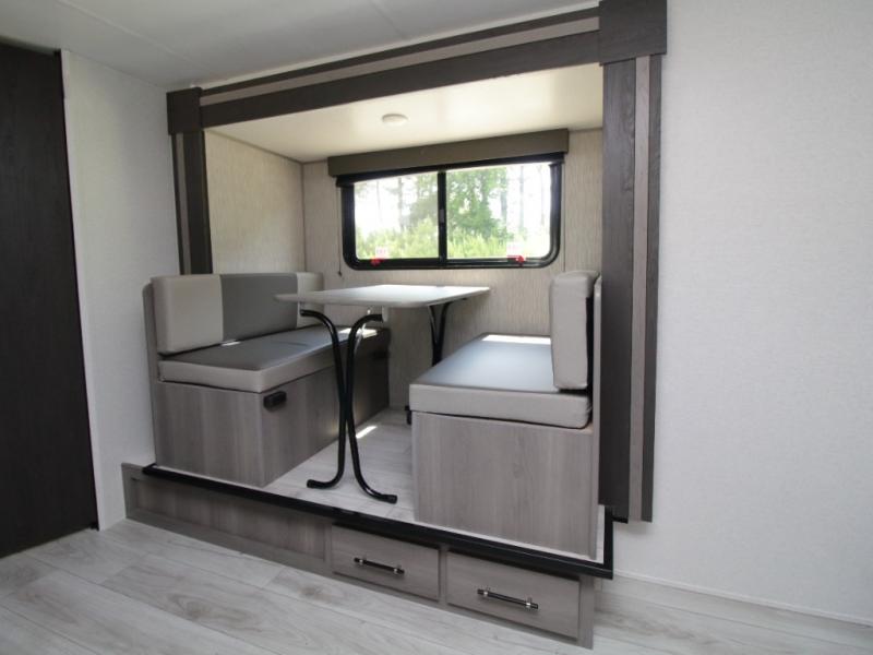 Preparing meals is easy with the two-burner cooktop, spacious 7.7 cu. ft. refrigerator, and convenient indoor layout. After a day of outdoor fun, enjoy dinner under the 15-foot power awning or gather inside around the dinette. Additional exterior storage under the bunks and a pass-through compartment allow you to pack everything you need for a successful trip.