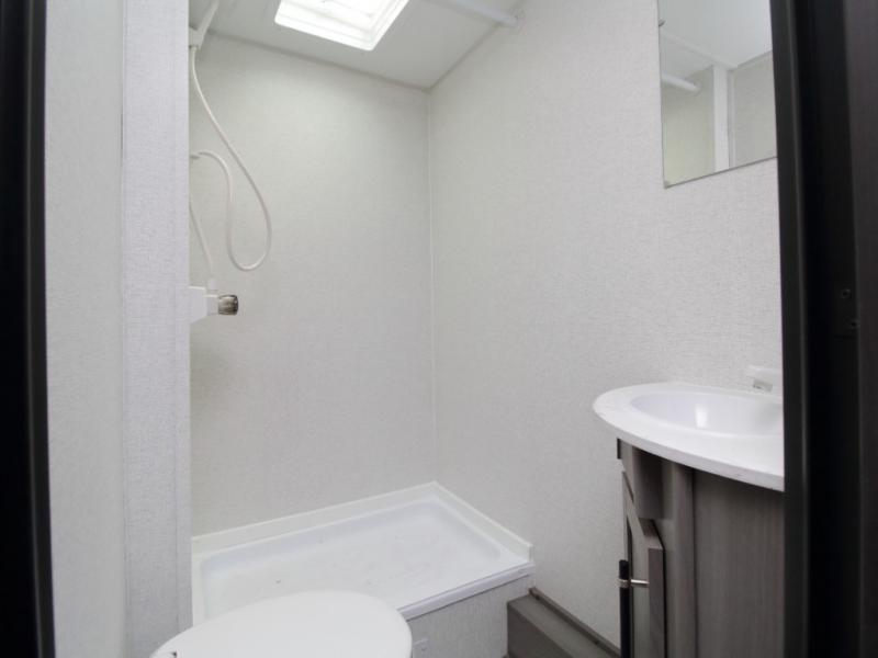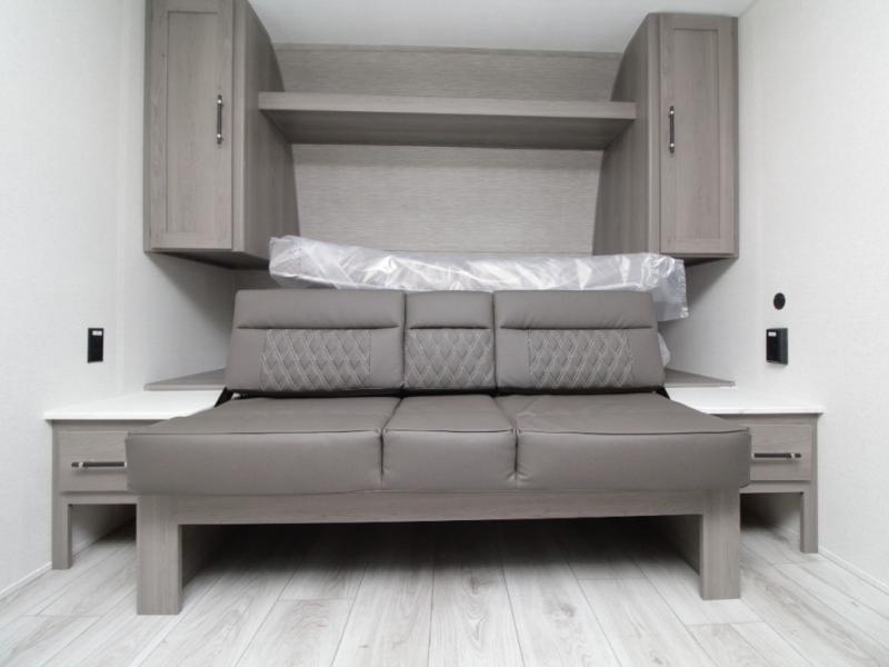 The front Murphy bed effortlessly converts from a queen-size bed into a sofa, providing both a cozy place to sleep and added daytime seating. Shoe storage beneath the bed helps keep the floor clear and organized. In the rear, double bunk beds offer dedicated sleeping space for kids or guests, while the booth dinette slide includes built-in storage drawers for games, books, or supplies.