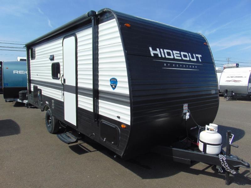Open your horizons with the Hideout Sport Single Axle travel trailers by Keystone. They are compact, convenient, and lightweight; everything you're looking for in an RV! Each model features an aluminum exterior, tinted safety glass windows, and a Super Flex TPO roof membrane for added durability. The interior includes blackout night shades for added privacy and real wood doors and drawers that will give a more at-home touch. The Girard tankless water heater is a feature you won't want to camp without, and the LED lighting will keep your space bright and open!
