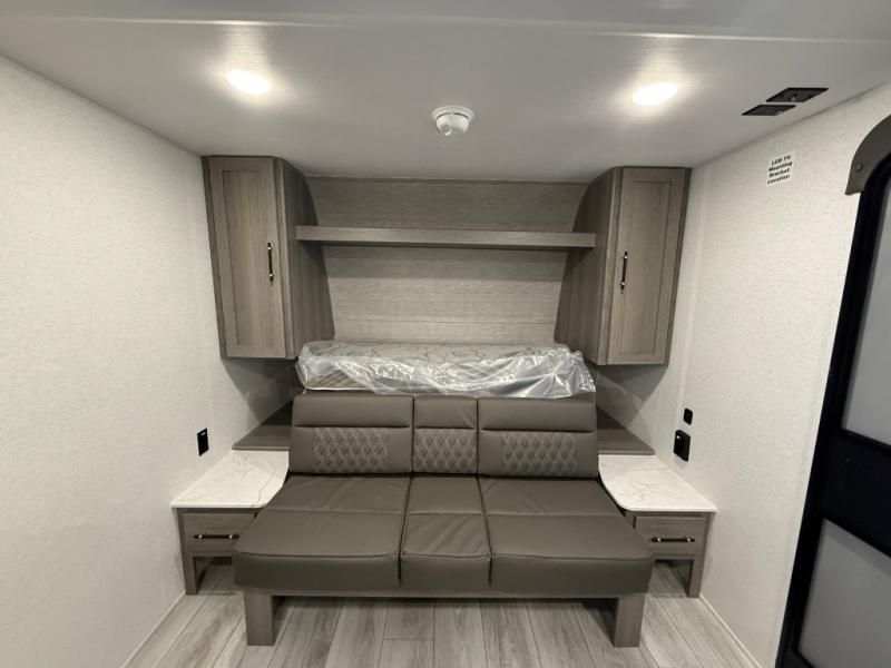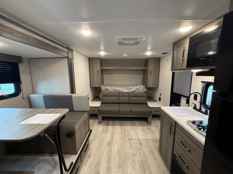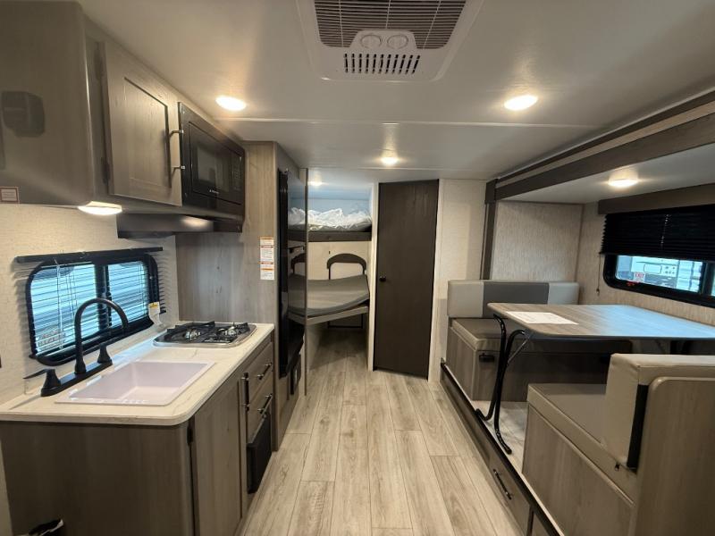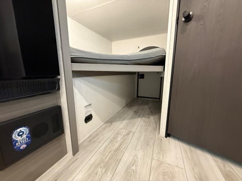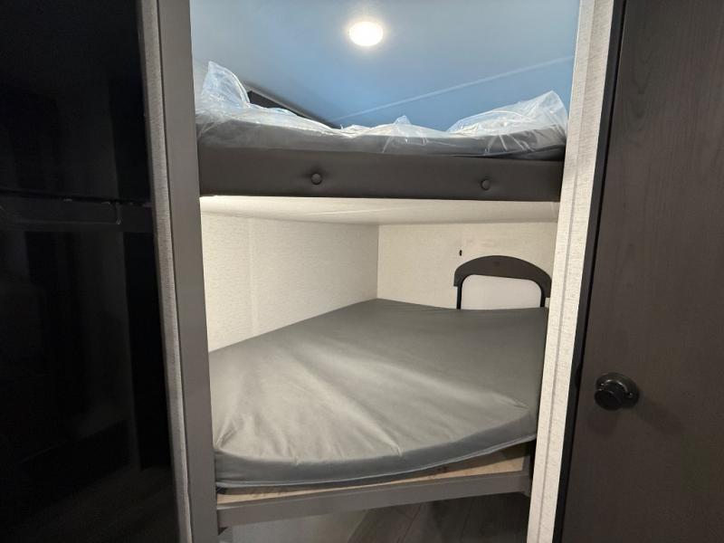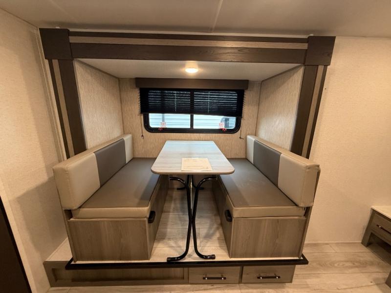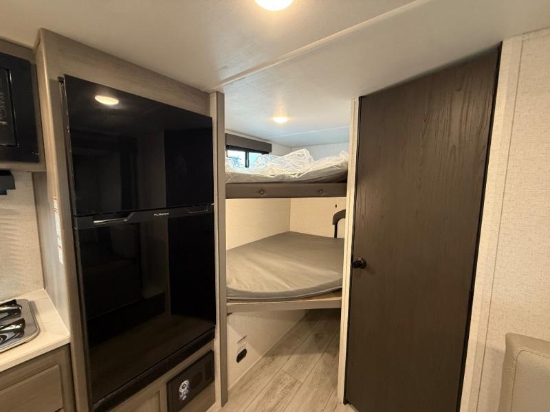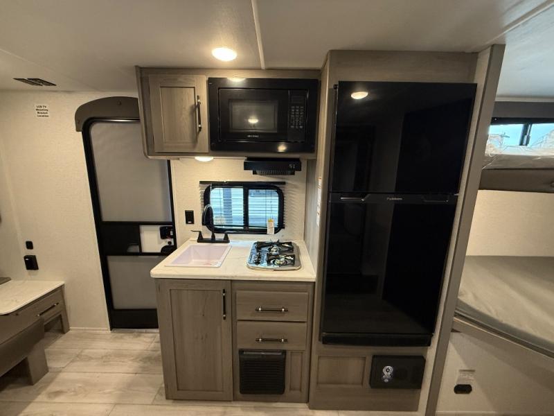 You will love how versatile this travel trailer is with its front Murphy bed that has a queen bed to lay your head on at night, folds down into a sofa, and even has shoe storage underneath it! There is a set of double bunk beds in the rear corner and a U-shaped dinette slide with storage drawers to keep your games out of the way. There is also outside storage under the bunks where you can easily flip up the bottom bunk to unload everything! You can keep everyone well fed with the two burner cooktop and 7.7 cu. ft. refrigerator, and the 15' power awning outdoors will provide a place for you all to visit after dinner.
