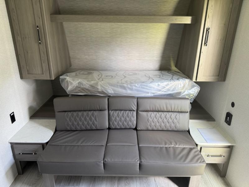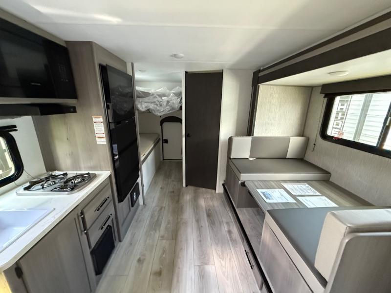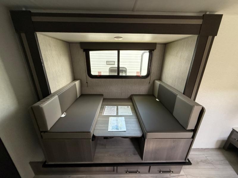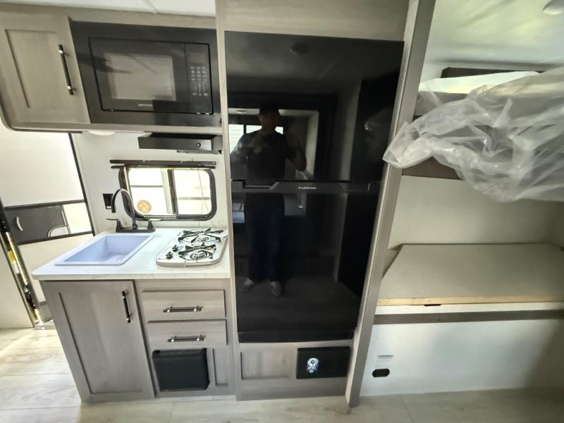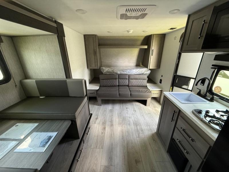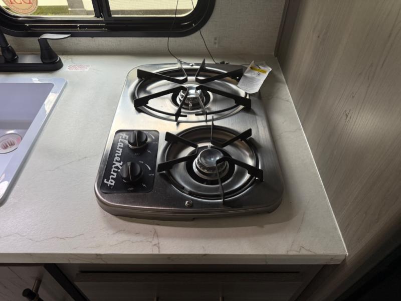 You will love how versatile this travel trailer is with its front Murphy bed that has a queen bed to lay your head on at night, folds down into a sofa, and even has shoe storage underneath it! There is a set of double bunk beds in the rear corner and a U-shaped dinette slide with storage drawers to keep your games out of the way. There is also outside storage under the bunks where you can easily flip up the bottom bunk to unload everything! You can keep everyone well fed with the two burner cooktop and 7.7 cu. ft. refrigerator, and the 15' power awning outdoors will provide a place for you all to visit after dinner.