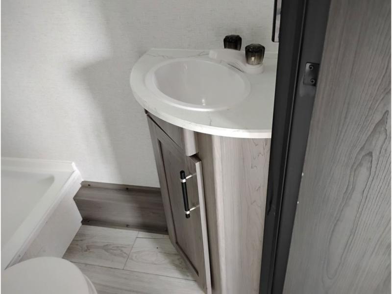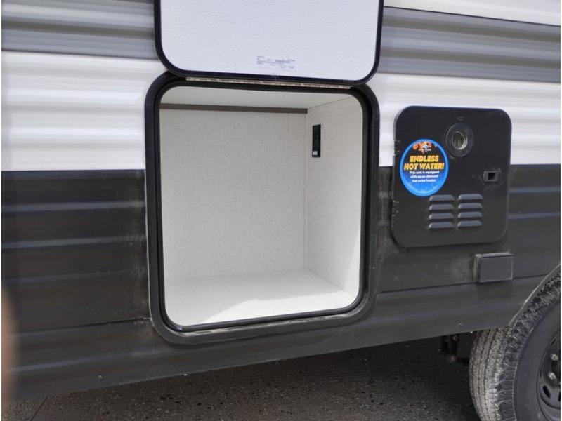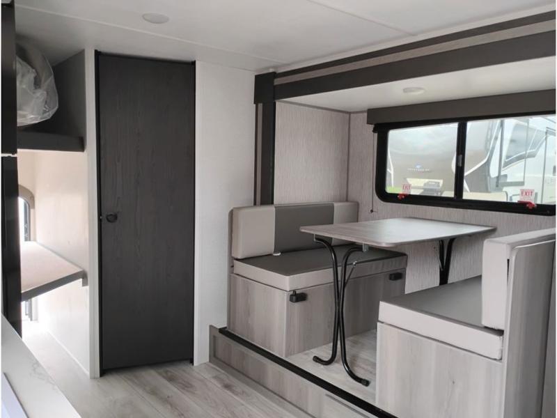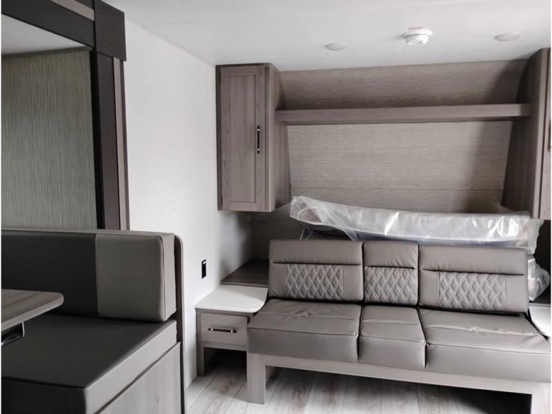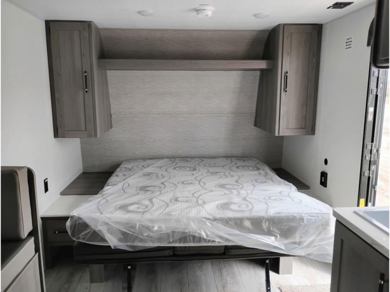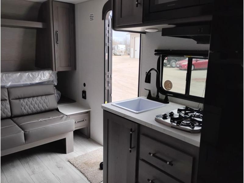 You will love how versatile this travel trailer is with its front Murphy bed that has a queen bed to lay your head on at night, folds down into a sofa, and even has storage underneath it! There is a set of double bunk beds in the rear corner and a booth dinette slide with storage drawers to keep your games out of the way. There is also outside storage under the bunks where you can easily flip up the bottom bunk to unload everything! You can keep everyone well fed with the two burner cooktop and 7.7 cu. ft. refrigerator, and the 15' power awning outdoors will provide a place for you all to visit after dinner.