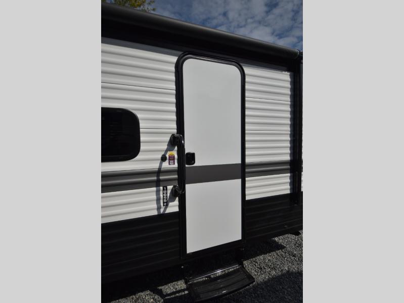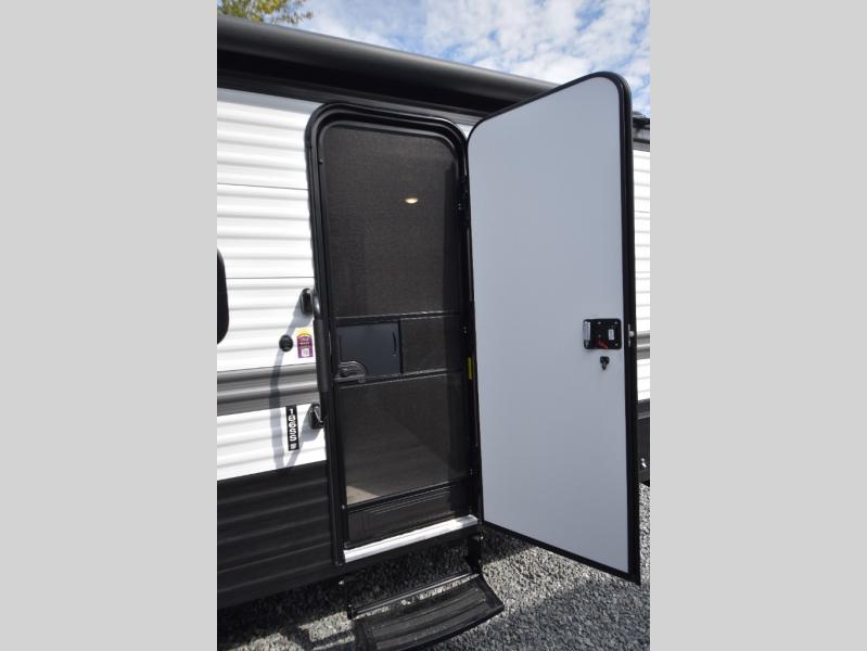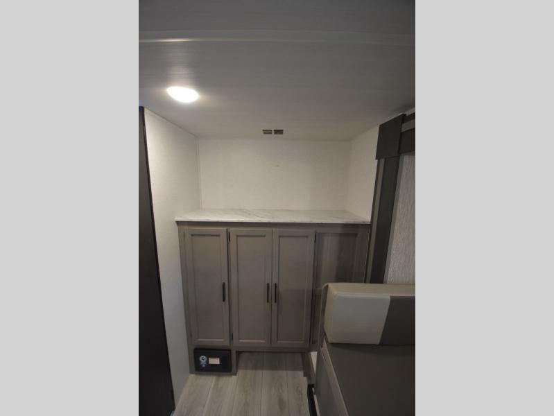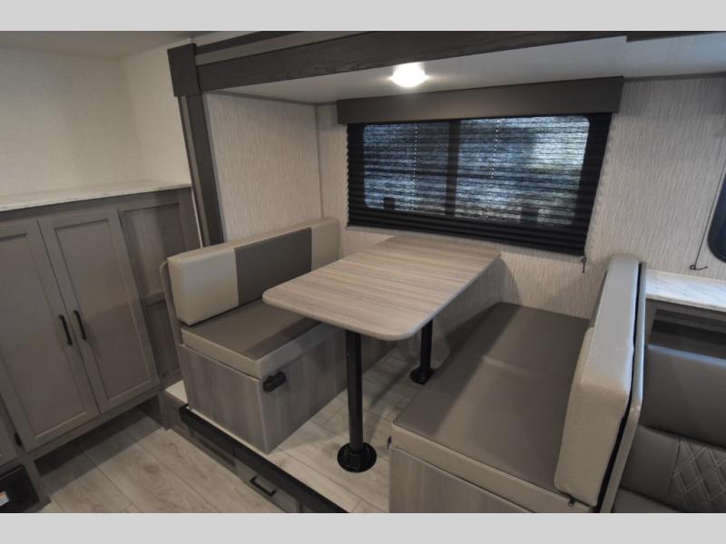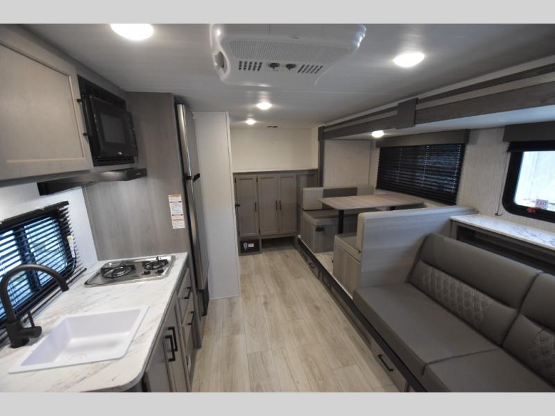 Head to the lake in this spacious trailer that can sleep five to six each night. There is a front queen bed for you, plus a sofa and booth dinette within the large slide out that doubles as seating and sleeping space. You will also find storage drawers below, and there is a pantry and closet along the rear wall for all your goodies and such. The cook will love the galley kitchen with a two burner cooktop and a 7.7 cu. ft. refrigerator for food storage. The TV prep means you can bring along your television for movie nights, and the countertop behind the sofa provides more space for belongings!