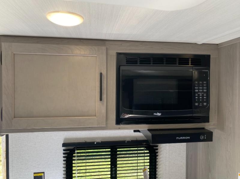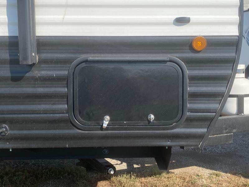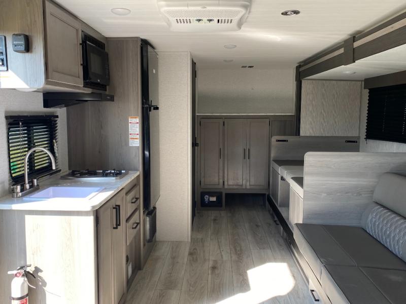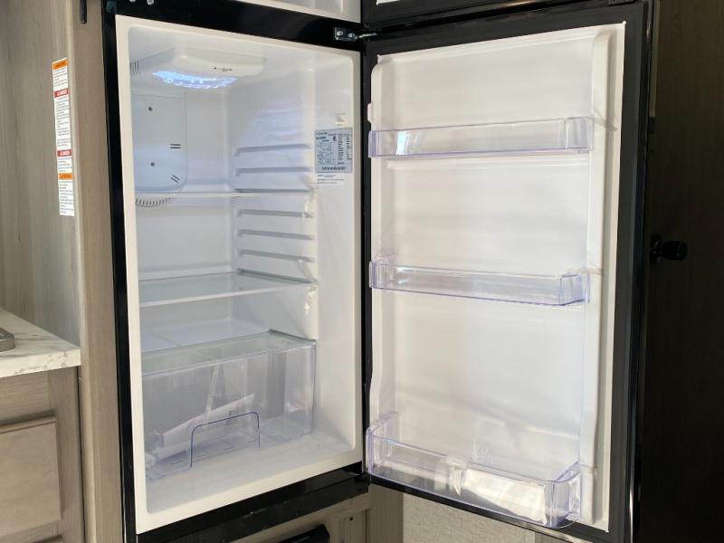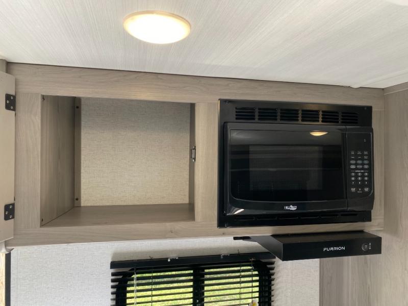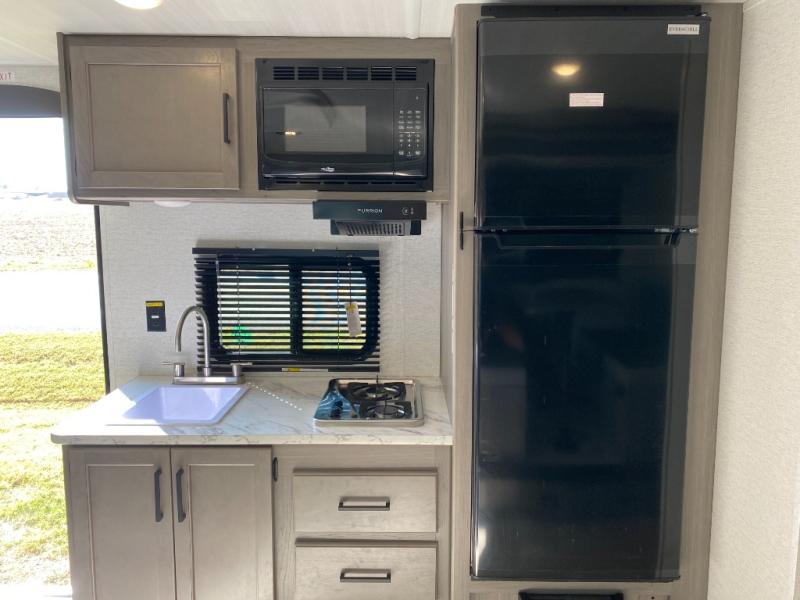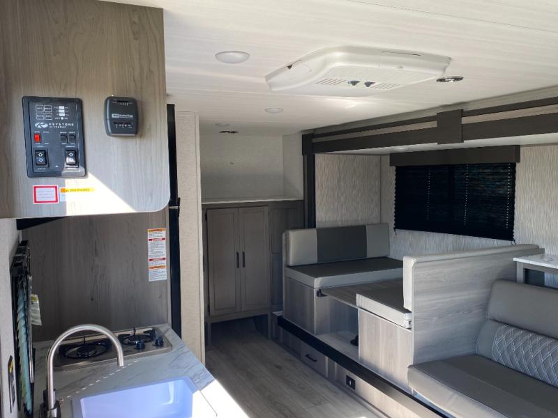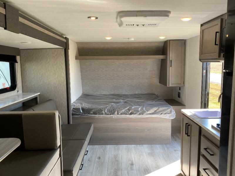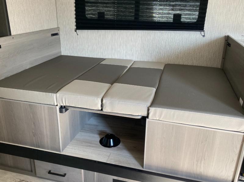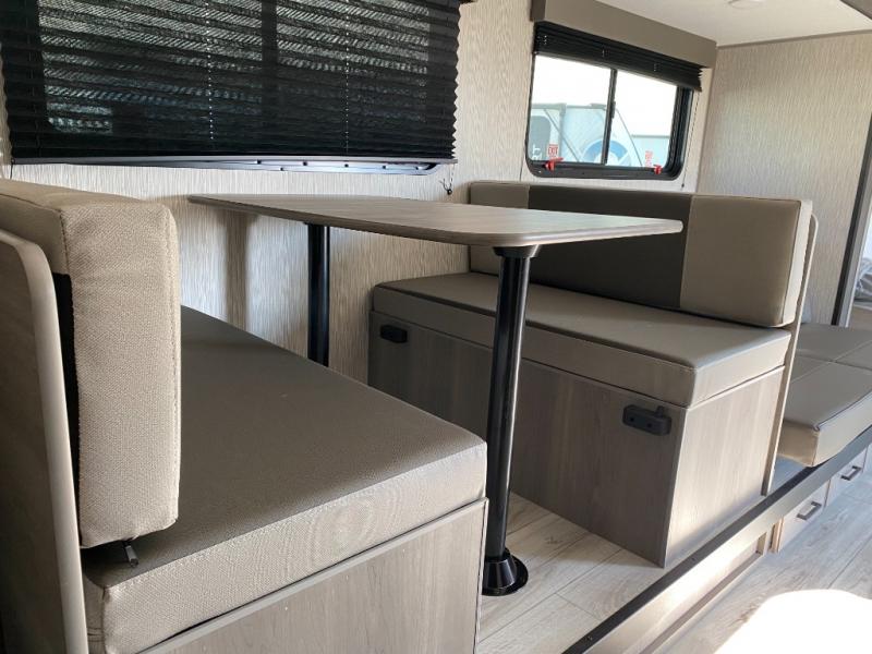 Head to the lake in this spacious trailer that can sleep five to six each night. There is a front queen bed for you, plus a sofa and booth dinette within the large slide out that doubles as seating and sleeping space. You will also find storage drawers below, and there is a pantry and closet along the rear wall for all your goodies and such. The cook will love the galley kitchen with a two burner cooktop and a 7.7 cu. ft. refrigerator for food storage. The TV prep means you can bring along your television for movie nights, and the countertop behind the sofa provides more space for belongings!