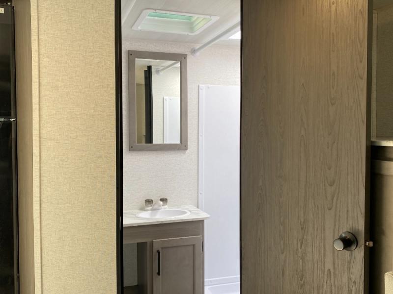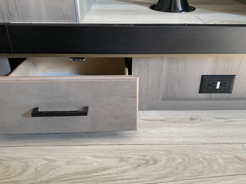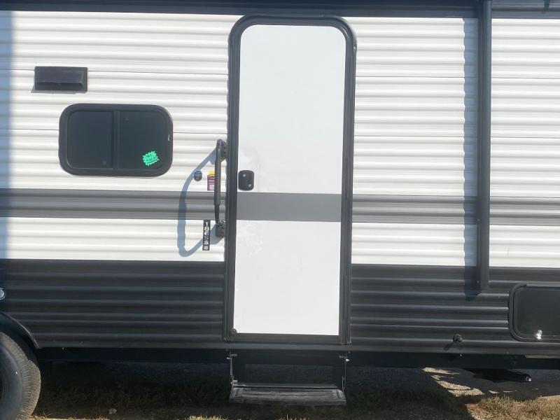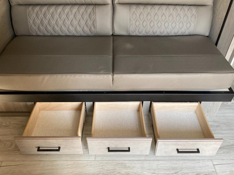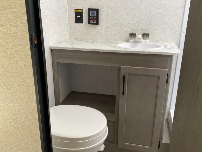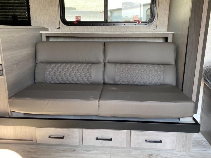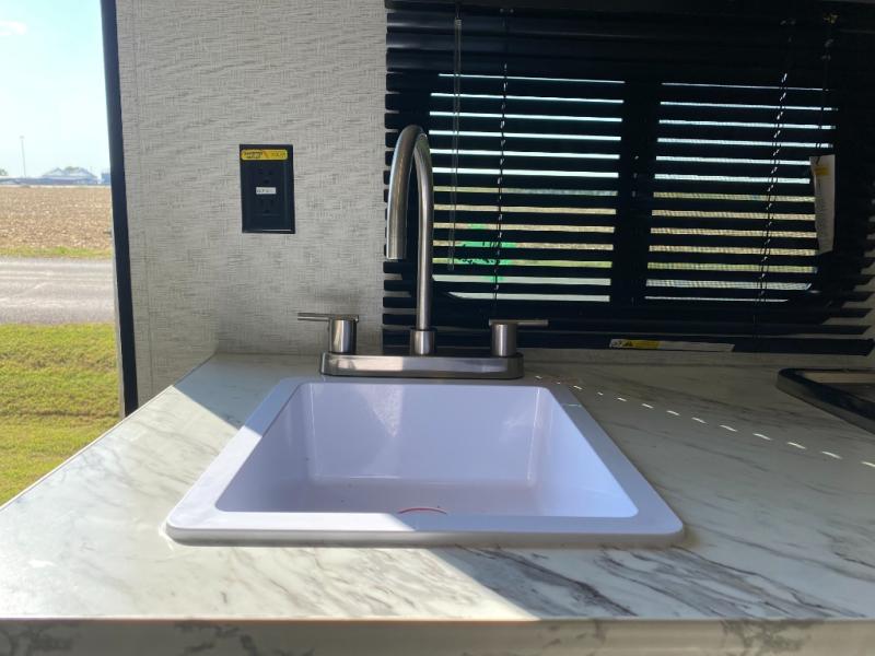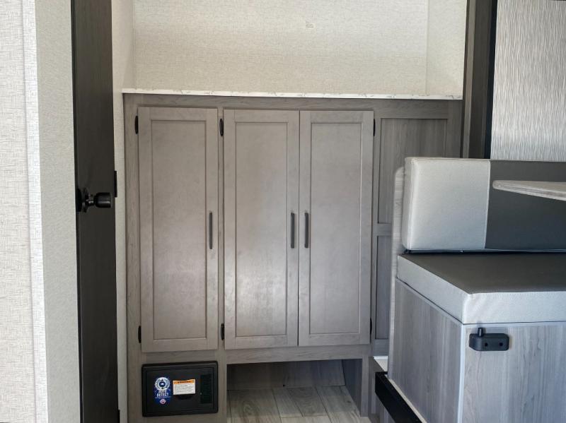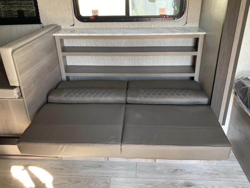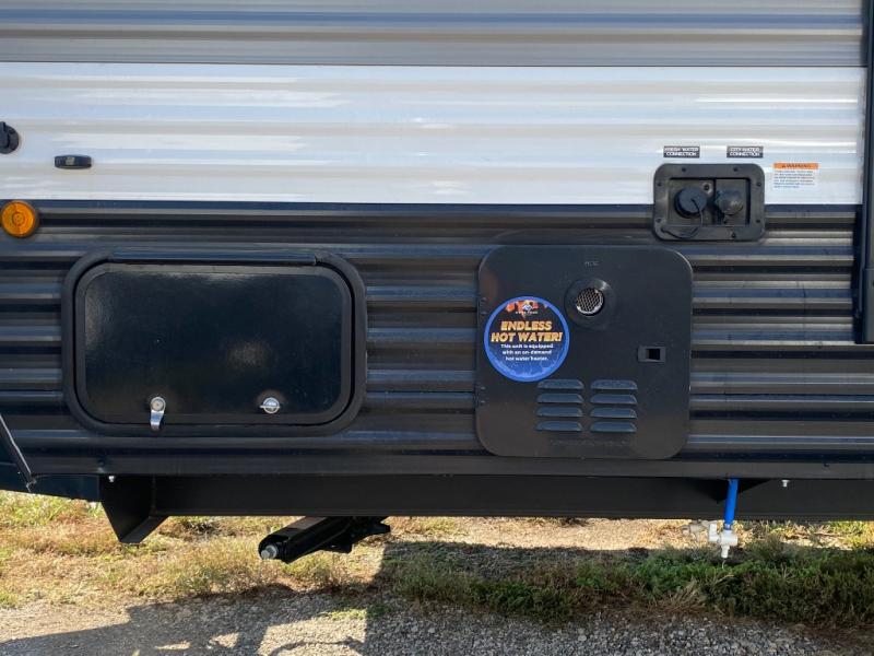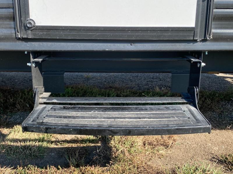 Head to the lake in this spacious trailer that can sleep five to six each night. There is a front queen bed for you, plus a sofa and booth dinette within the large slide out that doubles as seating and sleeping space. You will also find storage drawers below, and there is a pantry and closet along the rear wall for all your goodies and such. The cook will love the galley kitchen with a two burner cooktop and a 7.7 cu. ft. refrigerator for food storage. The TV prep means you can bring along your television for movie nights, and the countertop behind the sofa provides more space for belongings!