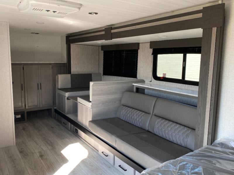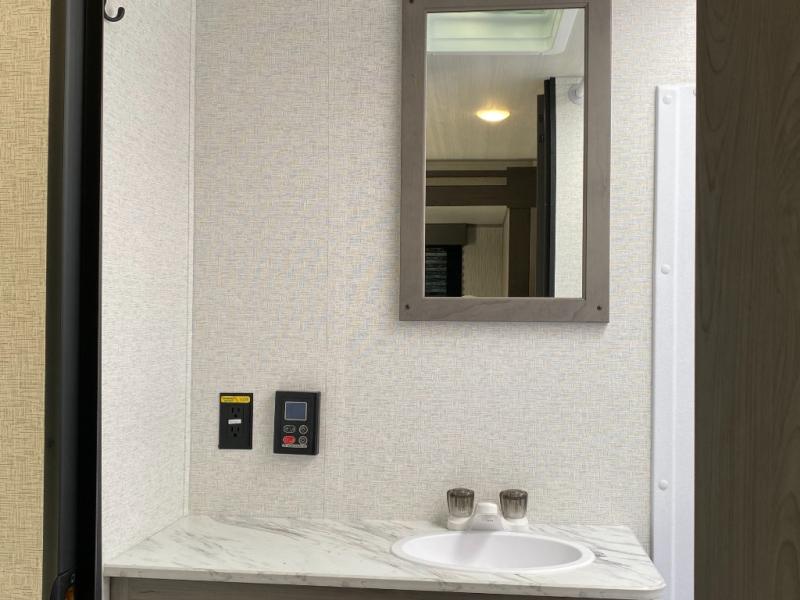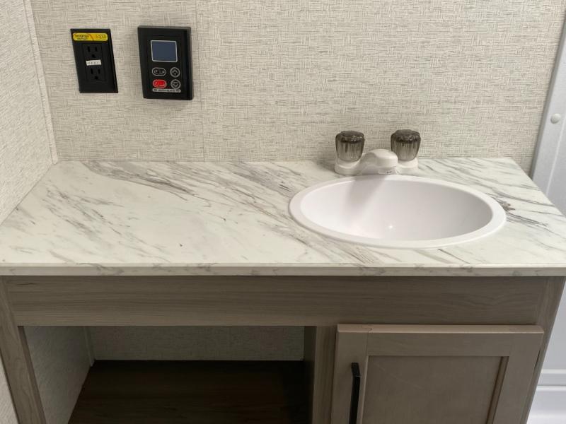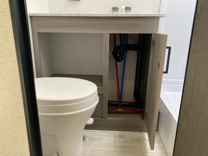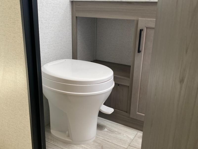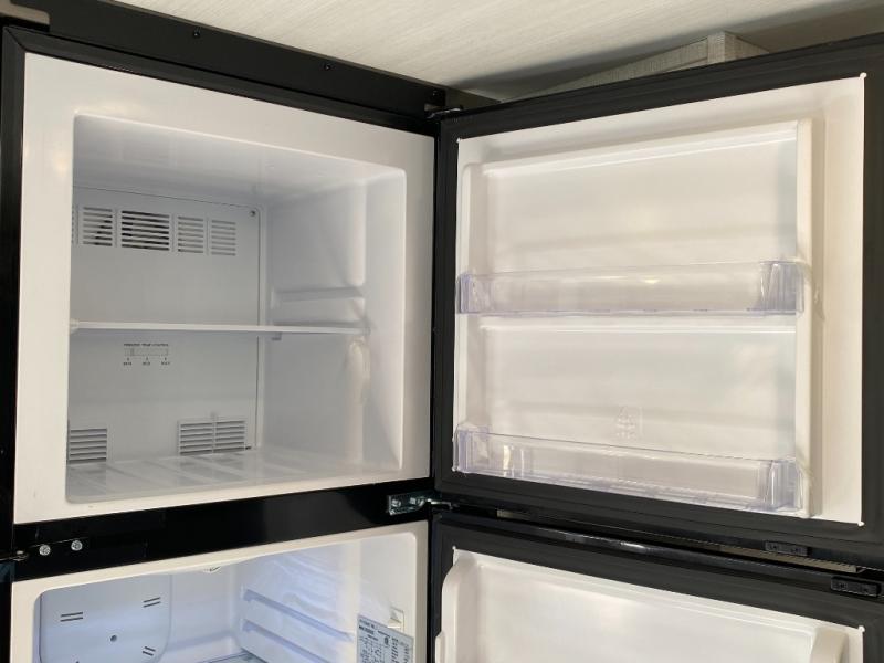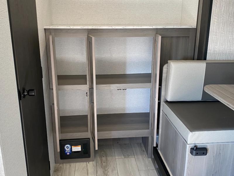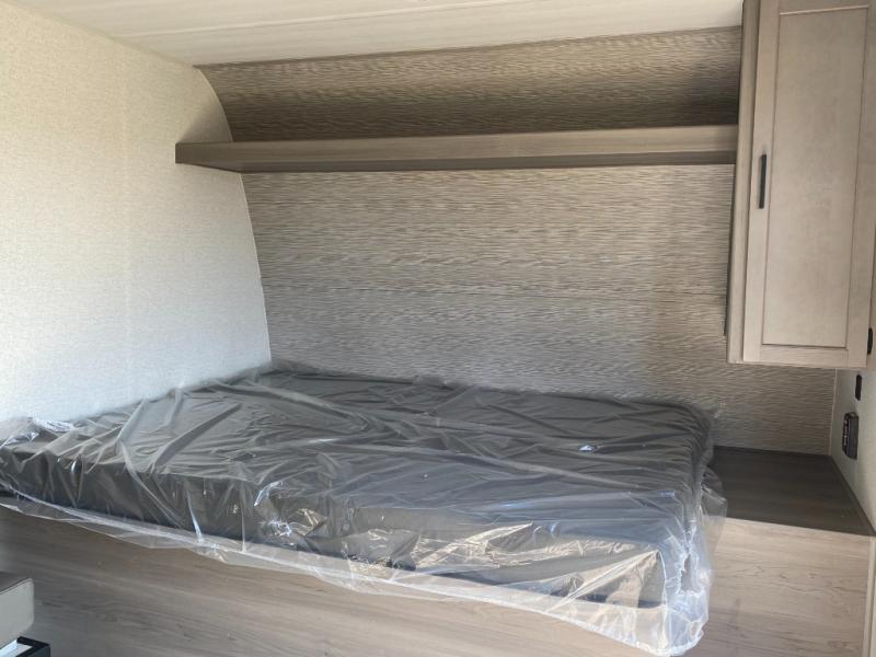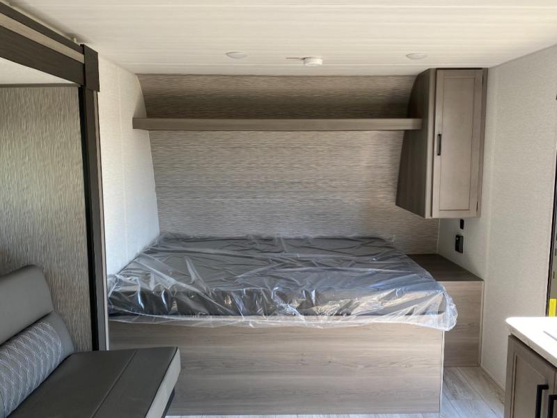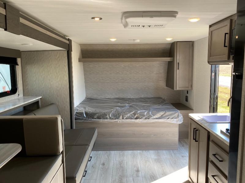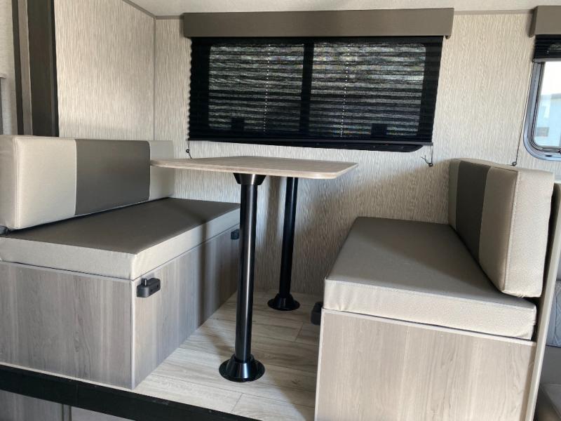 Head to the lake in this spacious trailer that can sleep five to six each night. There is a front queen bed for you, plus a sofa and booth dinette within the large slide out that doubles as seating and sleeping space. You will also find storage drawers below, and there is a pantry and closet along the rear wall for all your goodies and such. The cook will love the galley kitchen with a two burner cooktop and a 7.7 cu. ft. refrigerator for food storage. The TV prep means you can bring along your television for movie nights, and the countertop behind the sofa provides more space for belongings!