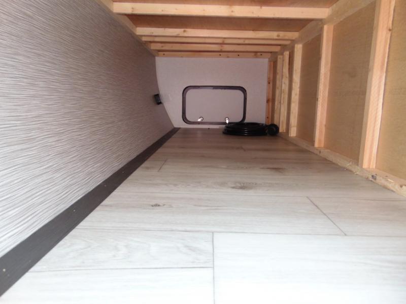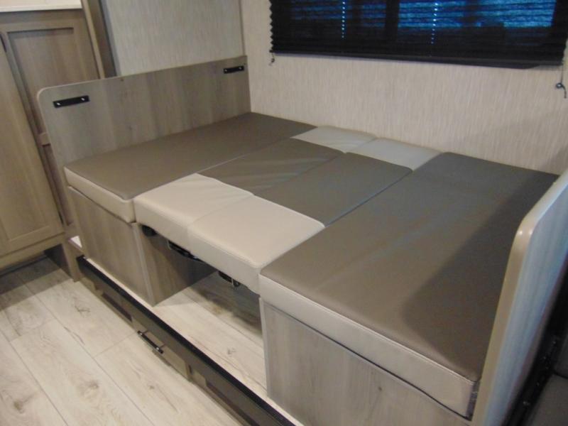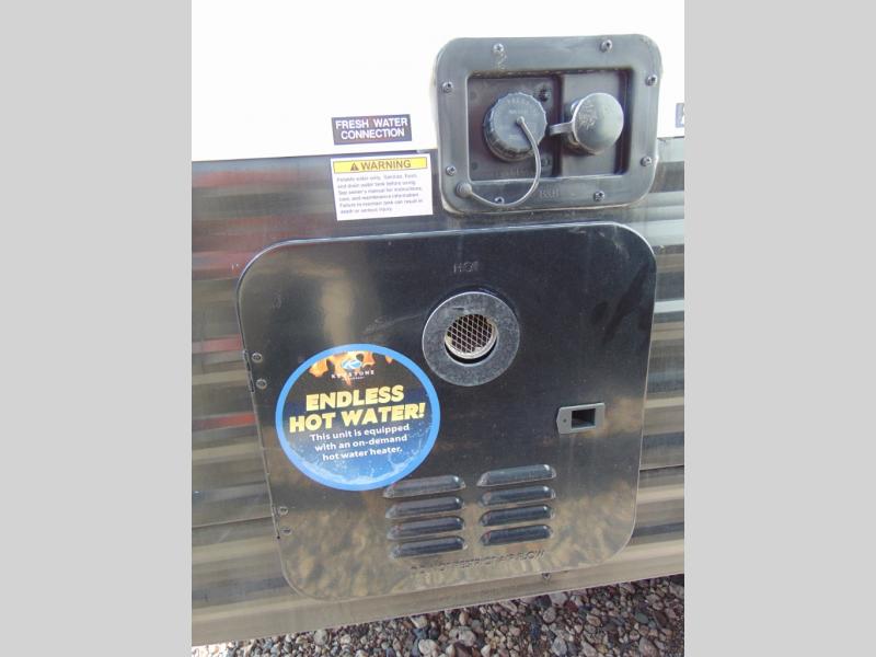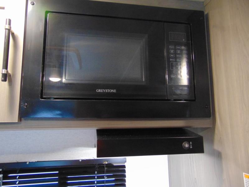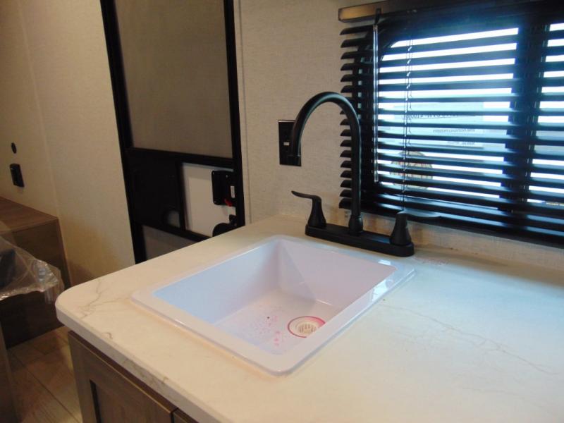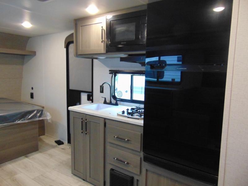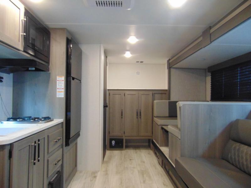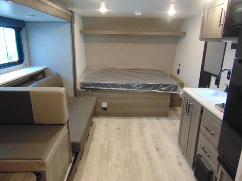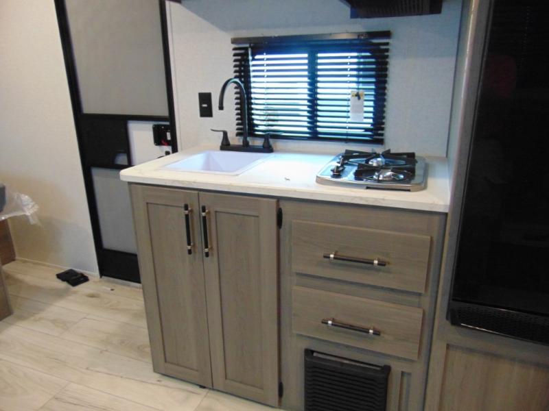 Head to the lake in this spacious trailer that can sleep five to six each night. There is a front queen bed for you, plus a sofa and booth dinette within the large slide out that doubles as seating and sleeping space. You will also find storage drawers below, and there is a pantry and closet along the rear wall for all your goodies and such. The cook will love the galley kitchen with a two burner cooktop and a 7.7 cu. ft. refrigerator for food storage. The TV prep means you can bring along your television for movie nights, and the countertop behind the sofa provides more space for belongings!