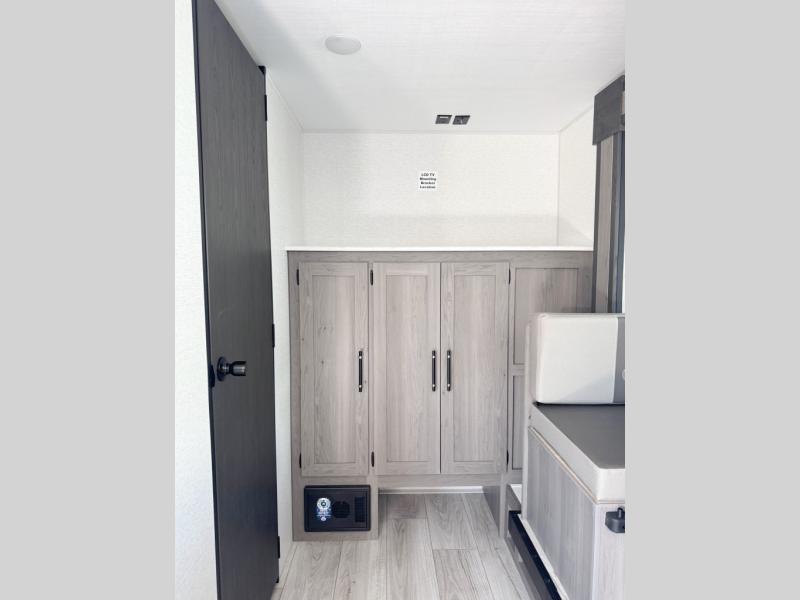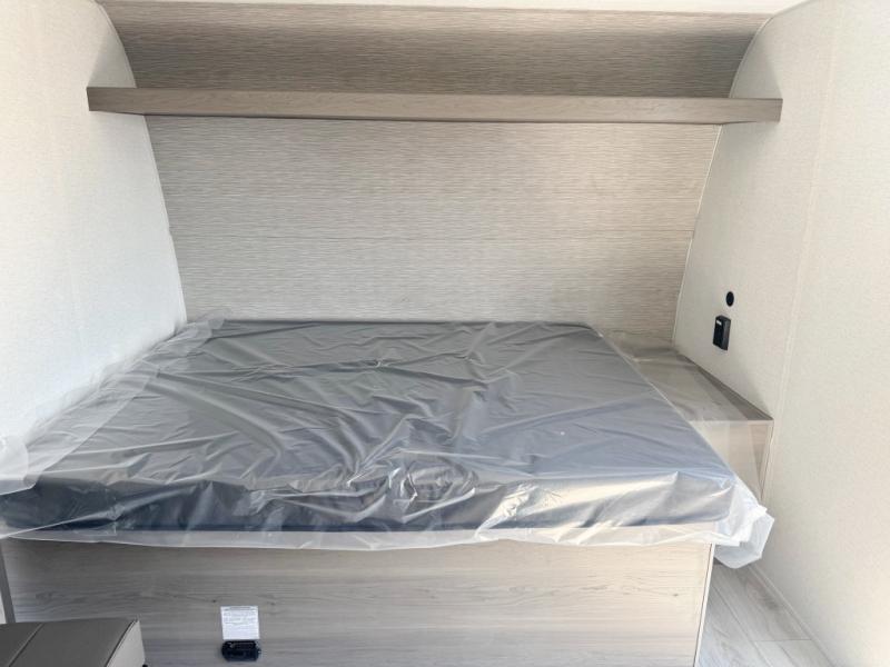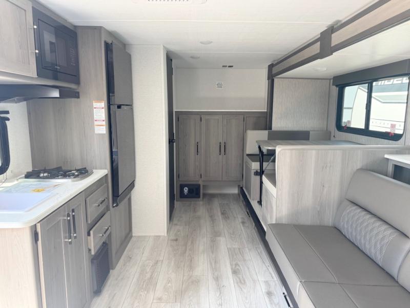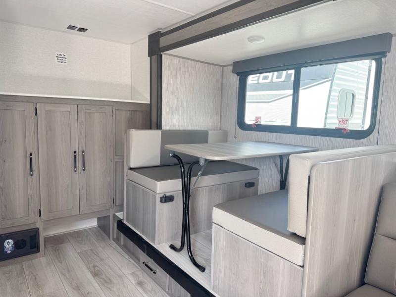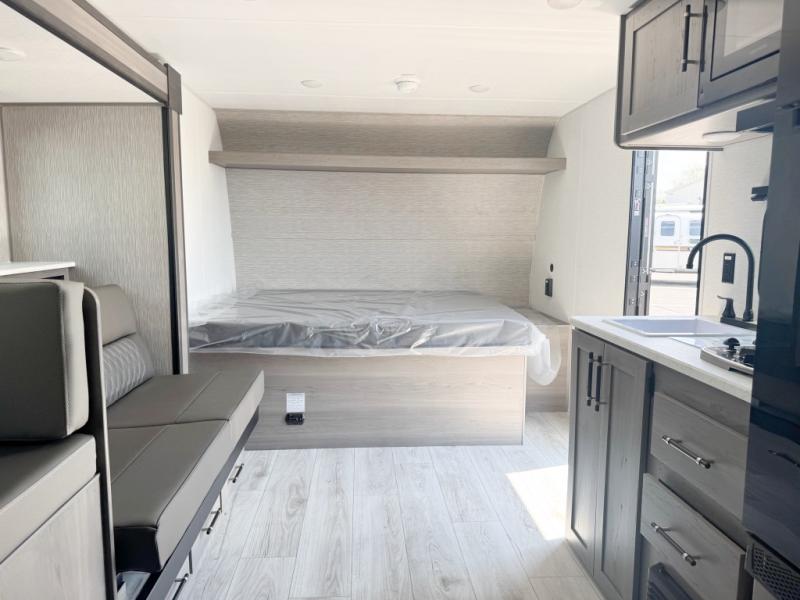 Head to the lake in this spacious trailer that can sleep five to six each night. There is a front queen bed for you, plus a sofa and booth dinette within the large slide out that doubles as seating and sleeping space. You will also find storage drawers below, and there is a pantry and closet along the rear wall for all your goodies and such. The cook will love the galley kitchen with a two burner cooktop and a 7.7 cu. ft. refrigerator for food storage. The TV prep means you can bring along your television for movie nights, and the countertop behind the sofa provides more space for belongings!