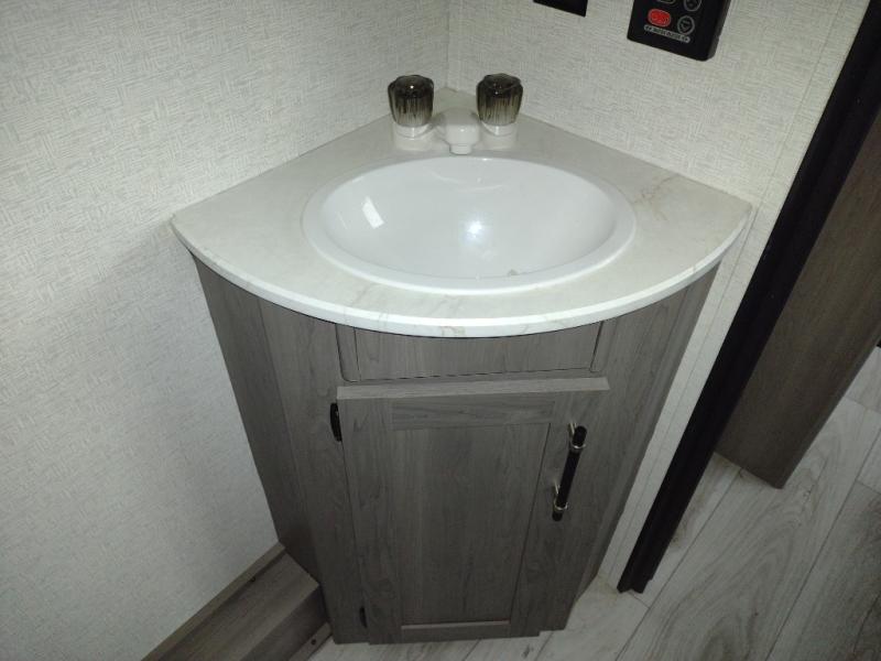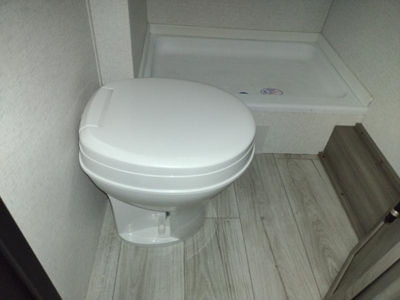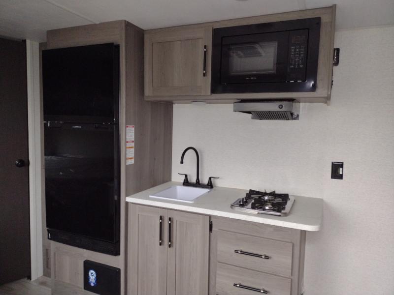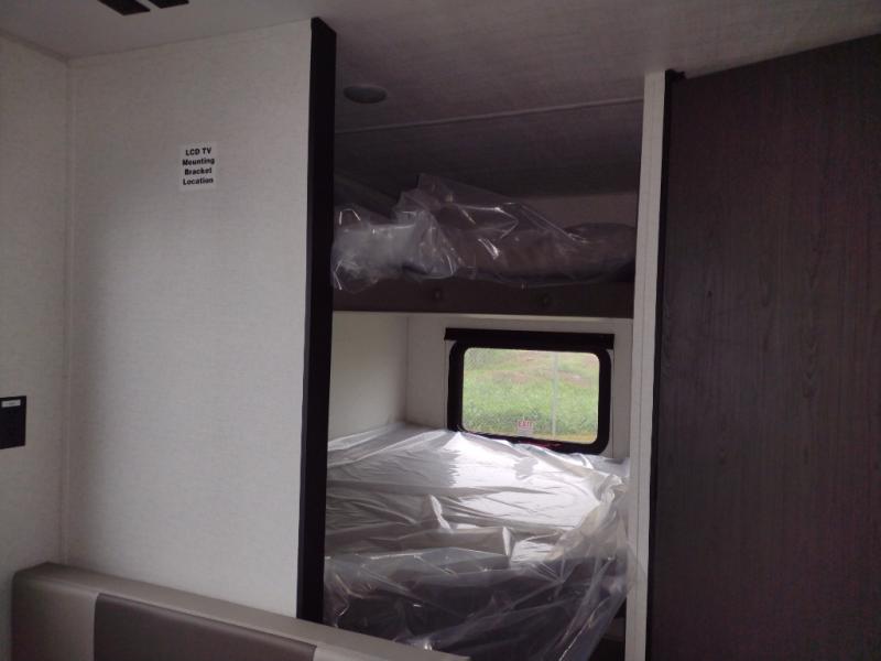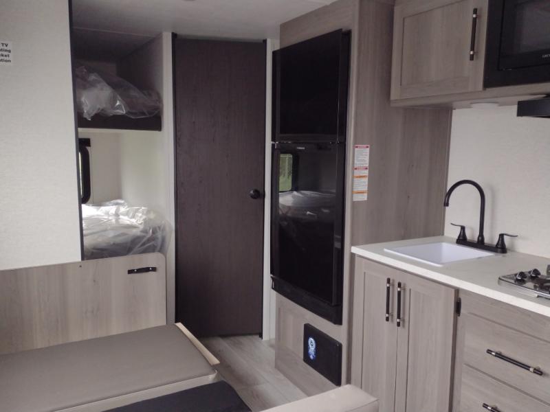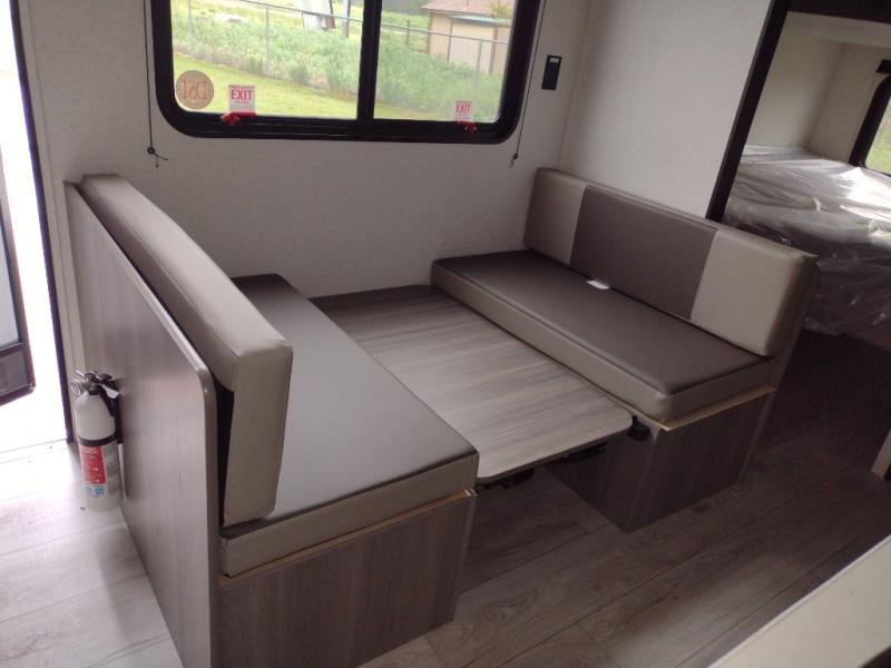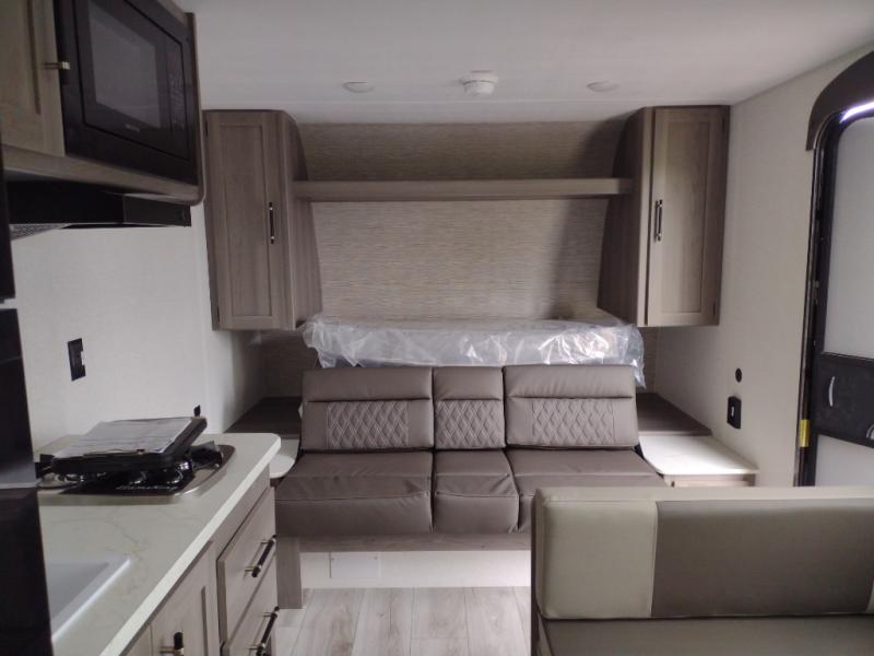 You'll love how versatile this travel trailer is since you can sleep on the Murphy bed at night and enjoy the fold-down sofa during the day! There are dual wardrobes and nightstands on either side of the bed for your things, and larger camp gear can go outside in the pass-thru storage. A full kitchen with a two burner cooktop and 7.7 cu. ft. 12V refrigerator will let the chef whip up their best meals, and the booth dinette will provide a place to dine at. This model also includes double-size bunks and and a full bath right next to the bunks for easy nighttime use!