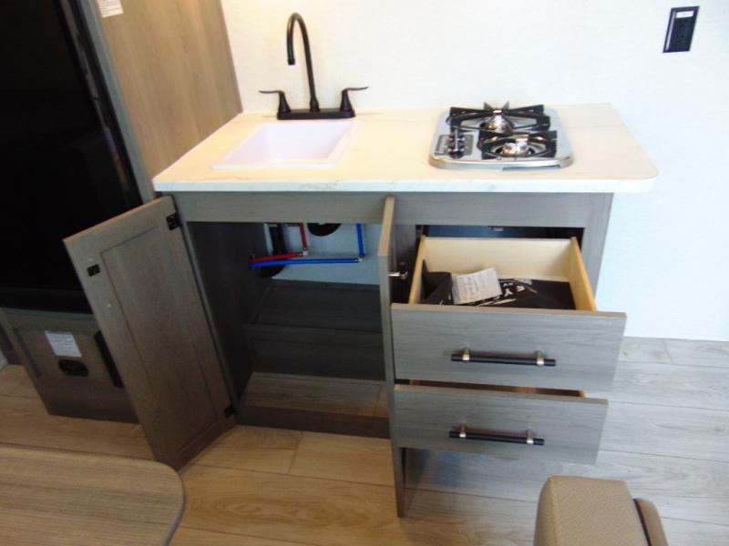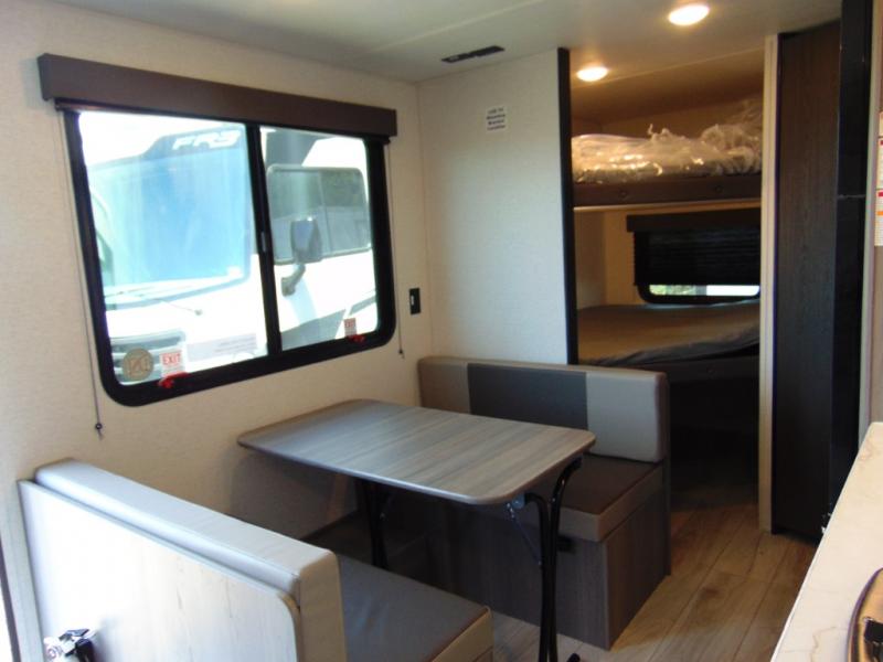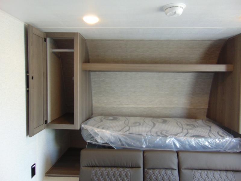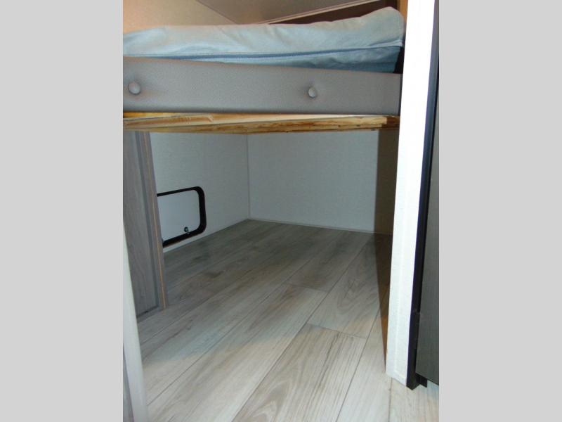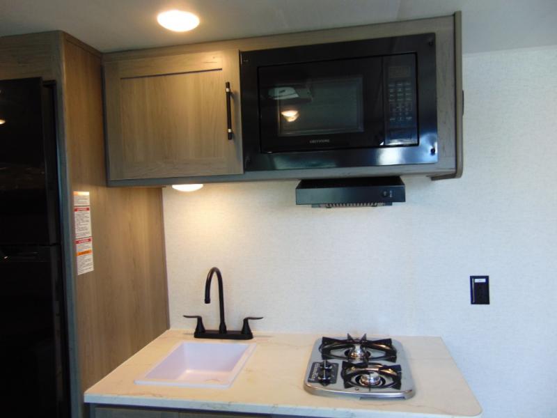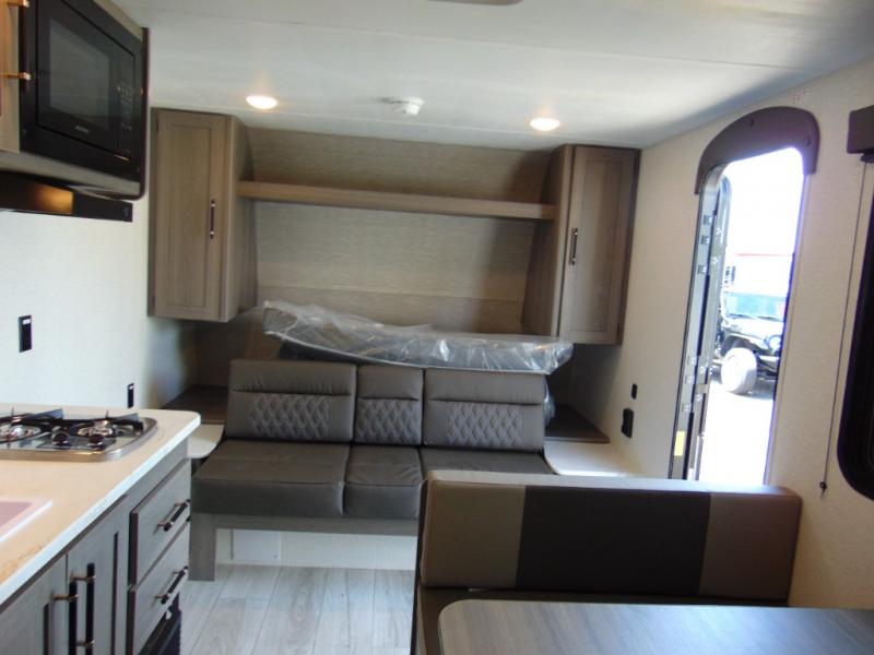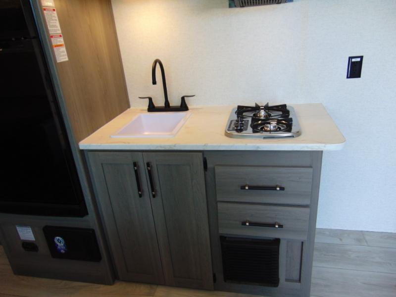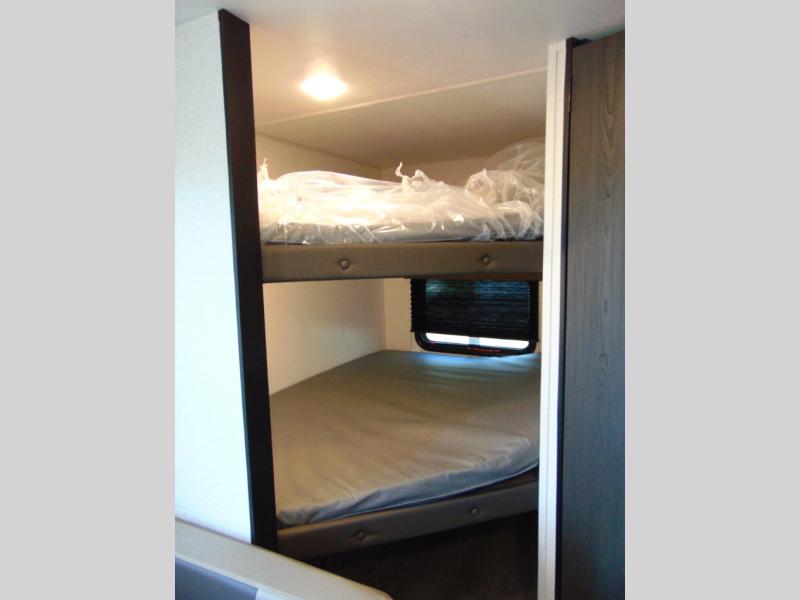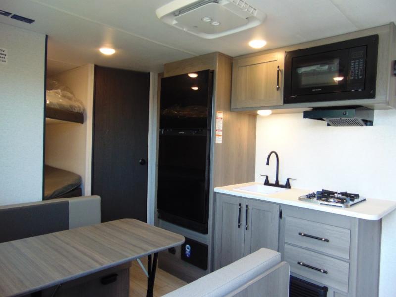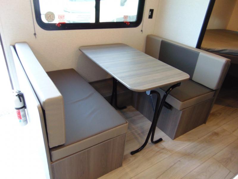 You'll love how versatile this travel trailer is since you can sleep on the Murphy bed at night and enjoy the fold-down sofa during the day! There are dual wardrobes and nightstands on either side of the bed for your things, and larger camp gear can go outside in the pass-thru storage. A full kitchen with a two burner cooktop and 7.7 cu. ft. 12V refrigerator will let the chef whip up their best meals, and the booth dinette will provide a place to dine at. This model also includes double-size bunks and and a full bath right next to the bunks for easy nighttime use!