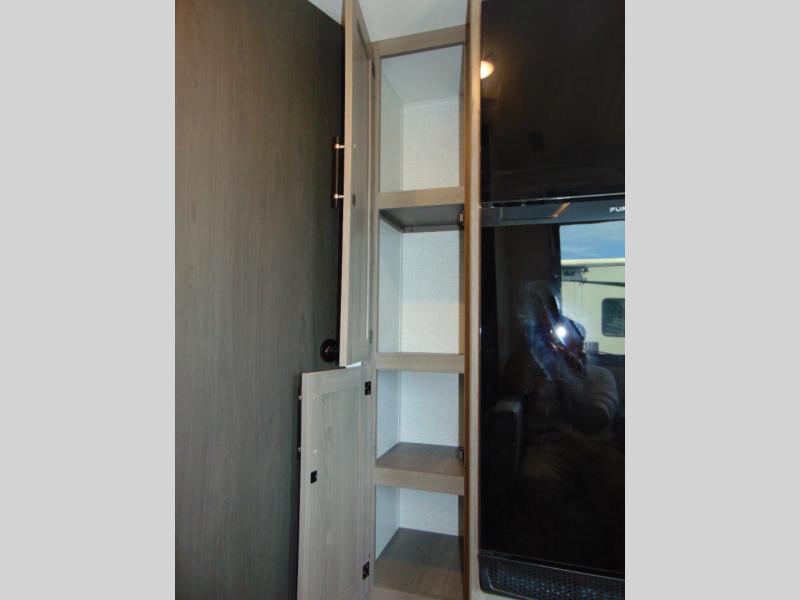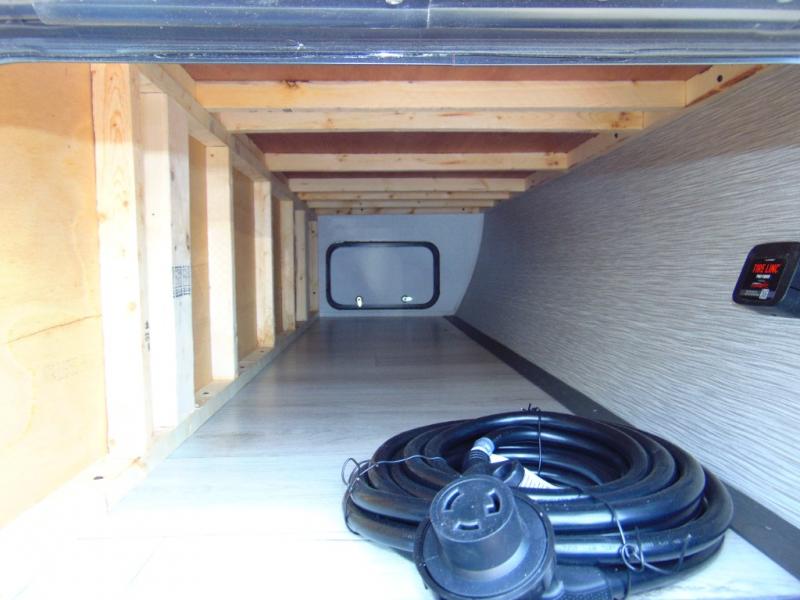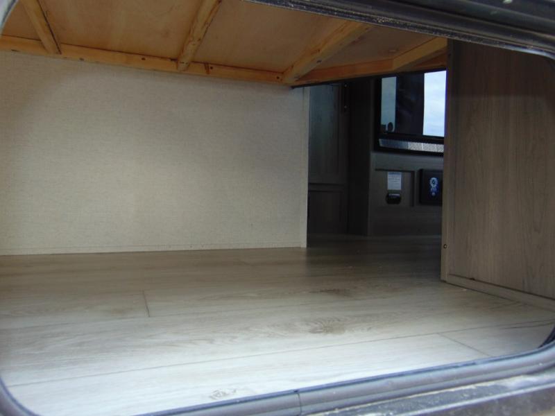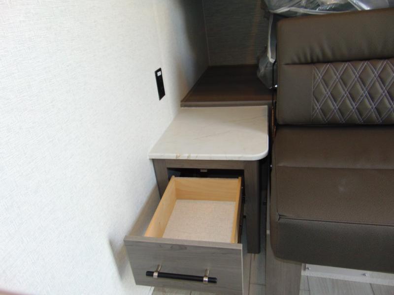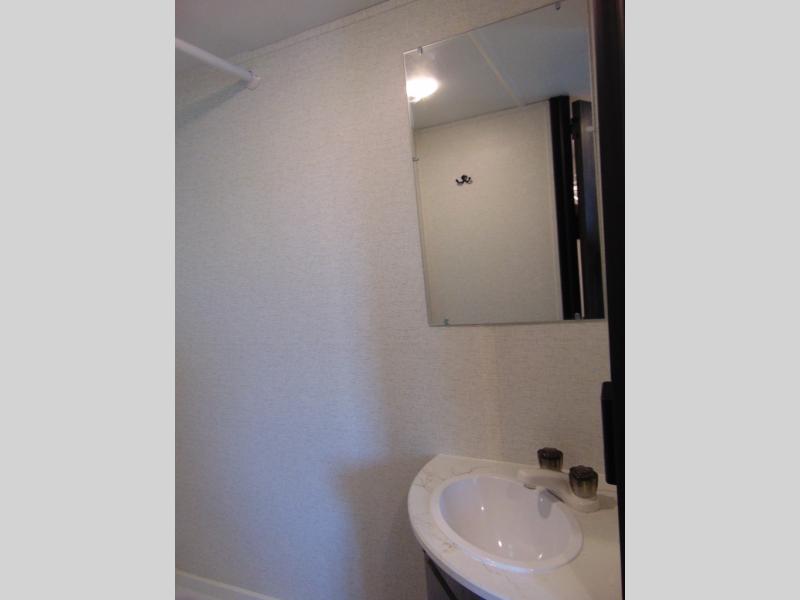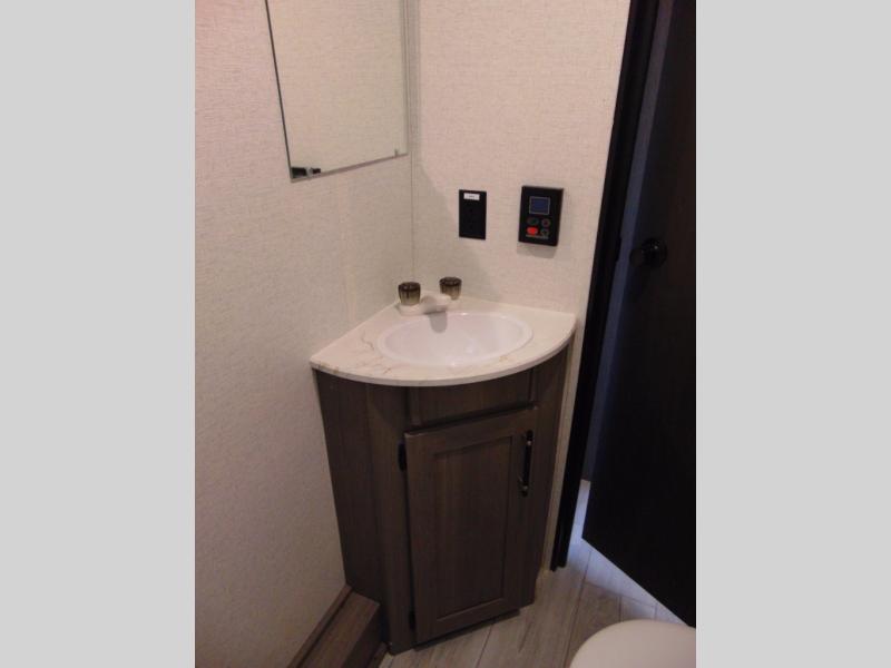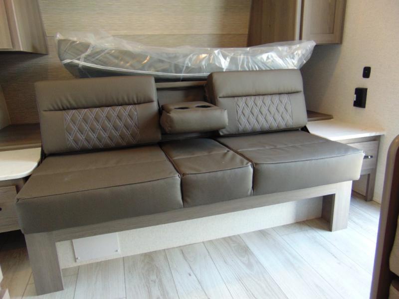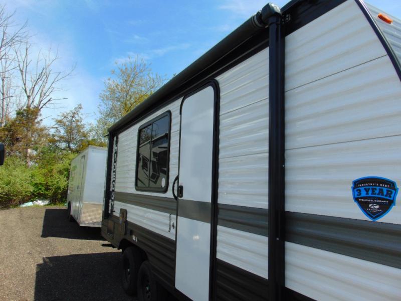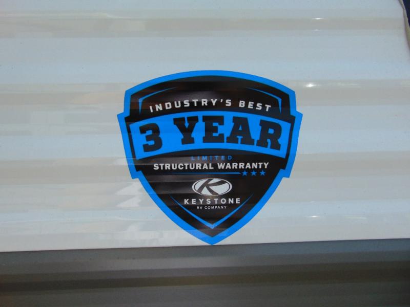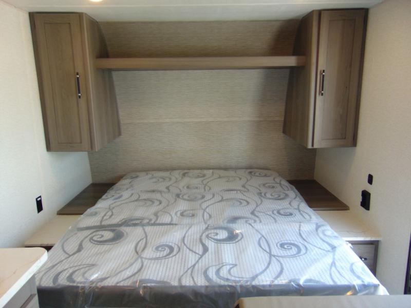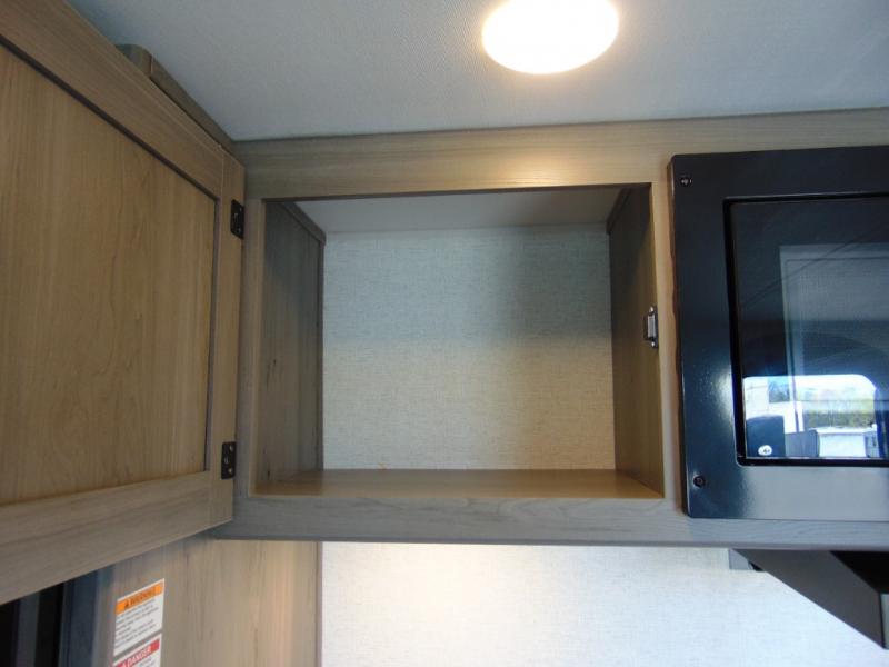 You'll love how versatile this travel trailer is since you can sleep on the Murphy bed at night and enjoy the fold-down sofa during the day! There are dual wardrobes and nightstands on either side of the bed for your things, and larger camp gear can go outside in the pass-thru storage. A full kitchen with a two burner cooktop and 7.7 cu. ft. 12V refrigerator will let the chef whip up their best meals, and the booth dinette will provide a place to dine at. This model also includes double-size bunks and and a full bath right next to the bunks for easy nighttime use!