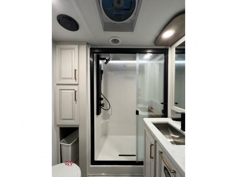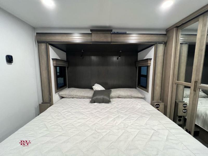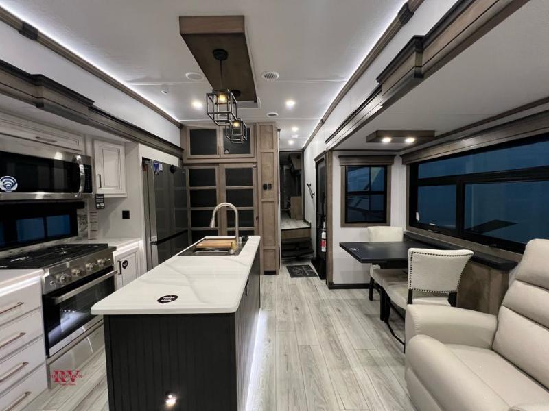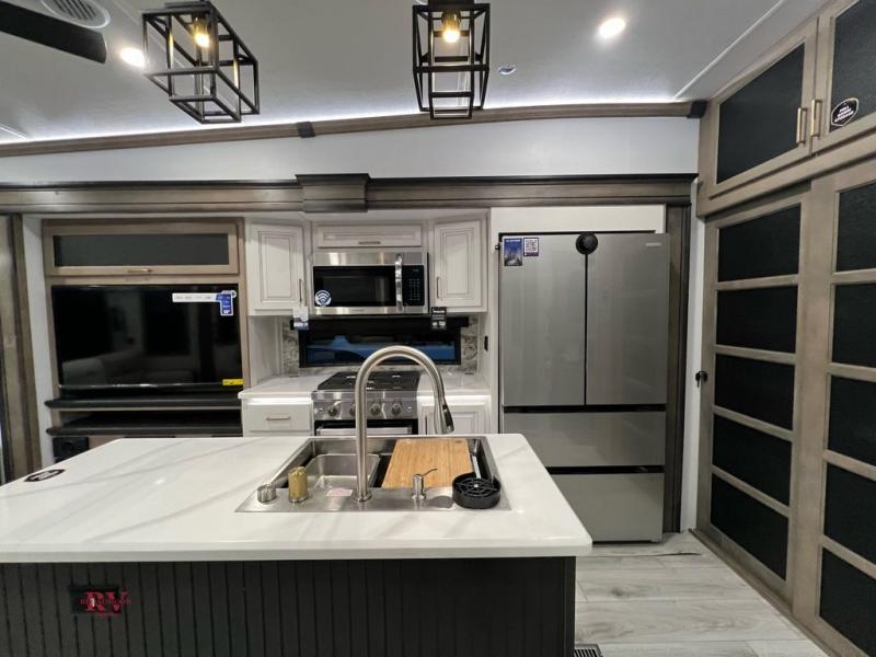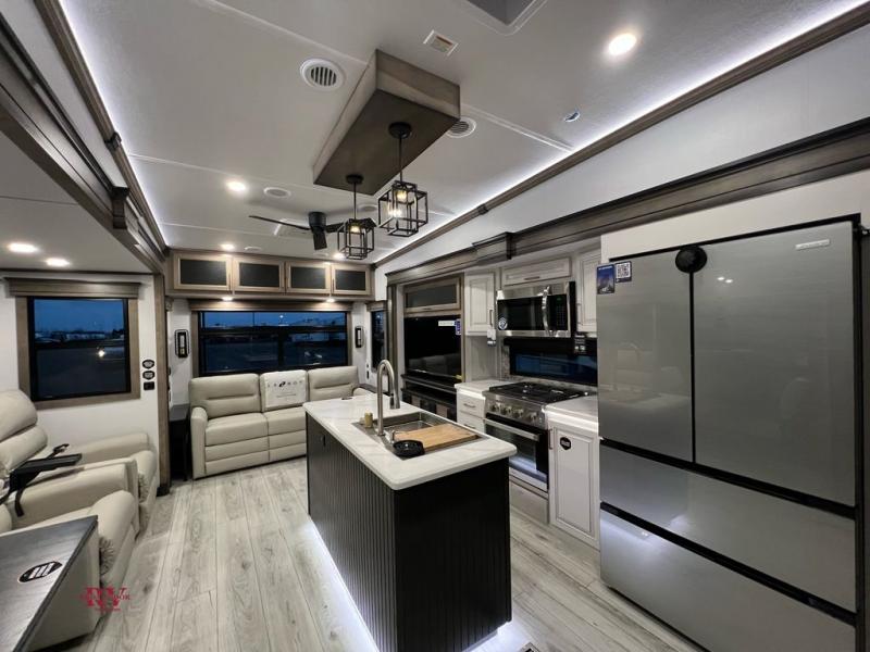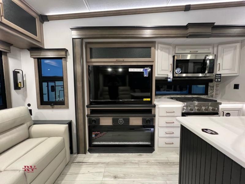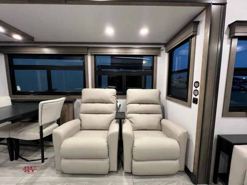 Luxury abounds throughout this fifth wheel! Starting in the kitchen with the island, floor to ceiling pantry with shelves, 24" range, and residential convection microwave. The full bathroom has a 48" x 30" fiberglass shower with a seat, decorative glass enclosure, and a skylight above it for more natural lighting. Sleep like a baby in the front private bedroom on the king bed slide with storage underneath and keep your clothes looking their best with the front closet that has a clothing hamper and stackable washer and dryer prep. The rear living area offers true relaxation with a hide-a-bed sofa and power Thomas Payne theater seating across from the entertainment center with a 5,000 BTU decorative fireplace heater and 50" Smart TV to watch your favorite movies!