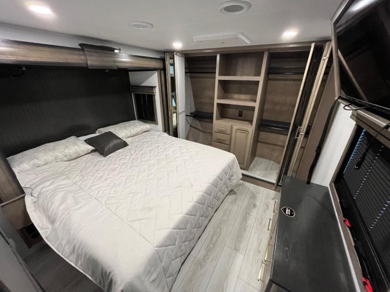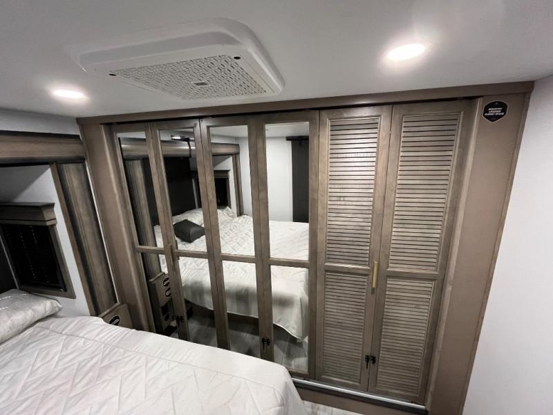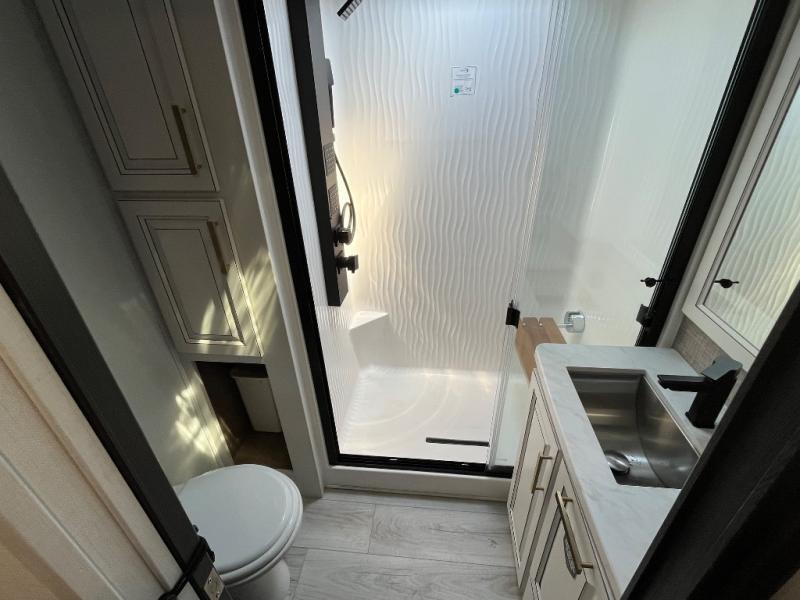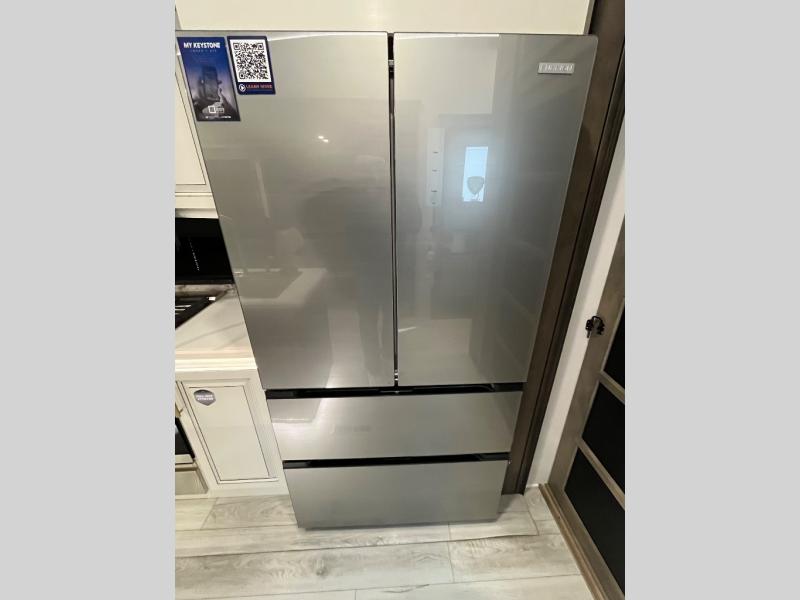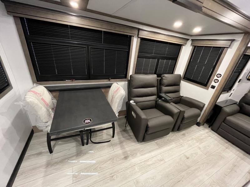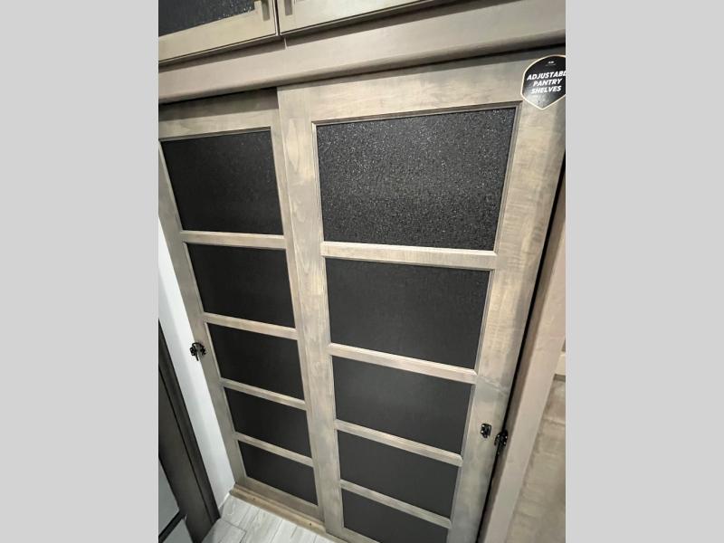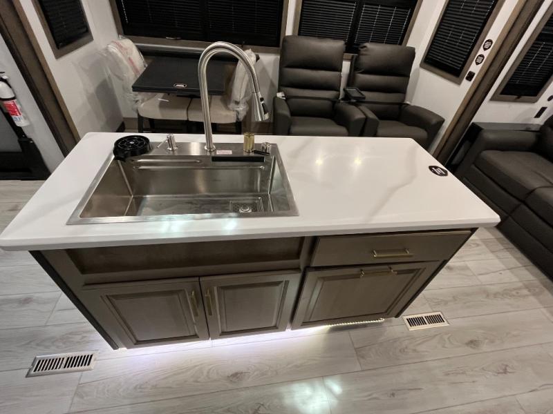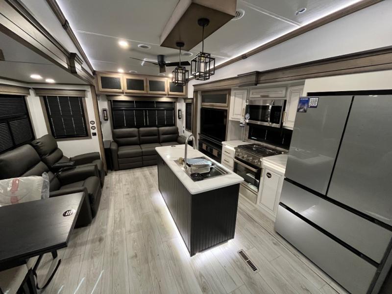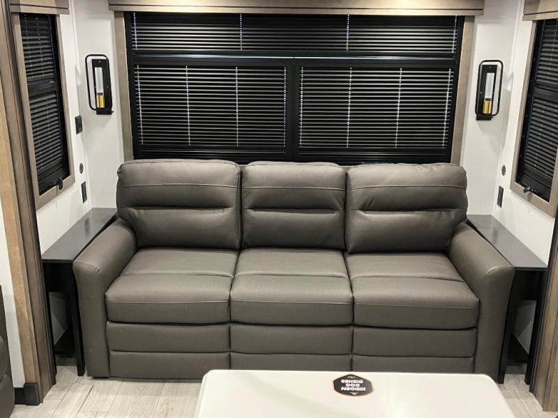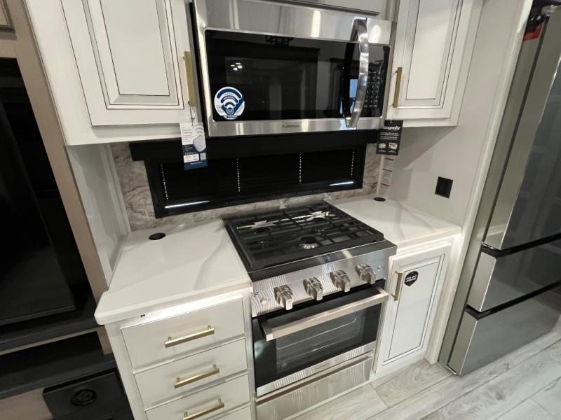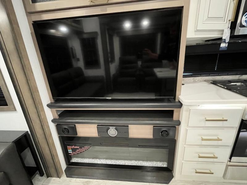 Luxury abounds throughout this fifth wheel! Starting in the kitchen with the island, floor to ceiling pantry with shelves, 24" range, and residential convection microwave. The full bathroom has a 48" x 30" fiberglass shower with a seat, decorative glass enclosure, and a skylight above it for more natural lighting. Sleep like a baby in the front private bedroom on the king bed slide with storage underneath and keep your clothes looking their best with the front closet that has a clothing hamper and stackable washer and dryer prep. The rear living area offers true relaxation with a hide-a-bed sofa and power theater seating across from the entertainment center with a 5,000 BTU decorative fireplace heater and 50" Smart TV to watch your favorite movies!