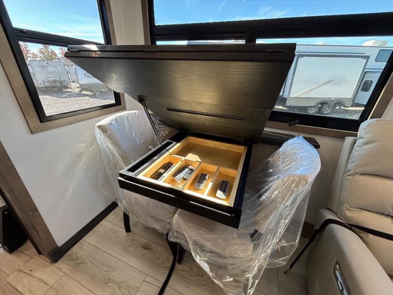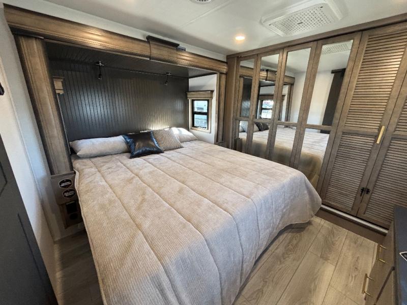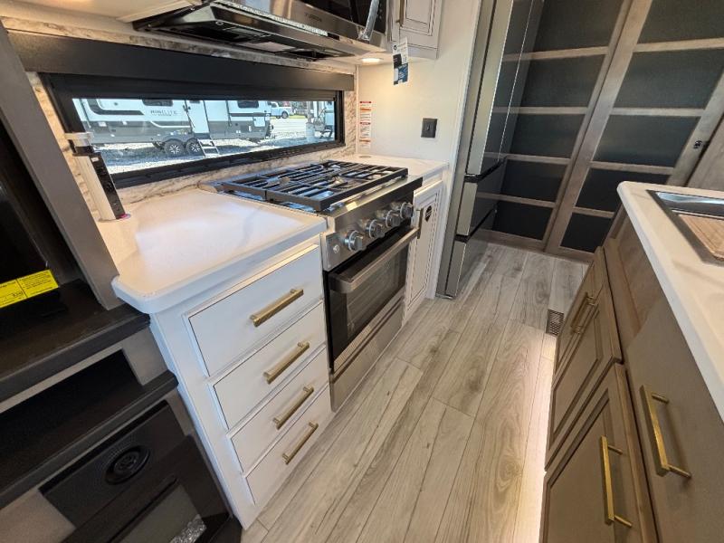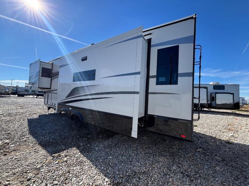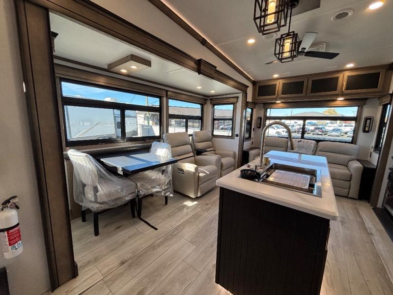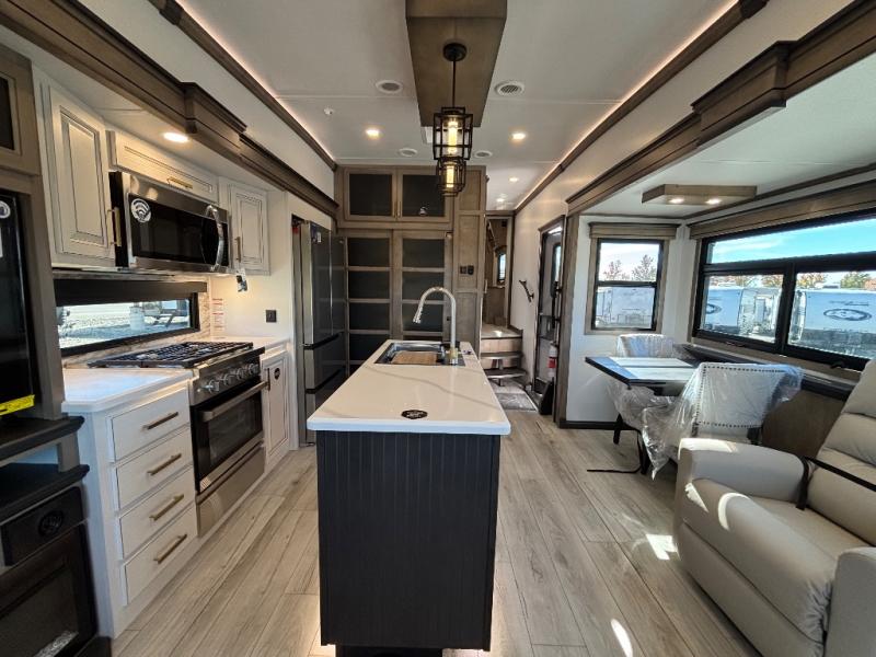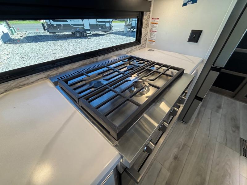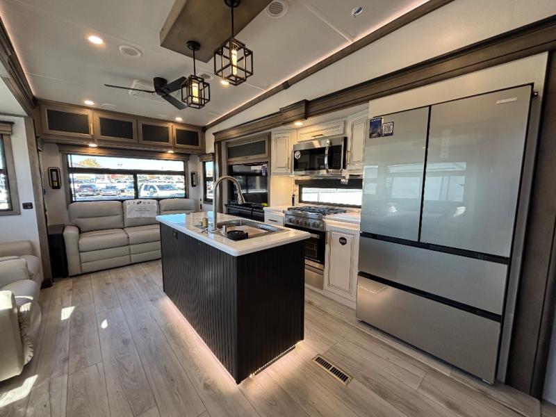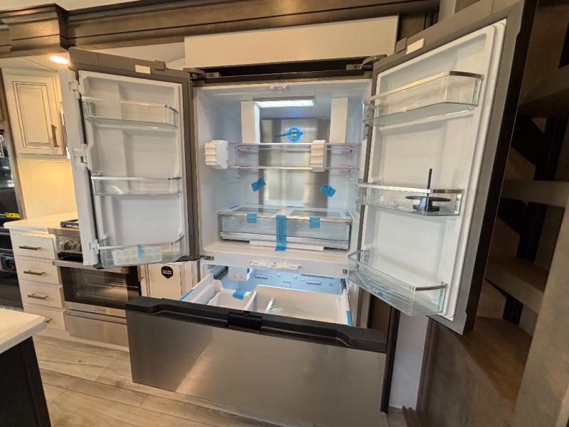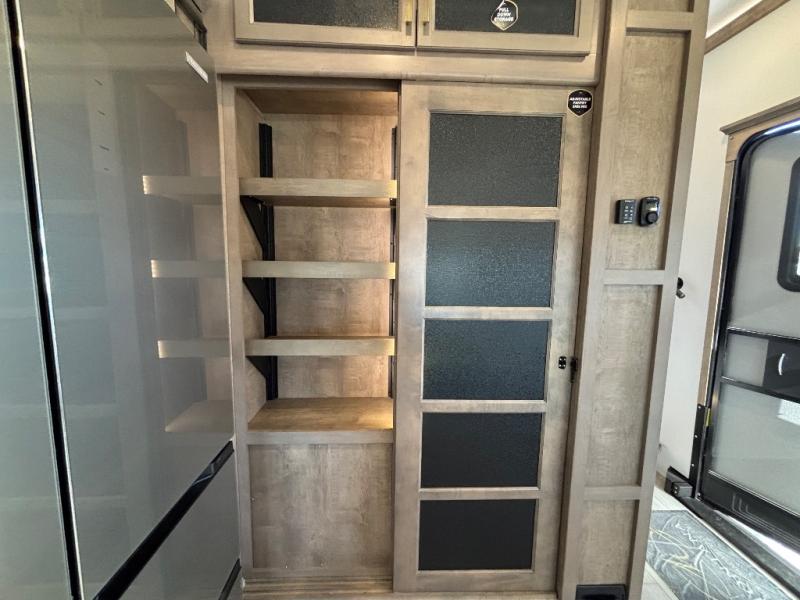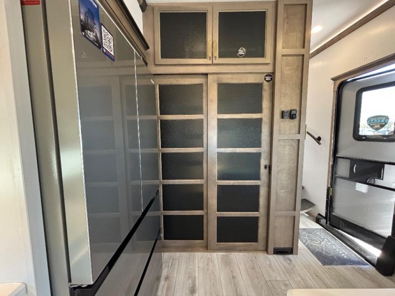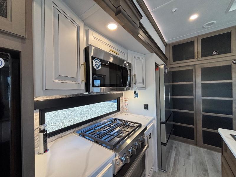 Luxury abounds throughout this fifth wheel! Starting in the kitchen with the island, floor to ceiling pantry with shelves, 24" range, and residential convection microwave. The full bathroom has a 48" x 30" fiberglass shower with a seat, decorative glass enclosure, and a skylight above it for more natural lighting. Sleep like a baby in the front private bedroom on the king bed slide with storage underneath and keep your clothes looking their best with the front closet that has a clothing hamper and stackable washer and dryer prep. The rear living area offers true relaxation with a hide-a-bed sofa and power theater seating across from the entertainment center with a 5,000 BTU decorative fireplace heater and 50" Smart TV to watch your favorite movies!