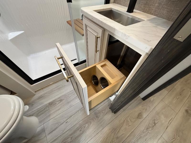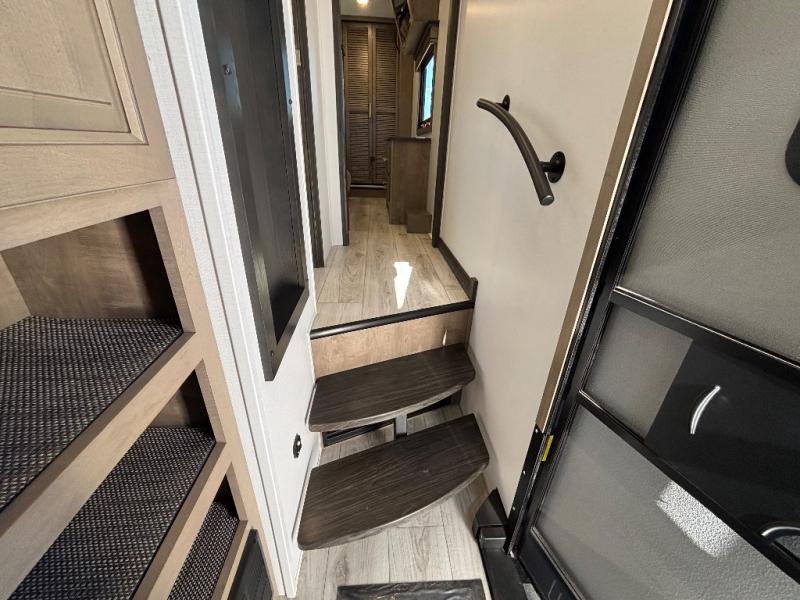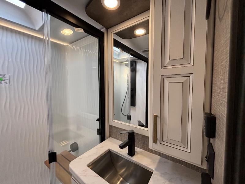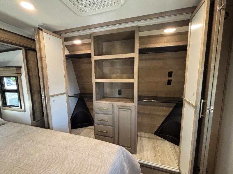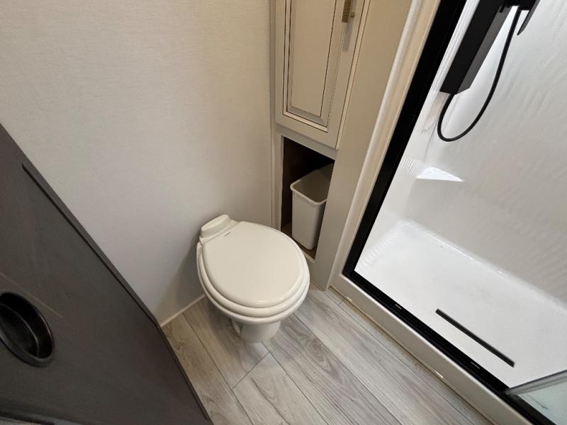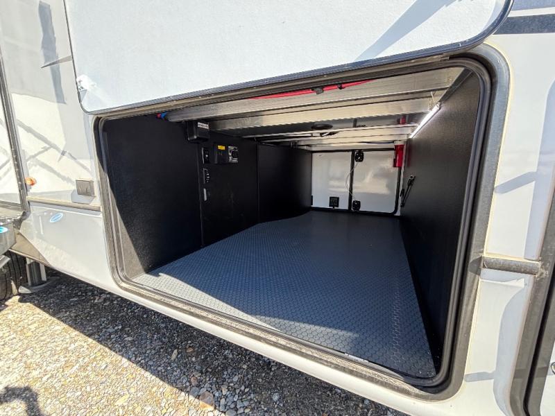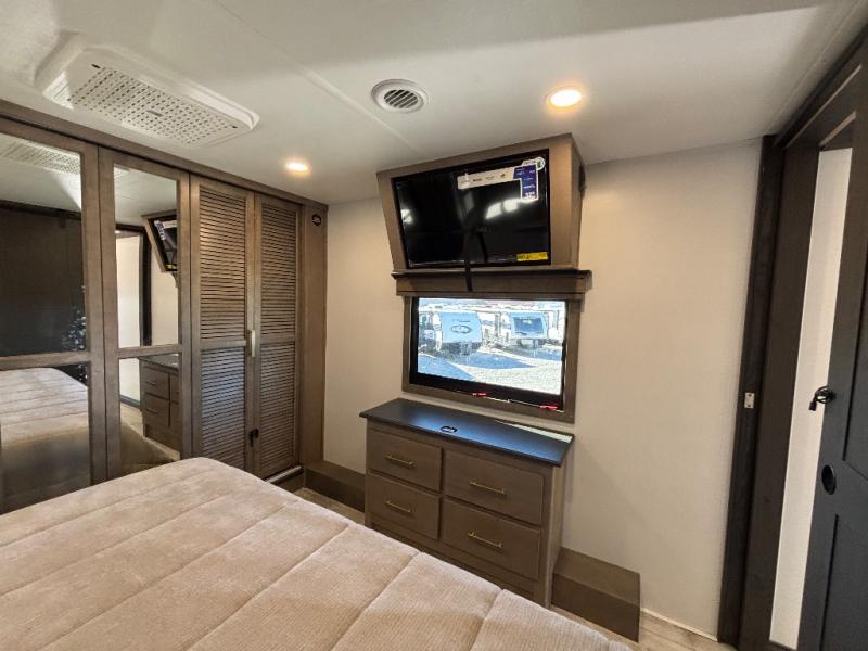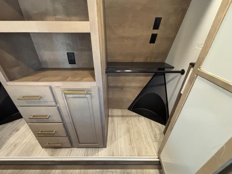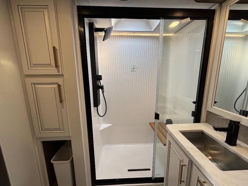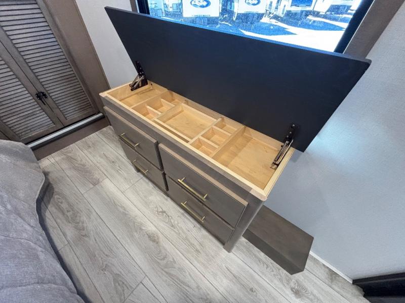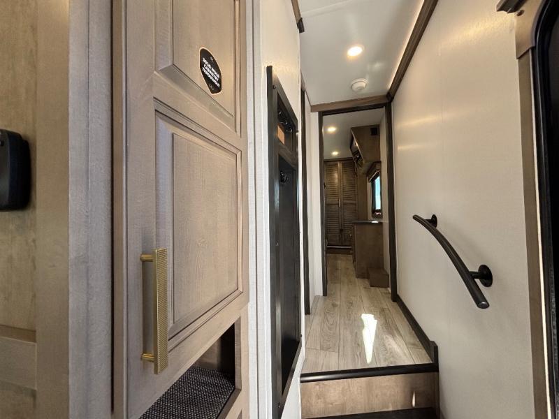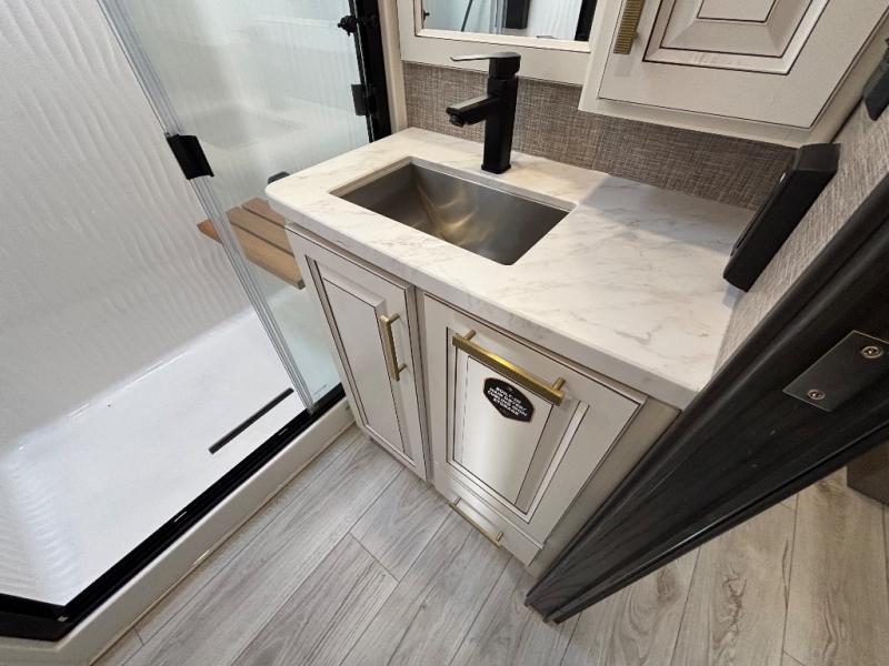 Luxury abounds throughout this fifth wheel! Starting in the kitchen with the island, floor to ceiling pantry with shelves, 24" range, and residential convection microwave. The full bathroom has a 48" x 30" fiberglass shower with a seat, decorative glass enclosure, and a skylight above it for more natural lighting. Sleep like a baby in the front private bedroom on the king bed slide with storage underneath and keep your clothes looking their best with the front closet that has a clothing hamper and stackable washer and dryer prep. The rear living area offers true relaxation with a hide-a-bed sofa and power theater seating across from the entertainment center with a 5,000 BTU decorative fireplace heater and 50" Smart TV to watch your favorite movies!