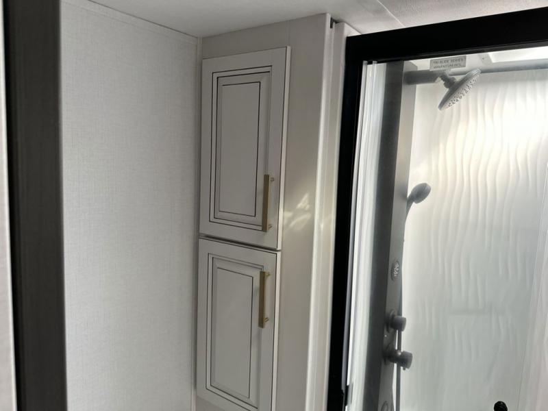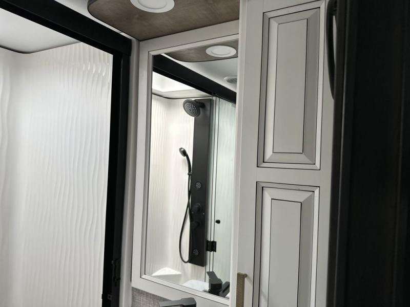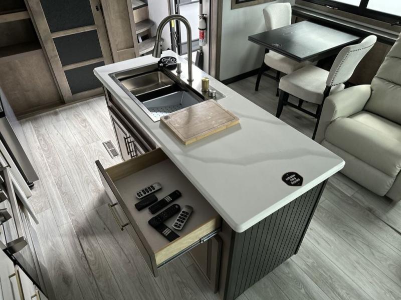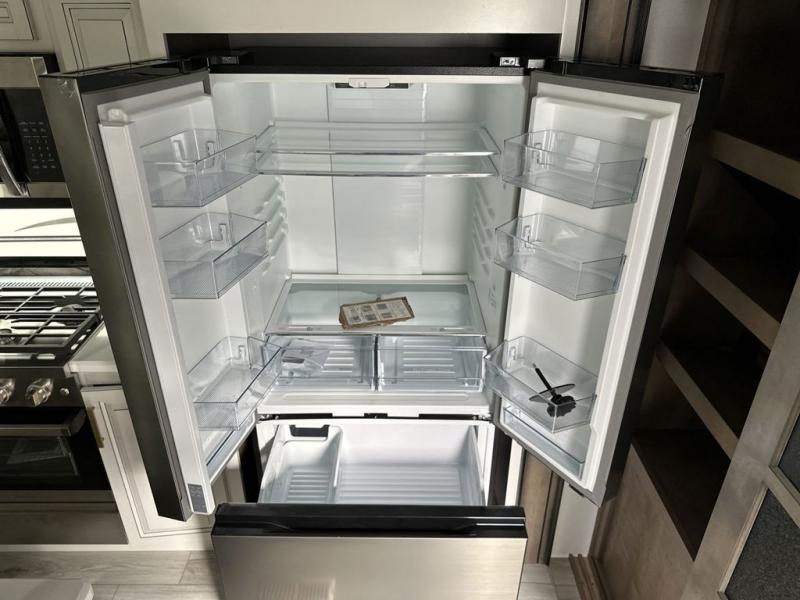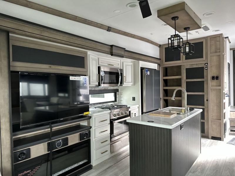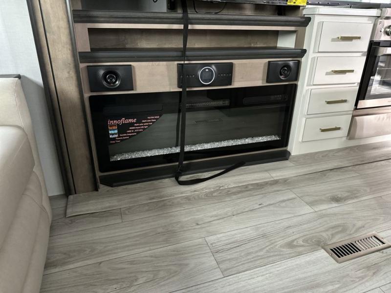Luxury abounds throughout this fifth wheel! Starting in the kitchen with the island, floor to ceiling pantry with shelves, 24" range, and residential convection microwave. The full bathroom has a 48" x 30" fiberglass shower with a seat, decorative glass enclosure, and a skylight above it for more natural lighting. Sleep like a baby in the front private bedroom on the king bed slide with storage underneath and keep your clothes looking their best with the front closet that has a clothing hamper and stackable washer and dryer prep. The rear living area offers true relaxation with a hide-a-bed sofa and power theater seating across from the entertainment center with a 5,000 BTU decorative fireplace heater and 50" Smart TV to watch your favorite movies!