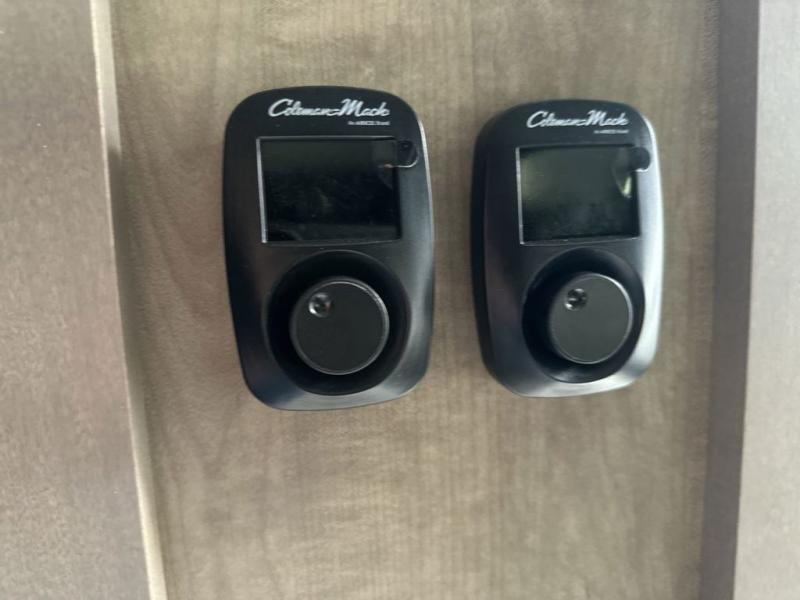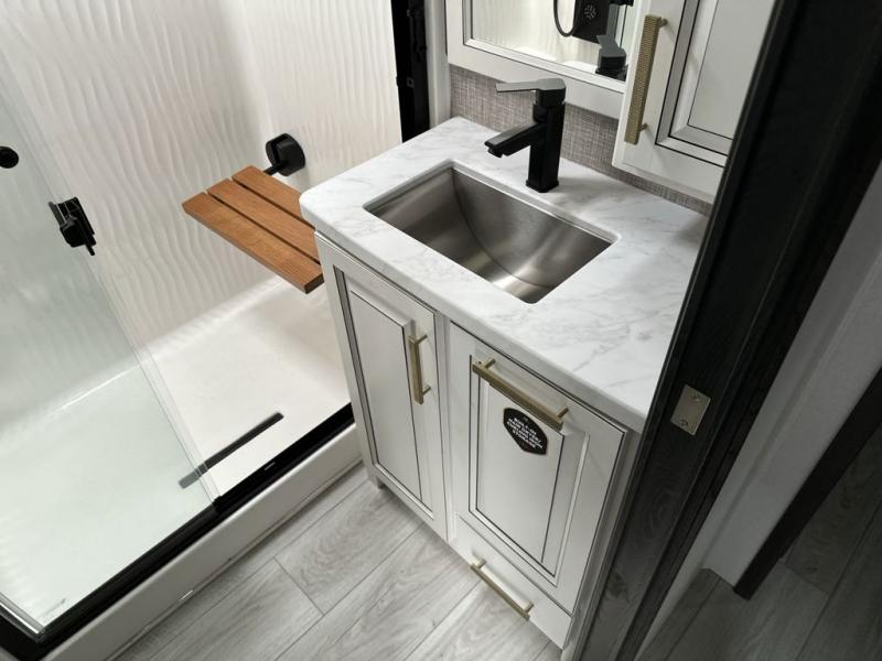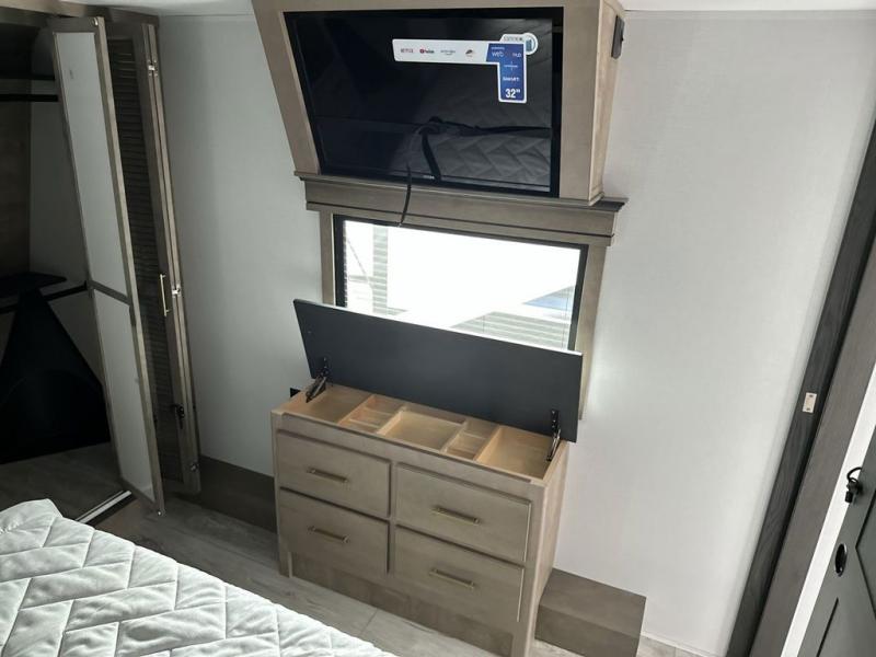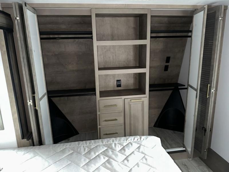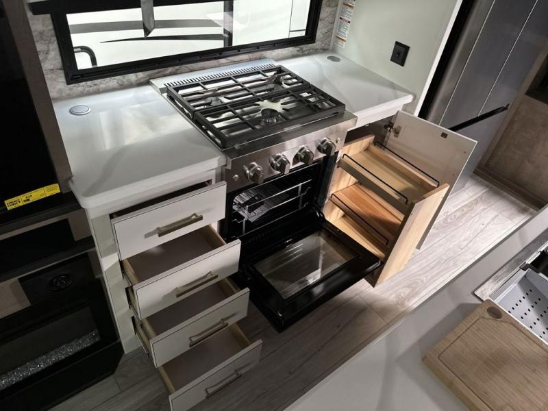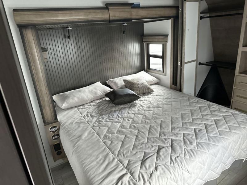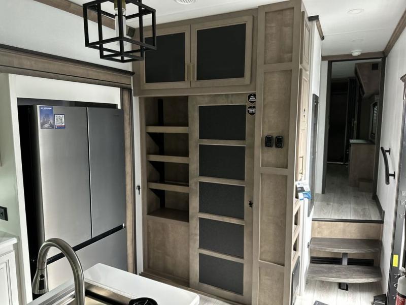 Luxury abounds throughout this fifth wheel! Starting in the kitchen with the island, floor to ceiling pantry with shelves, 24" range, and residential convection microwave. The full bathroom has a 48" x 30" fiberglass shower with a seat, decorative glass enclosure, and a skylight above it for more natural lighting. Sleep like a baby in the front private bedroom on the king bed slide with storage underneath and keep your clothes looking their best with the front closet that has a clothing hamper and stackable washer and dryer prep. The rear living area offers true relaxation with a hide-a-bed sofa and power theater seating across from the entertainment center with a 5,000 BTU decorative fireplace heater and 50" Smart TV to watch your favorite movies!