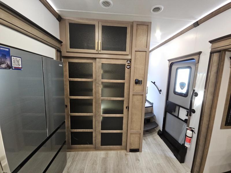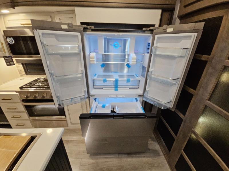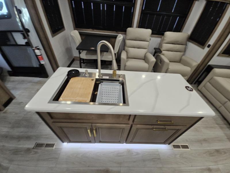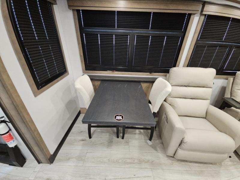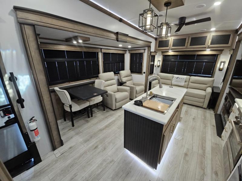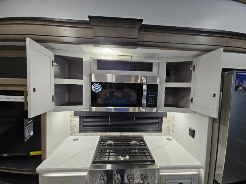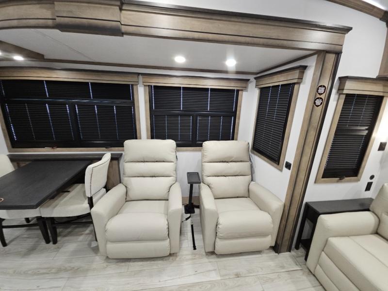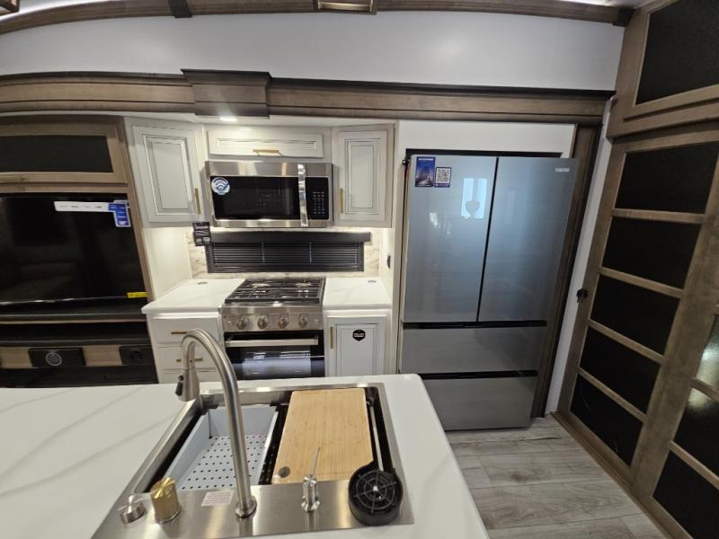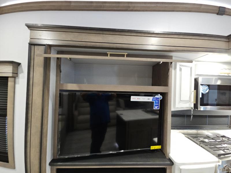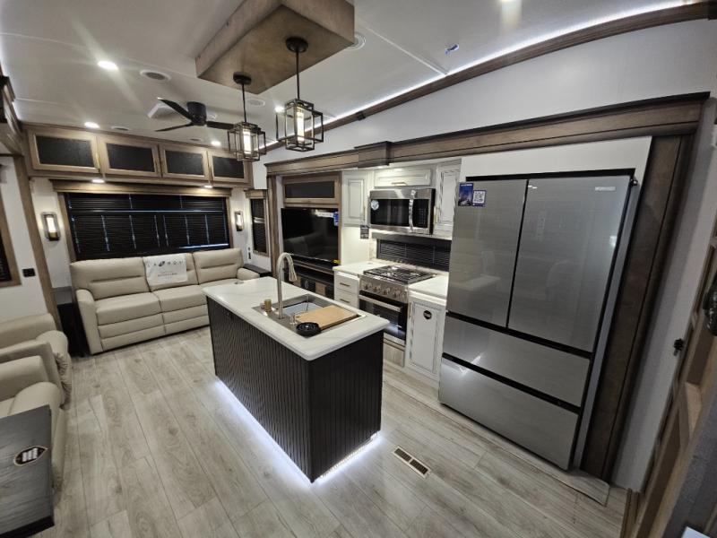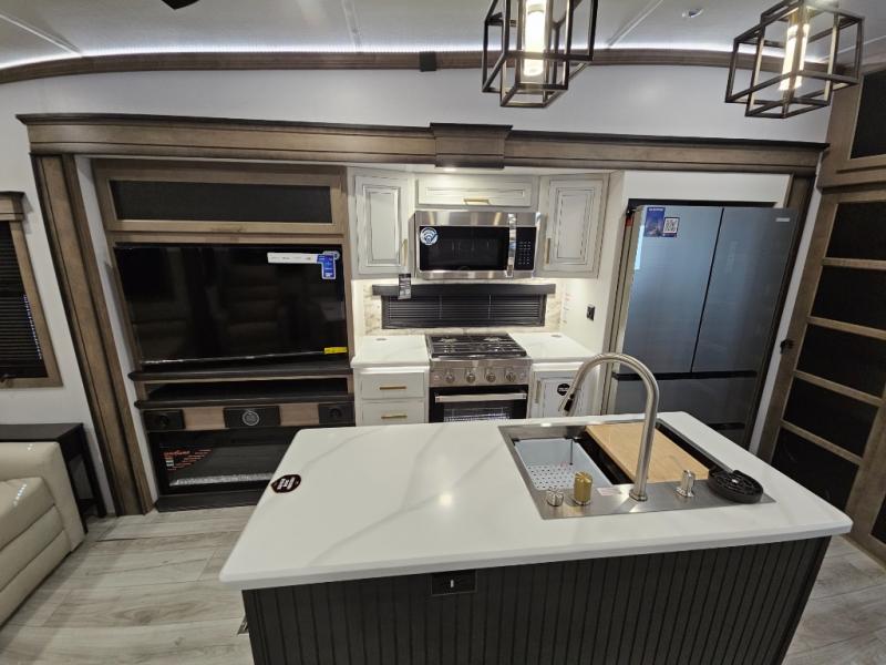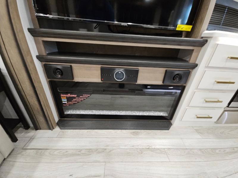 Luxury abounds throughout this fifth wheel! Starting in the kitchen with the island, floor to ceiling pantry with shelves, 24" range, and residential convection microwave. The full bathroom has a 48" x 30" fiberglass shower with a seat, decorative glass enclosure, and a skylight above it for more natural lighting. Sleep like a baby in the front private bedroom on the king bed slide with storage underneath and keep your clothes looking their best with the front closet that has a clothing hamper and stackable washer and dryer prep. The rear living area offers true relaxation with a hide-a-bed sofa and power theater seating across from the entertainment center with a 5,000 BTU decorative fireplace heater and 50" Smart TV to watch your favorite movies!