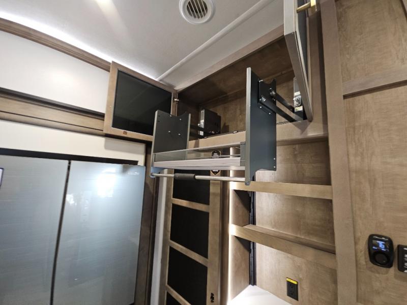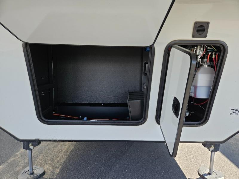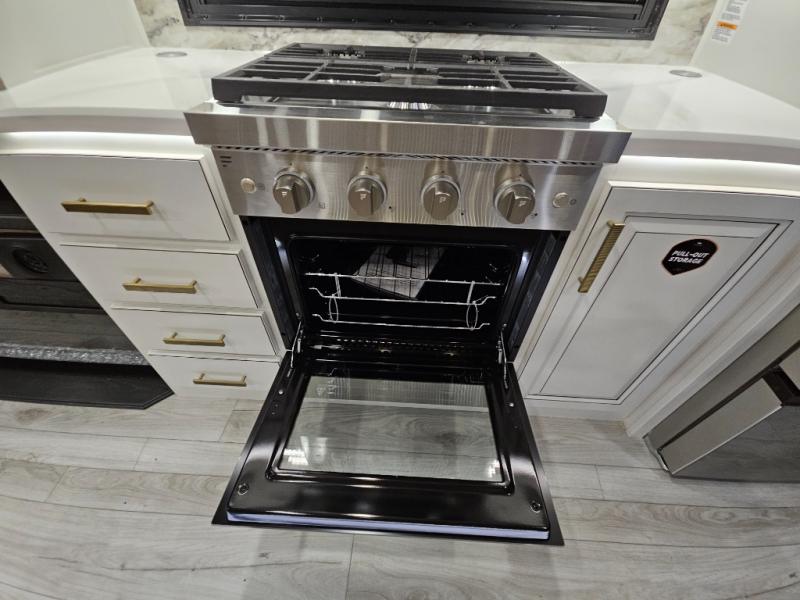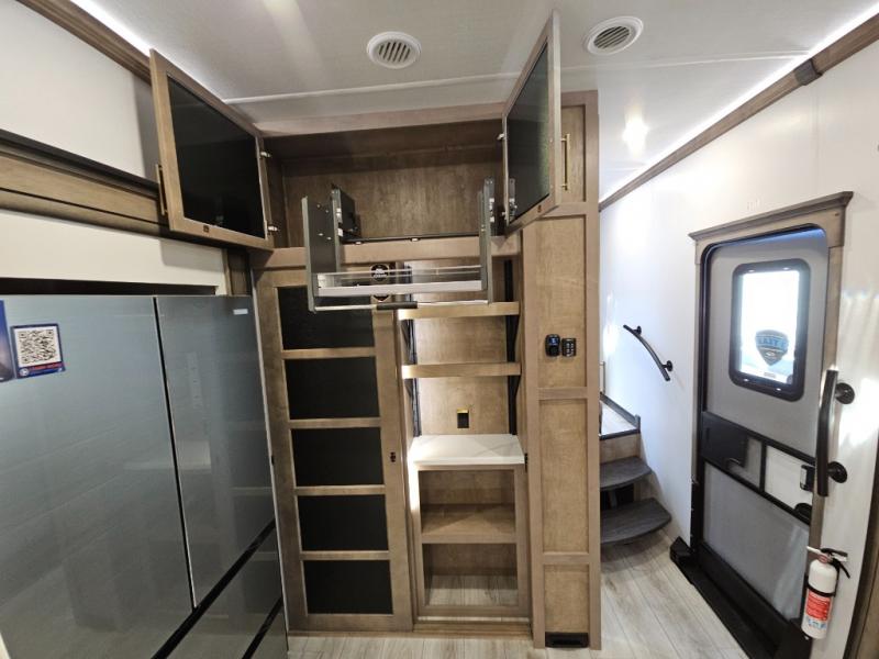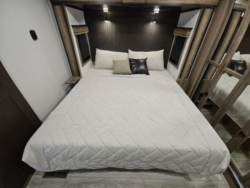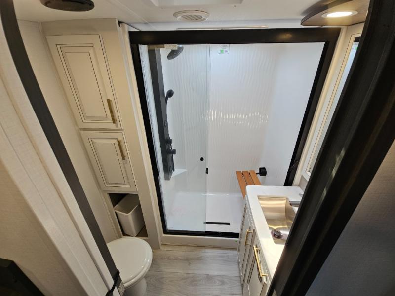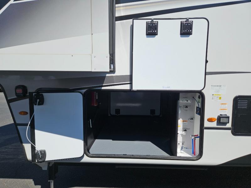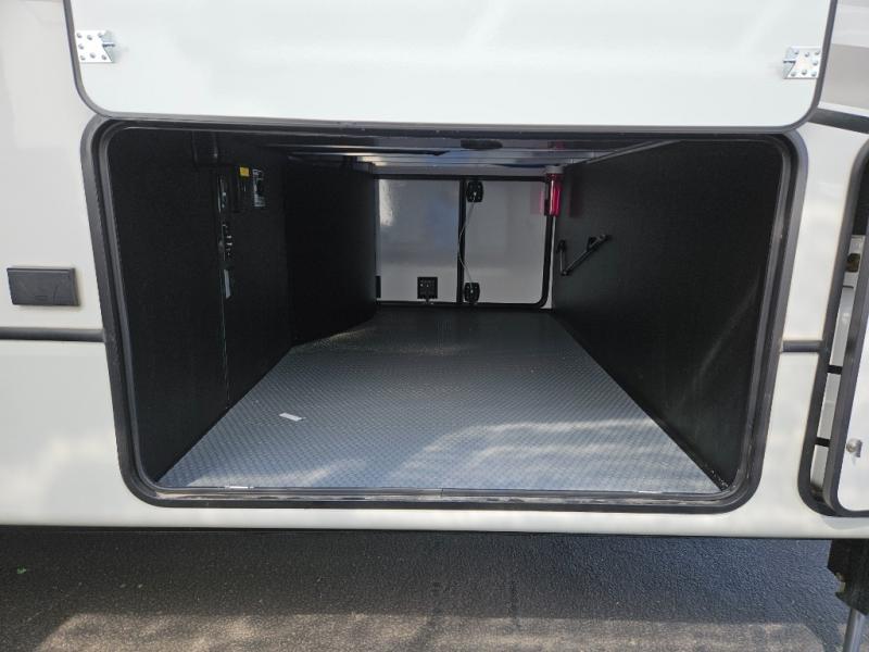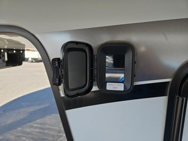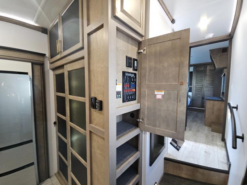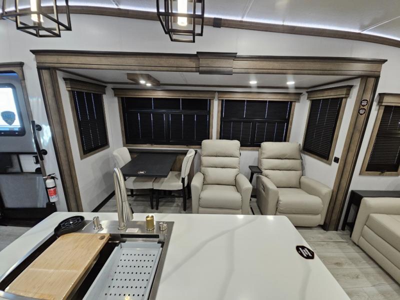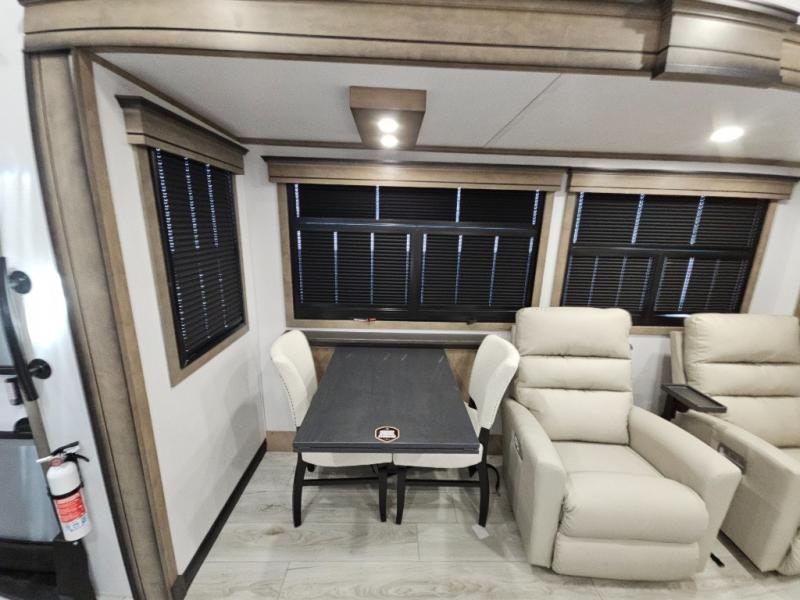 Luxury abounds throughout this fifth wheel! Starting in the kitchen with the island, floor to ceiling pantry with shelves, 24" range, and residential convection microwave. The full bathroom has a 48" x 30" fiberglass shower with a seat, decorative glass enclosure, and a skylight above it for more natural lighting. Sleep like a baby in the front private bedroom on the king bed slide with storage underneath and keep your clothes looking their best with the front closet that has a clothing hamper and stackable washer and dryer prep. The rear living area offers true relaxation with a hide-a-bed sofa and power theater seating across from the entertainment center with a 5,000 BTU decorative fireplace heater and 50" Smart TV to watch your favorite movies!