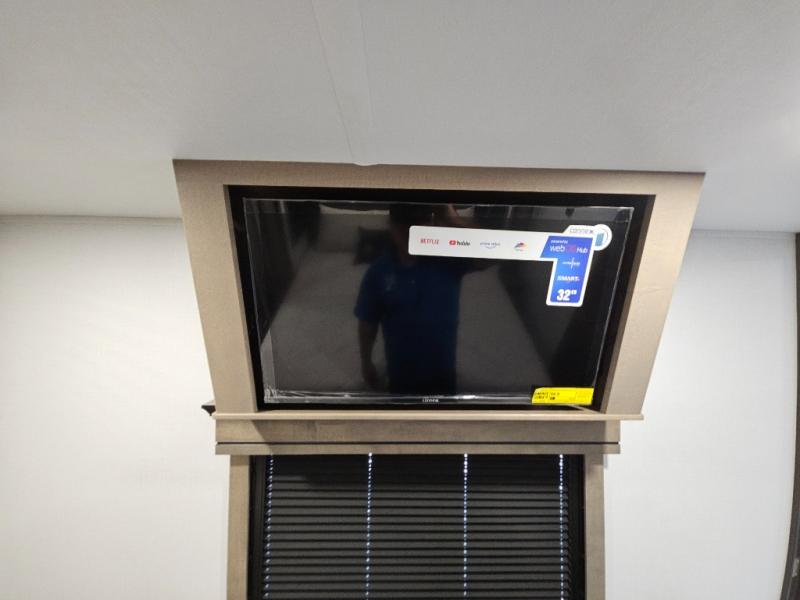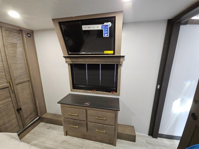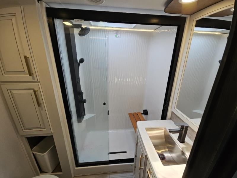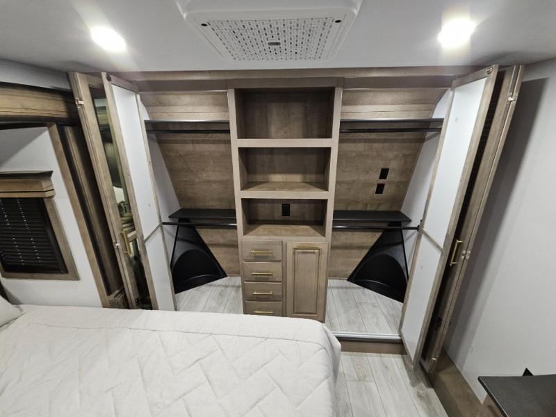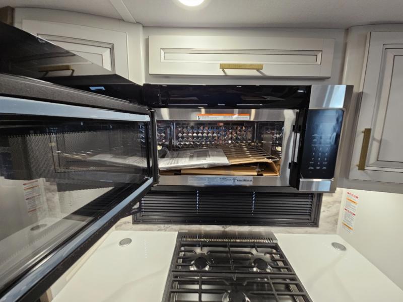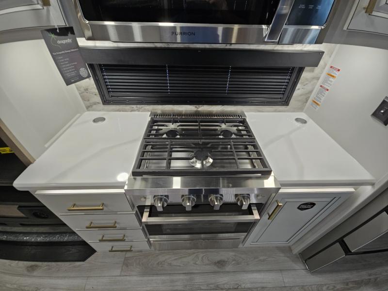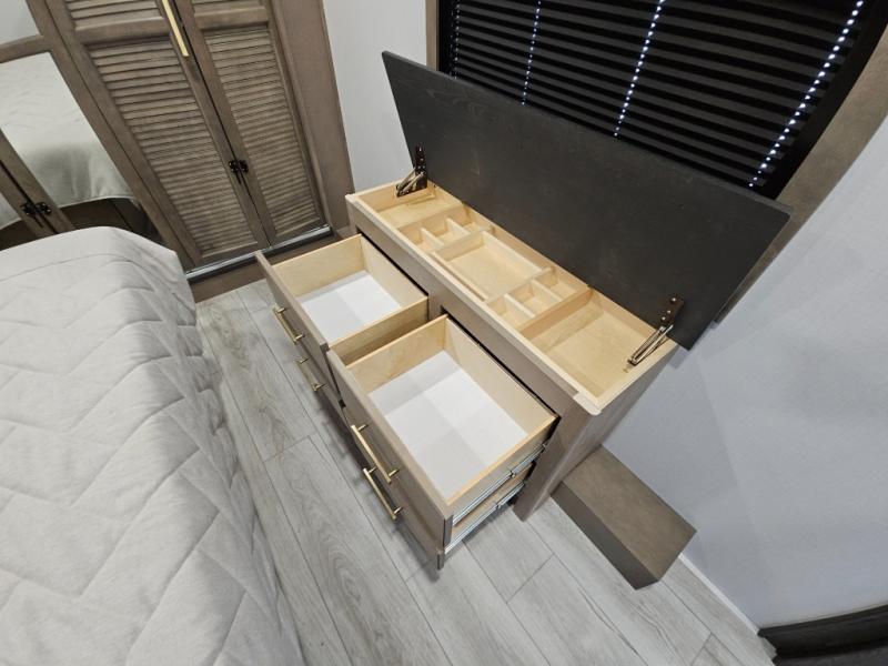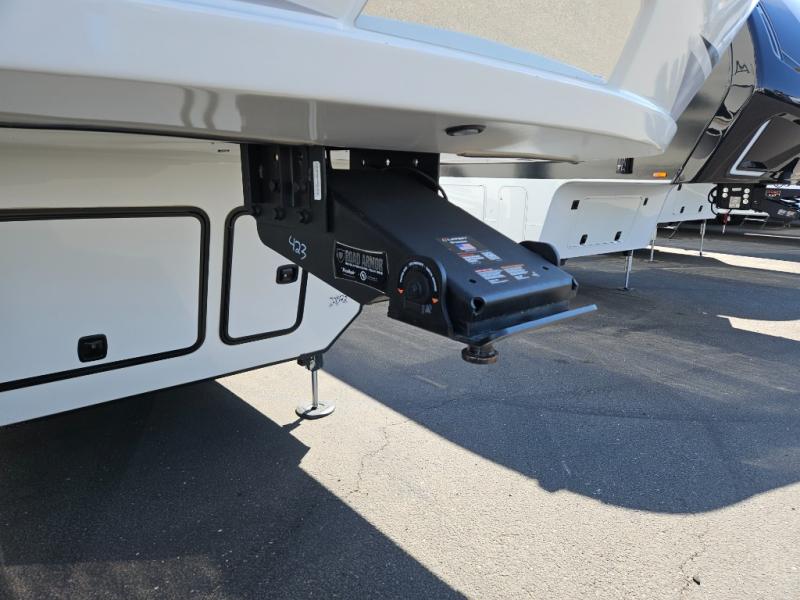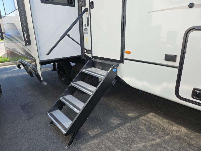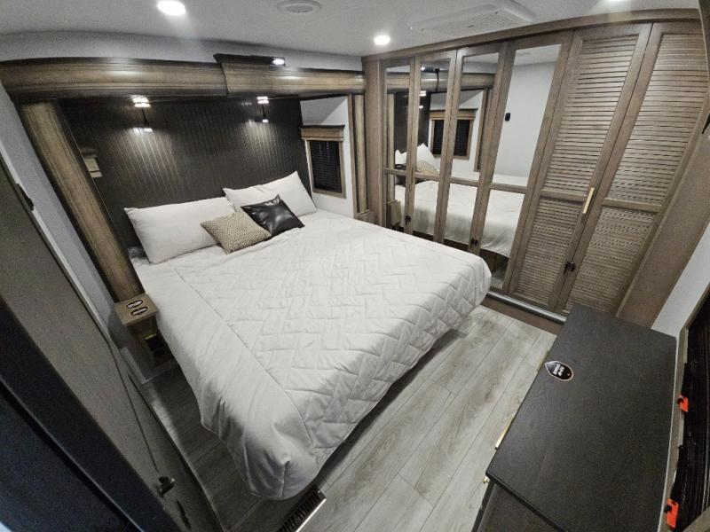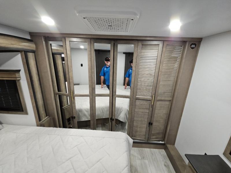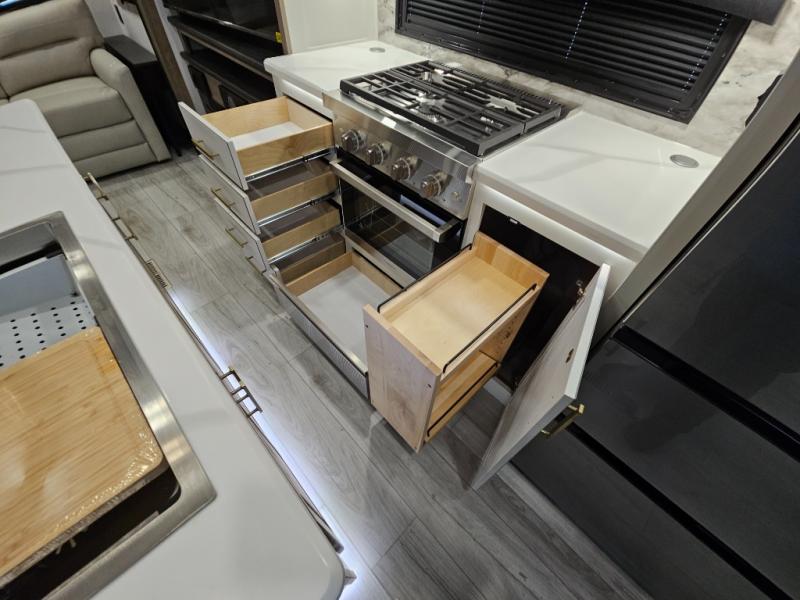 Luxury abounds throughout this fifth wheel! Starting in the kitchen with the island, floor to ceiling pantry with shelves, 24" range, and residential convection microwave. The full bathroom has a 48" x 30" fiberglass shower with a seat, decorative glass enclosure, and a skylight above it for more natural lighting. Sleep like a baby in the front private bedroom on the king bed slide with storage underneath and keep your clothes looking their best with the front closet that has a clothing hamper and stackable washer and dryer prep. The rear living area offers true relaxation with a hide-a-bed sofa and power theater seating across from the entertainment center with a 5,000 BTU decorative fireplace heater and 50" Smart TV to watch your favorite movies!