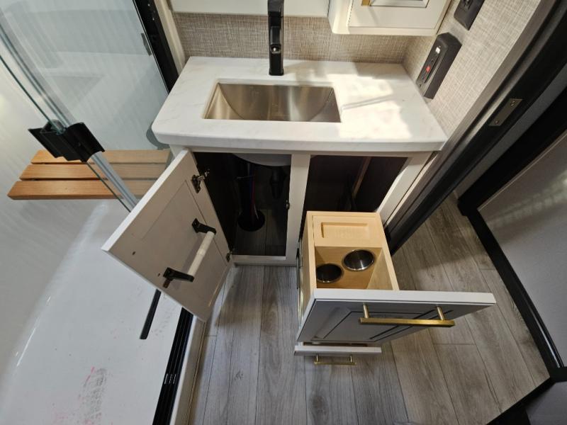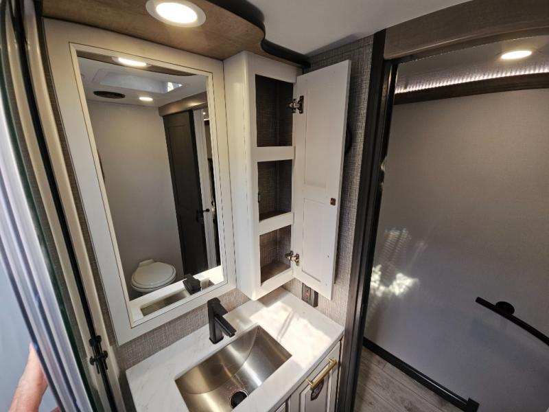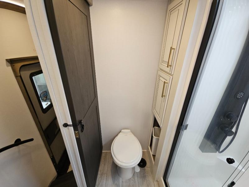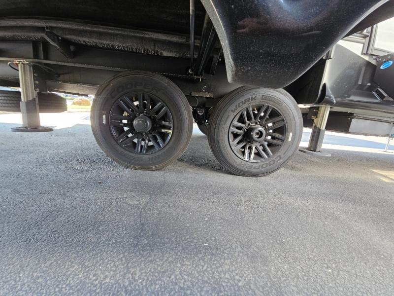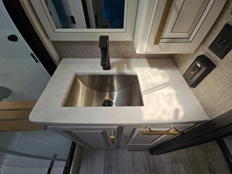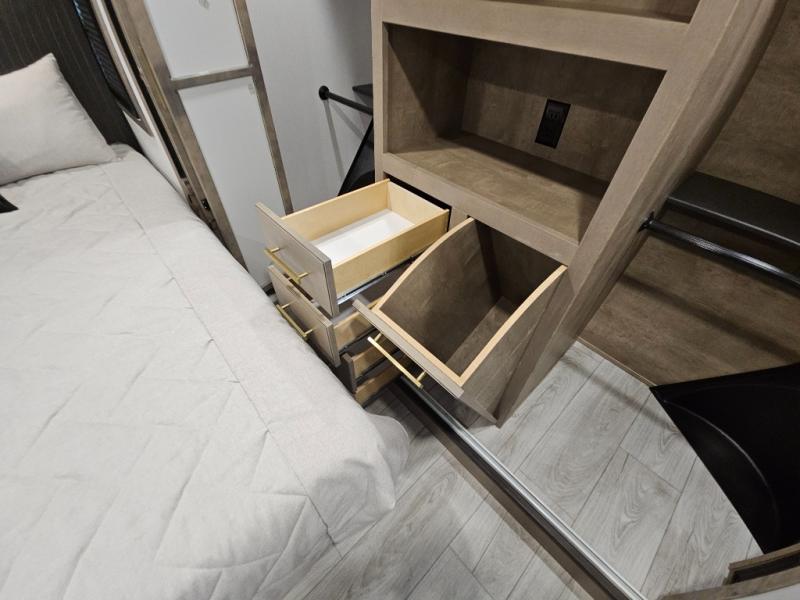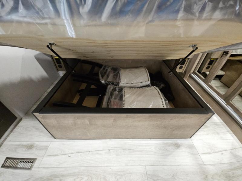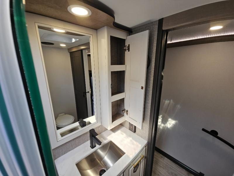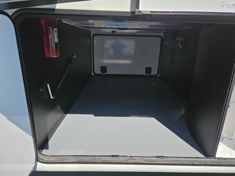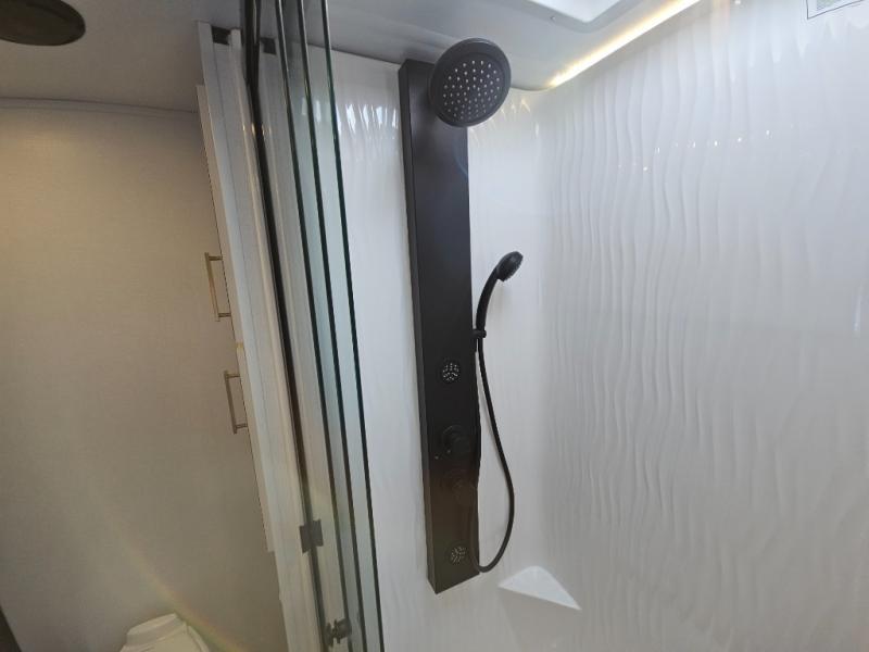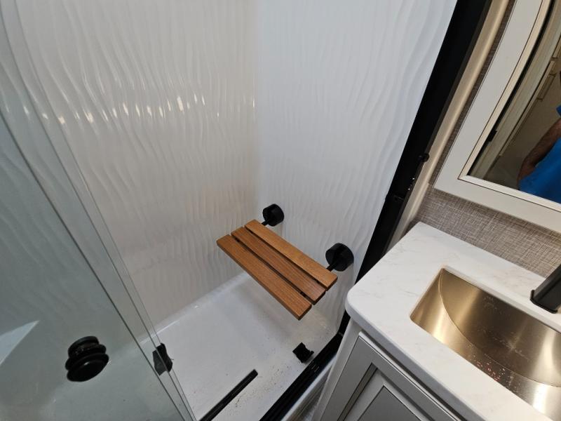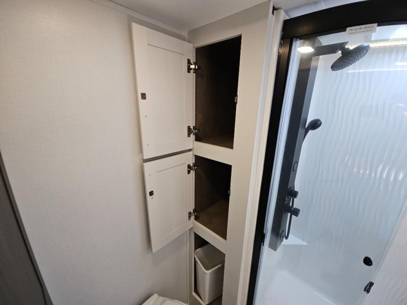 Luxury abounds throughout this fifth wheel! Starting in the kitchen with the island, floor to ceiling pantry with shelves, 24" range, and residential convection microwave. The full bathroom has a 48" x 30" fiberglass shower with a seat, decorative glass enclosure, and a skylight above it for more natural lighting. Sleep like a baby in the front private bedroom on the king bed slide with storage underneath and keep your clothes looking their best with the front closet that has a clothing hamper and stackable washer and dryer prep. The rear living area offers true relaxation with a hide-a-bed sofa and power theater seating across from the entertainment center with a 5,000 BTU decorative fireplace heater and 50" Smart TV to watch your favorite movies!