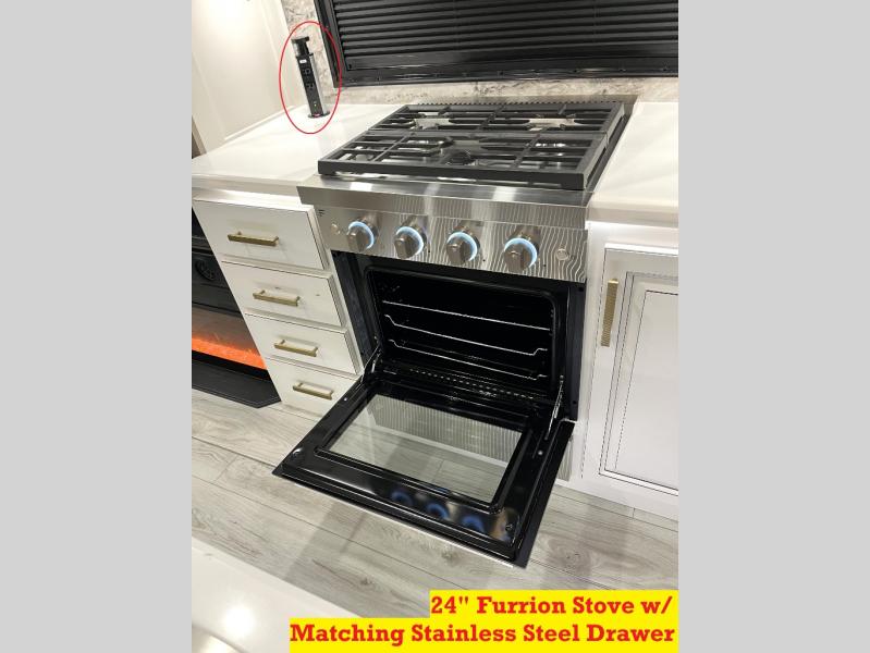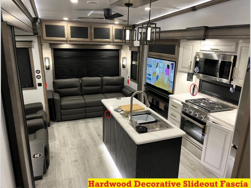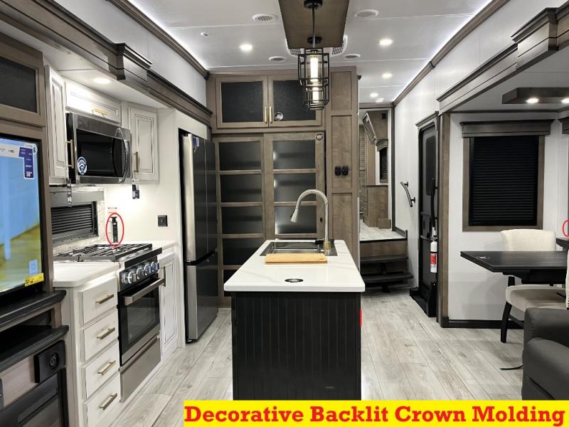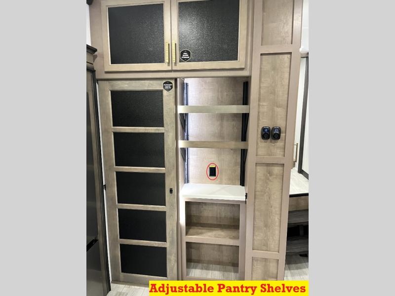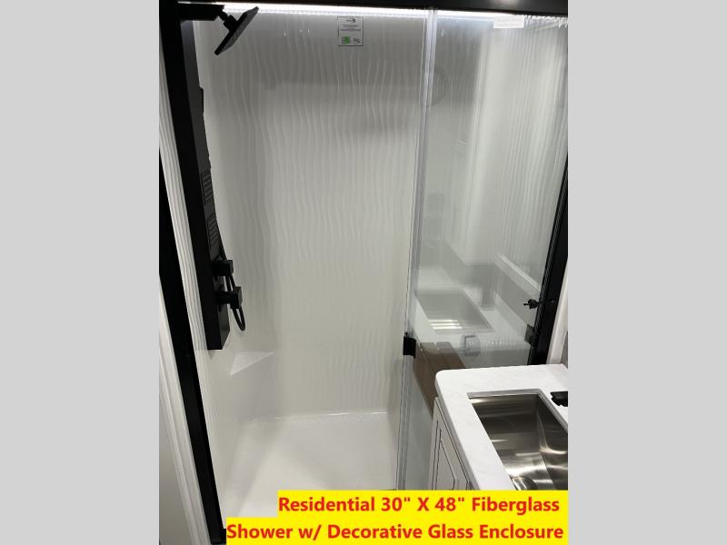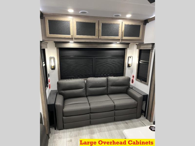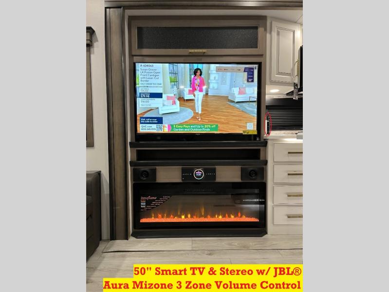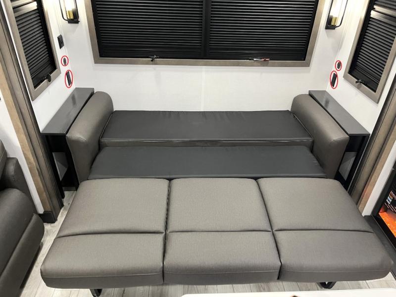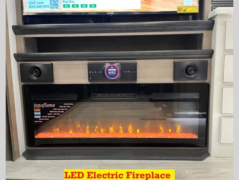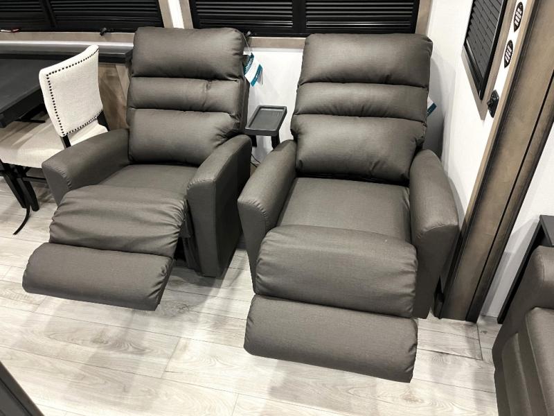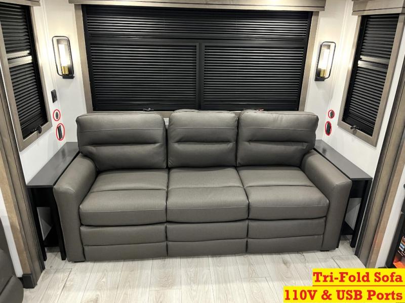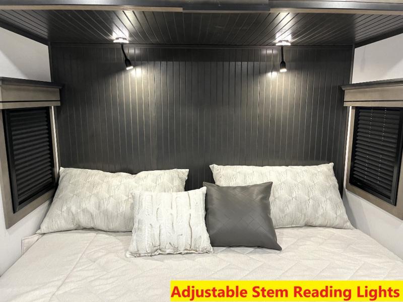 Luxury abounds throughout this fifth wheel! Starting in the kitchen with the island, floor to ceiling pantry with shelves, 24" range, and residential convection microwave. The full bathroom has a 48" x 30" fiberglass shower with a seat, decorative glass enclosure, and a skylight above it for more natural lighting. Sleep like a baby in the front private bedroom on the king bed slide with storage underneath and keep your clothes looking their best with the front closet that has a clothing hamper and stackable washer and dryer prep. The rear living area offers true relaxation with a hide-a-bed sofa and power theater seating across from the entertainment center with a 5,000 BTU decorative fireplace heater and 50" Smart TV to watch your favorite movies!