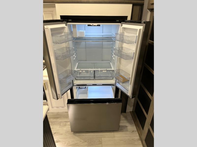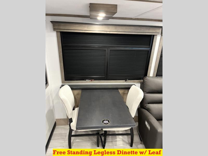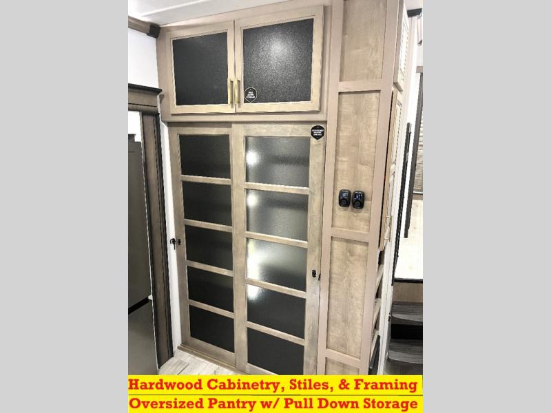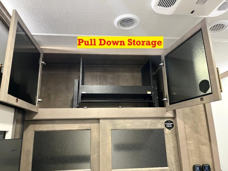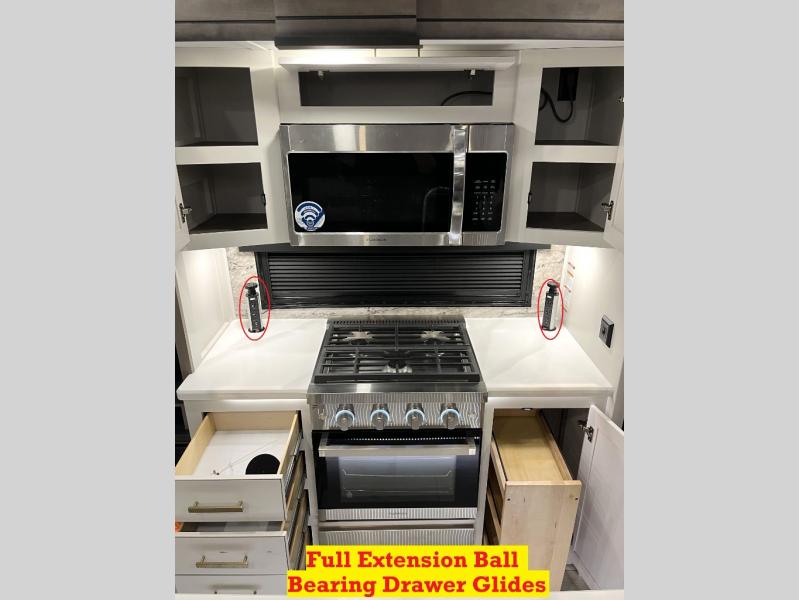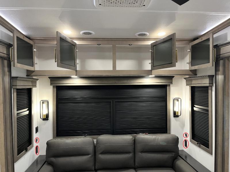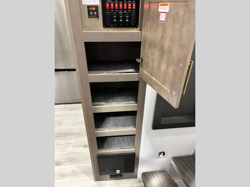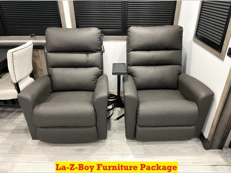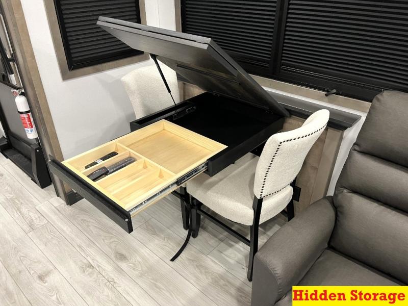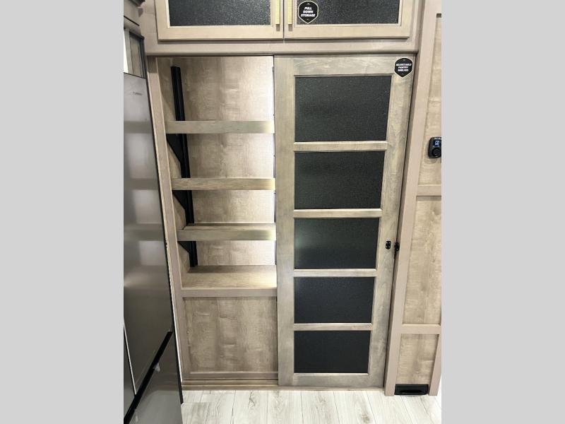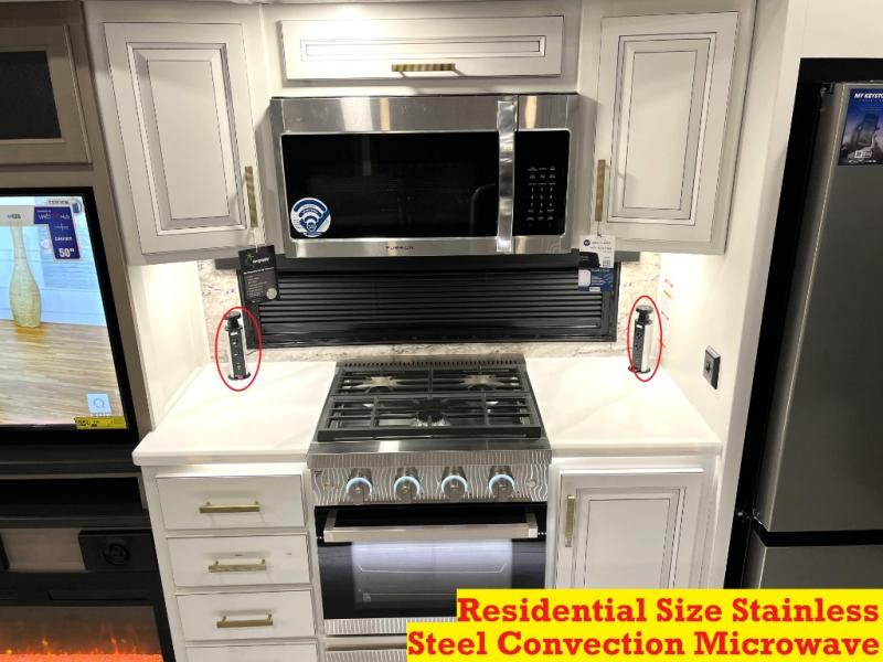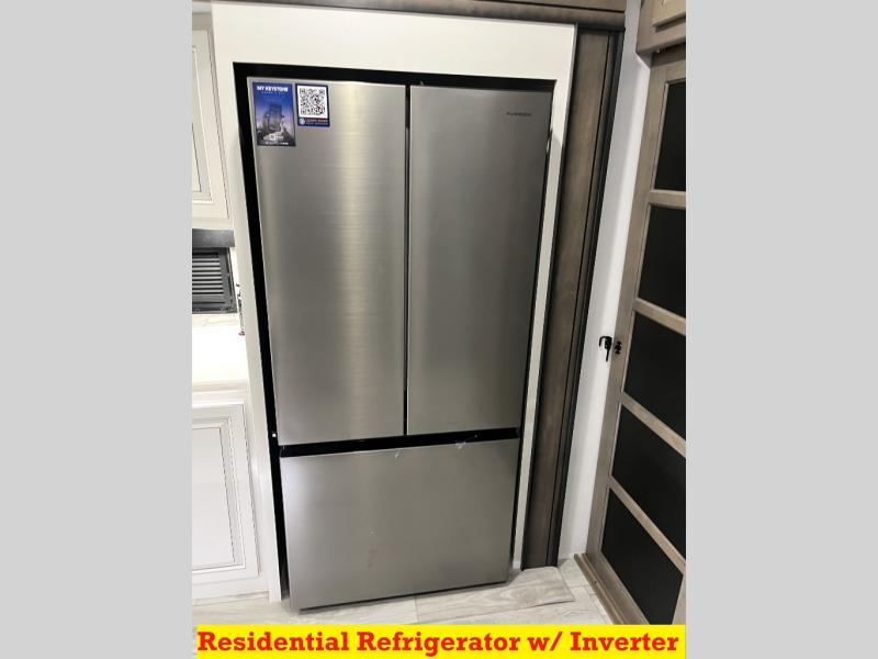 Luxury abounds throughout this fifth wheel! Starting in the kitchen with the island, floor to ceiling pantry with shelves, 24" range, and residential convection microwave. The full bathroom has a 48" x 30" fiberglass shower with a seat, decorative glass enclosure, and a skylight above it for more natural lighting. Sleep like a baby in the front private bedroom on the king bed slide with storage underneath and keep your clothes looking their best with the front closet that has a clothing hamper and stackable washer and dryer prep. The rear living area offers true relaxation with a hide-a-bed sofa and power theater seating across from the entertainment center with a 5,000 BTU decorative fireplace heater and 50" Smart TV to watch your favorite movies!