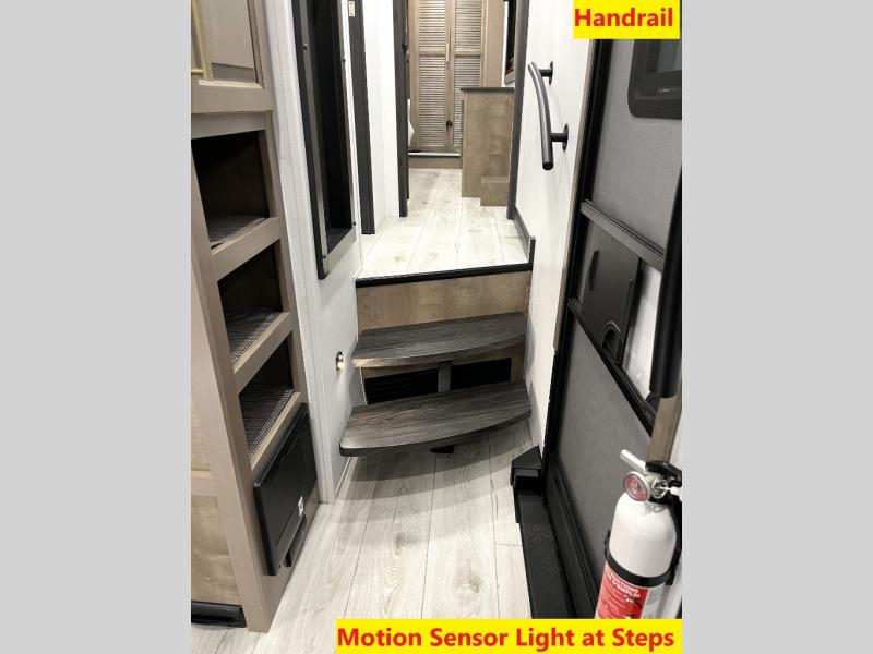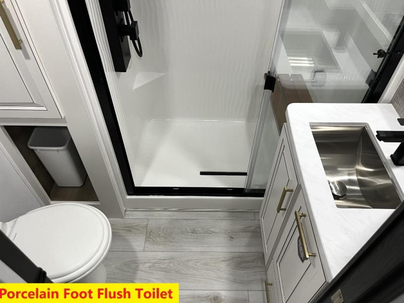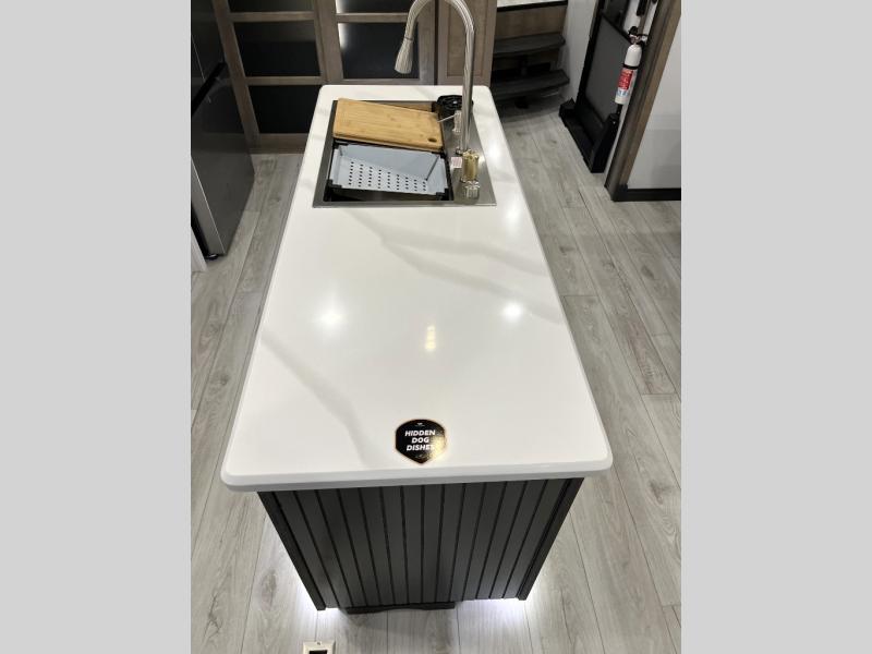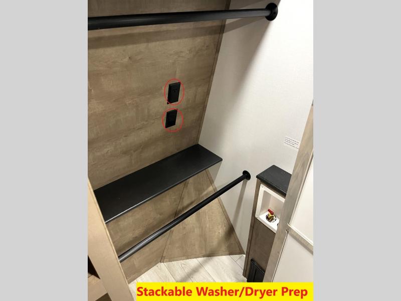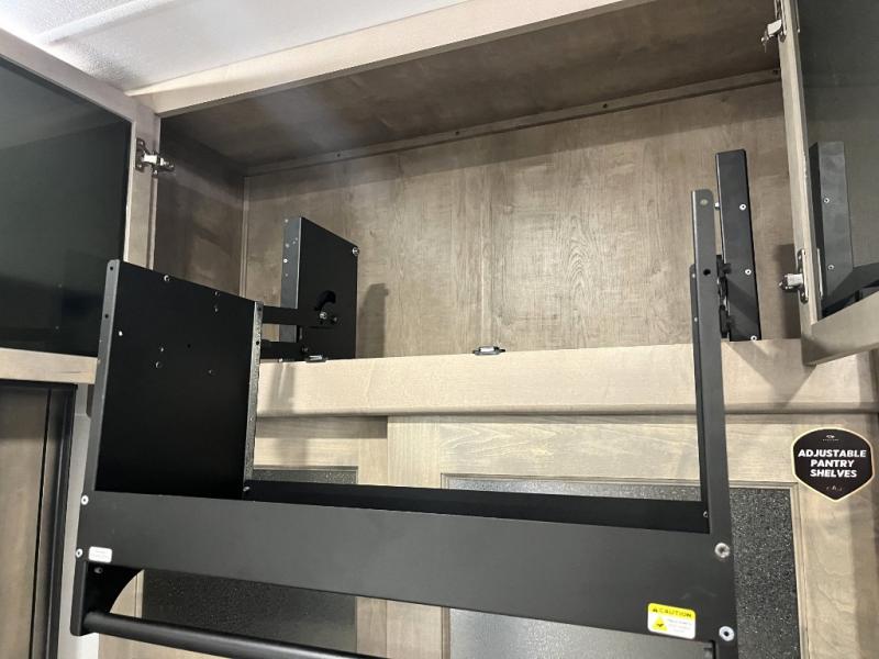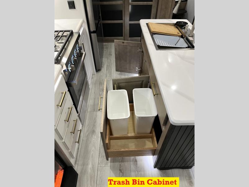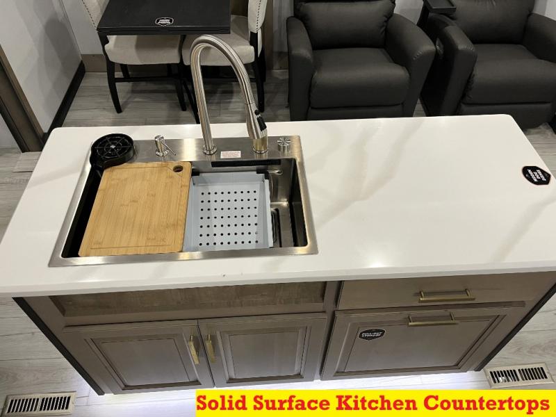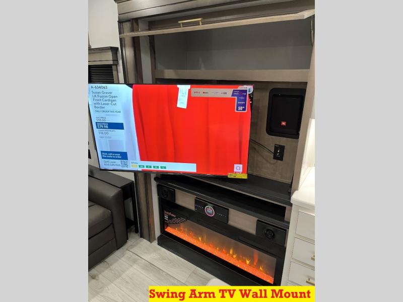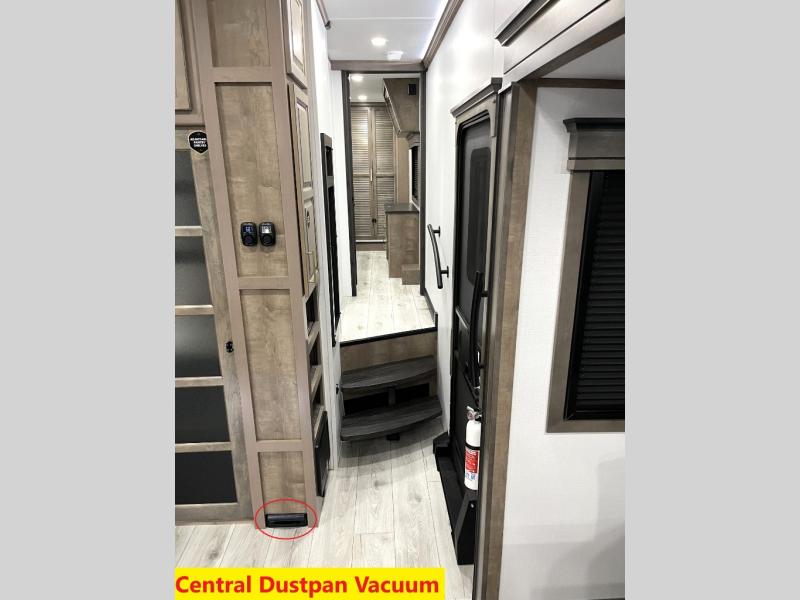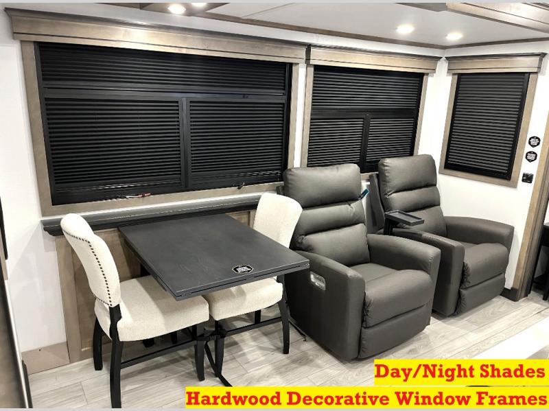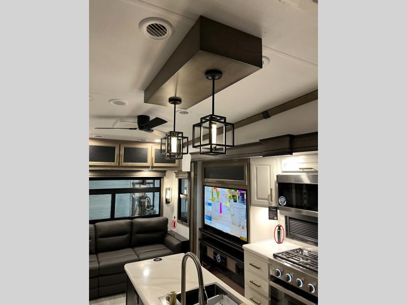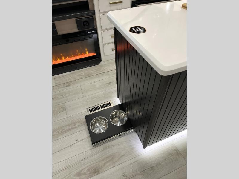 Luxury abounds throughout this fifth wheel! Starting in the kitchen with the island, floor to ceiling pantry with shelves, 24" range, and residential convection microwave. The full bathroom has a 48" x 30" fiberglass shower with a seat, decorative glass enclosure, and a skylight above it for more natural lighting. Sleep like a baby in the front private bedroom on the king bed slide with storage underneath and keep your clothes looking their best with the front closet that has a clothing hamper and stackable washer and dryer prep. The rear living area offers true relaxation with a hide-a-bed sofa and power theater seating across from the entertainment center with a 5,000 BTU decorative fireplace heater and 50" Smart TV to watch your favorite movies!