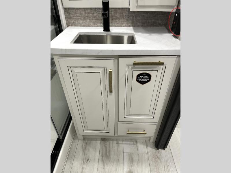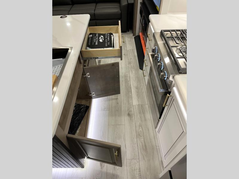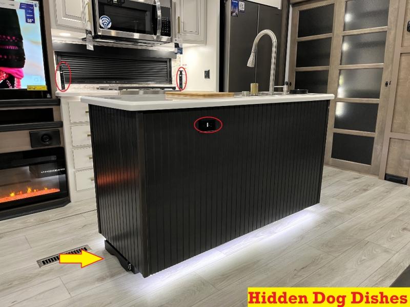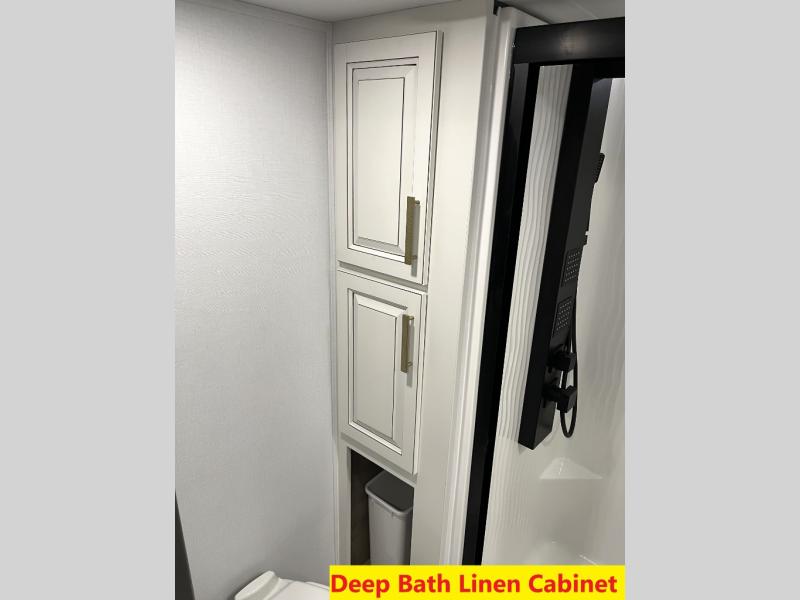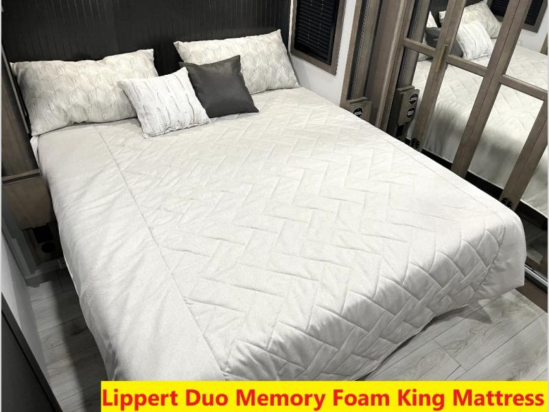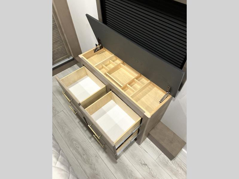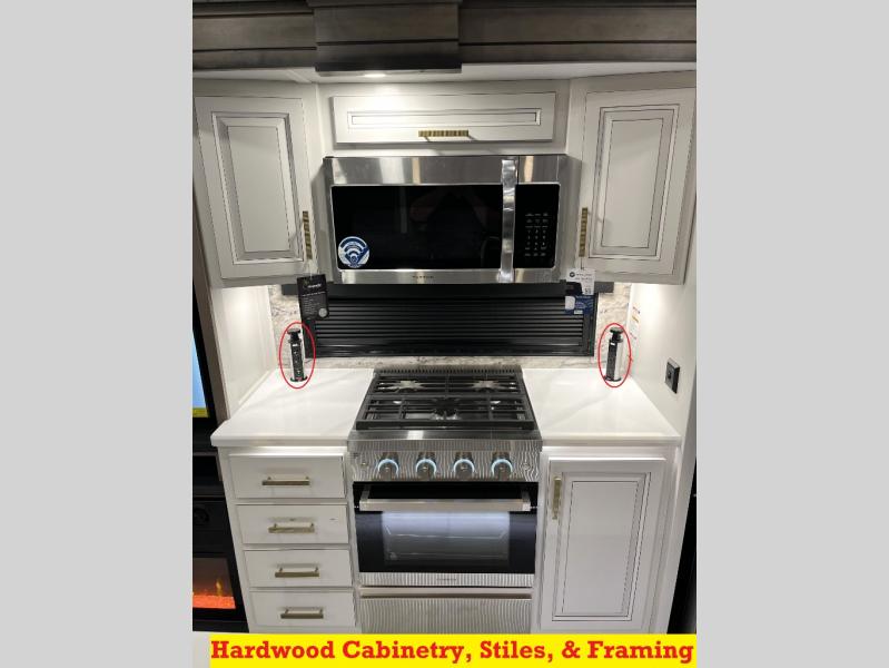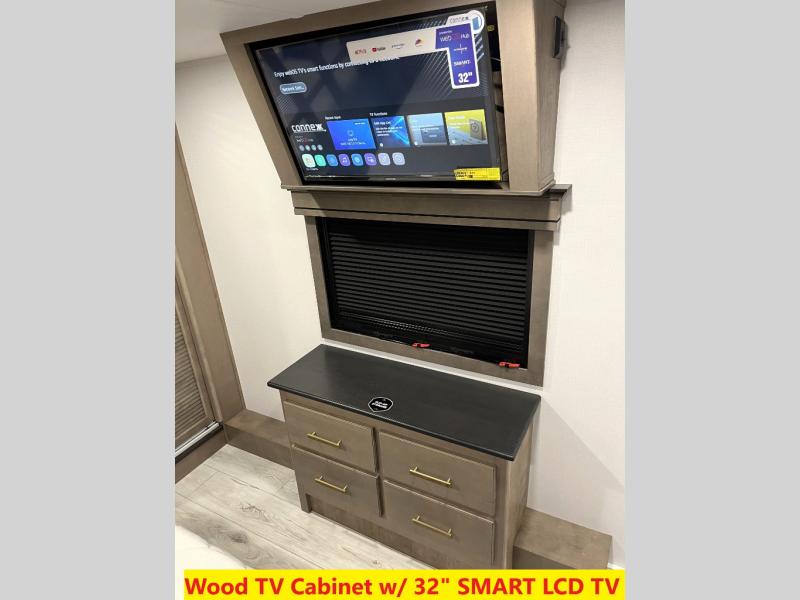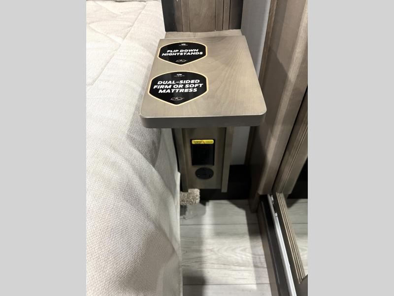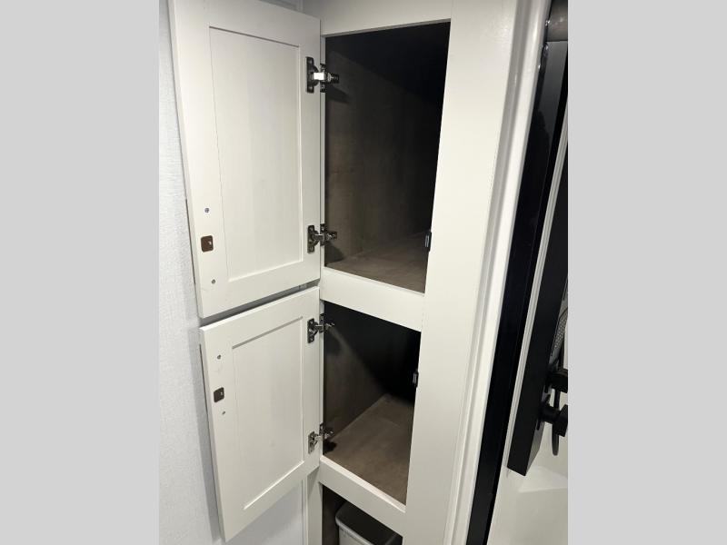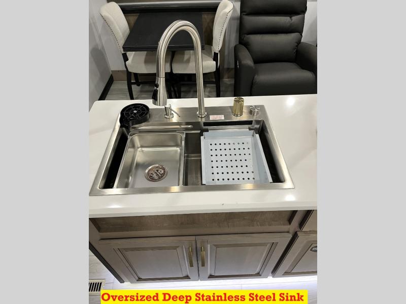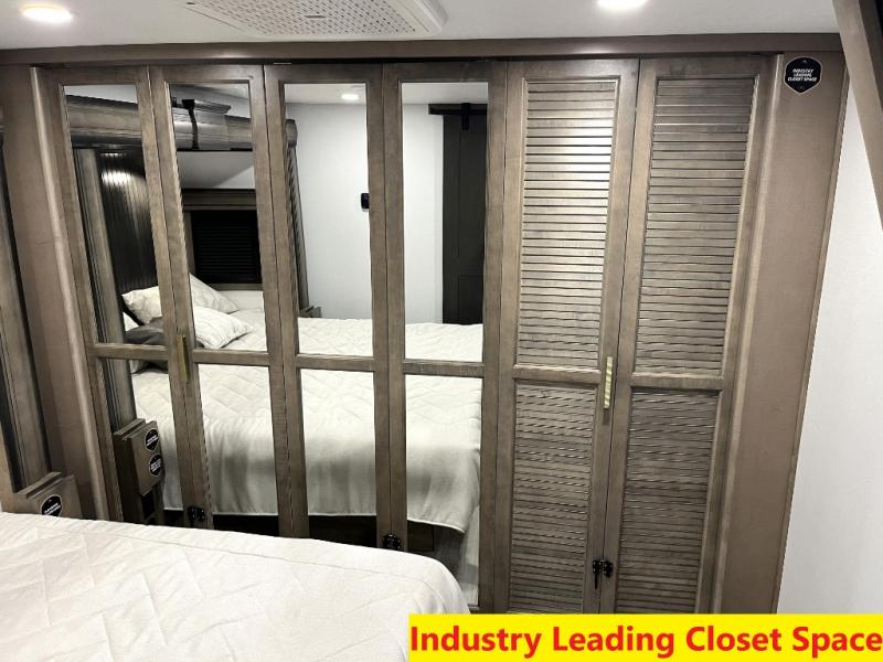 Luxury abounds throughout this fifth wheel! Starting in the kitchen with the island, floor to ceiling pantry with shelves, 24" range, and residential convection microwave. The full bathroom has a 48" x 30" fiberglass shower with a seat, decorative glass enclosure, and a skylight above it for more natural lighting. Sleep like a baby in the front private bedroom on the king bed slide with storage underneath and keep your clothes looking their best with the front closet that has a clothing hamper and stackable washer and dryer prep. The rear living area offers true relaxation with a hide-a-bed sofa and power theater seating across from the entertainment center with a 5,000 BTU decorative fireplace heater and 50" Smart TV to watch your favorite movies!