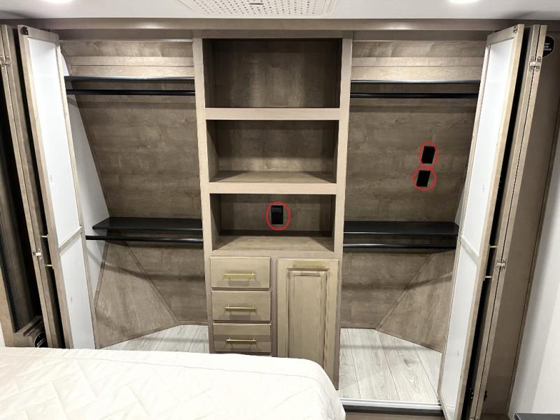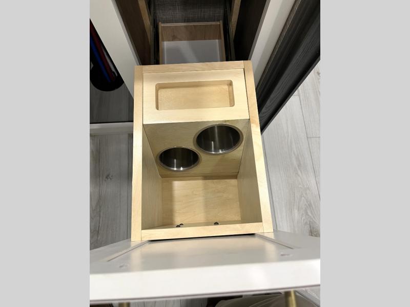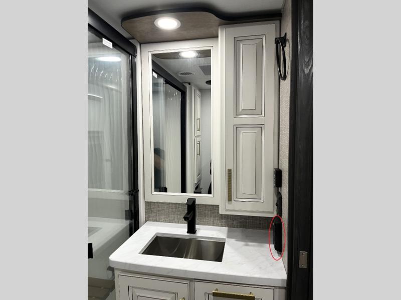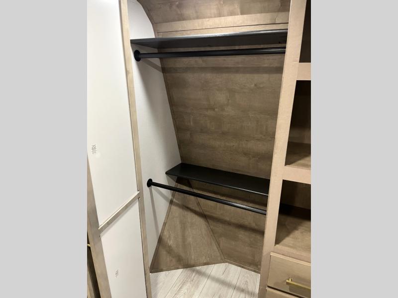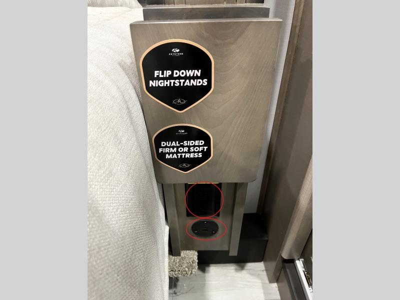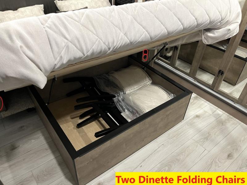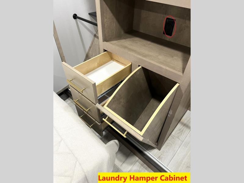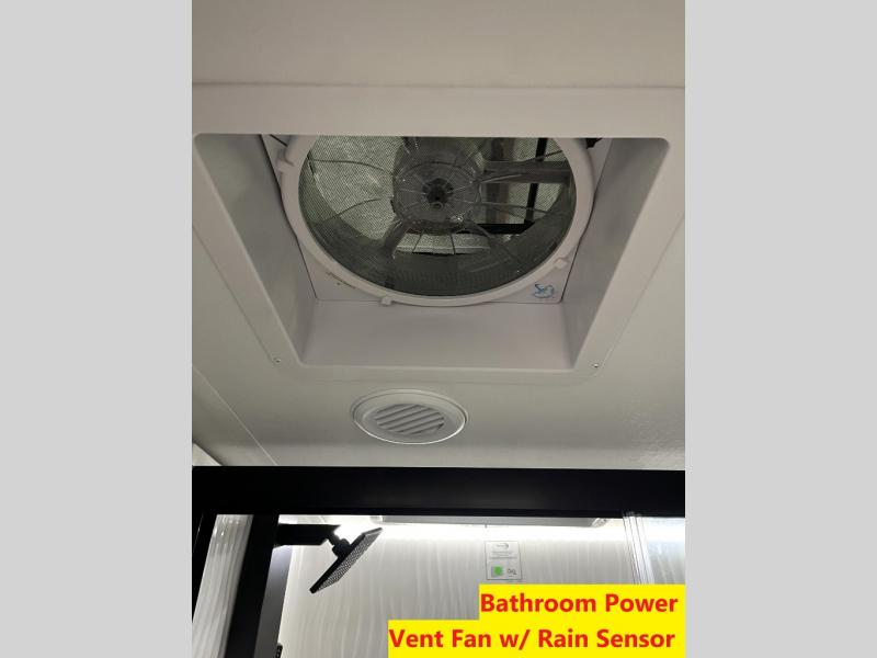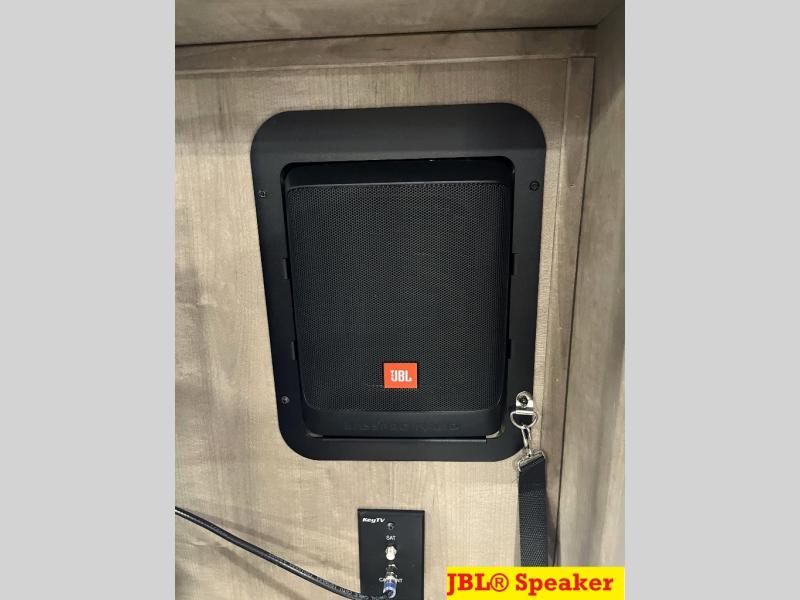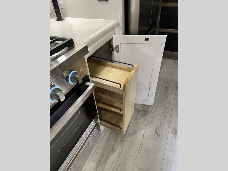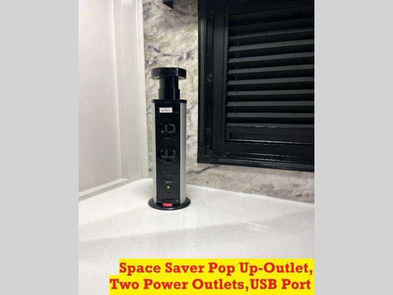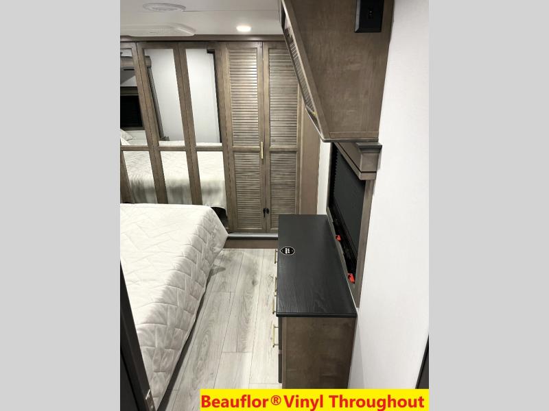 Luxury abounds throughout this fifth wheel! Starting in the kitchen with the island, floor to ceiling pantry with shelves, 24" range, and residential convection microwave. The full bathroom has a 48" x 30" fiberglass shower with a seat, decorative glass enclosure, and a skylight above it for more natural lighting. Sleep like a baby in the front private bedroom on the king bed slide with storage underneath and keep your clothes looking their best with the front closet that has a clothing hamper and stackable washer and dryer prep. The rear living area offers true relaxation with a hide-a-bed sofa and power theater seating across from the entertainment center with a 5,000 BTU decorative fireplace heater and 50" Smart TV to watch your favorite movies!