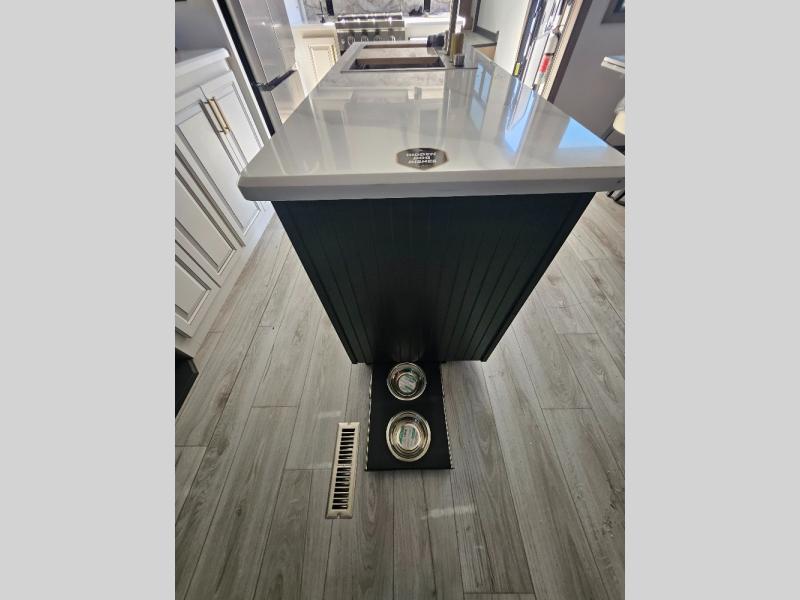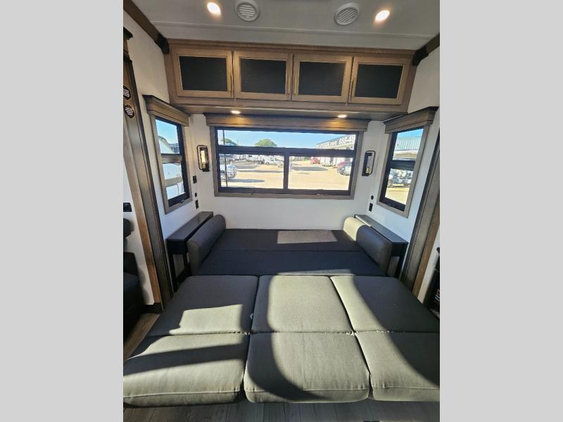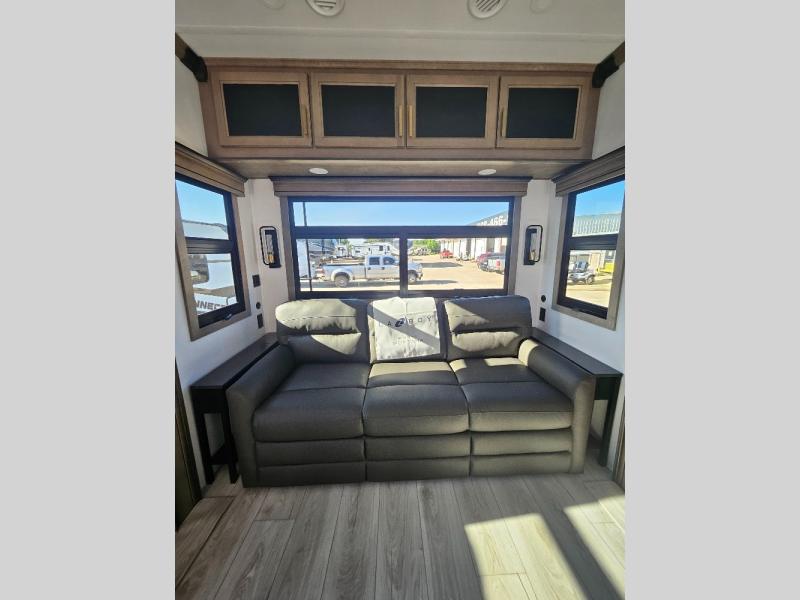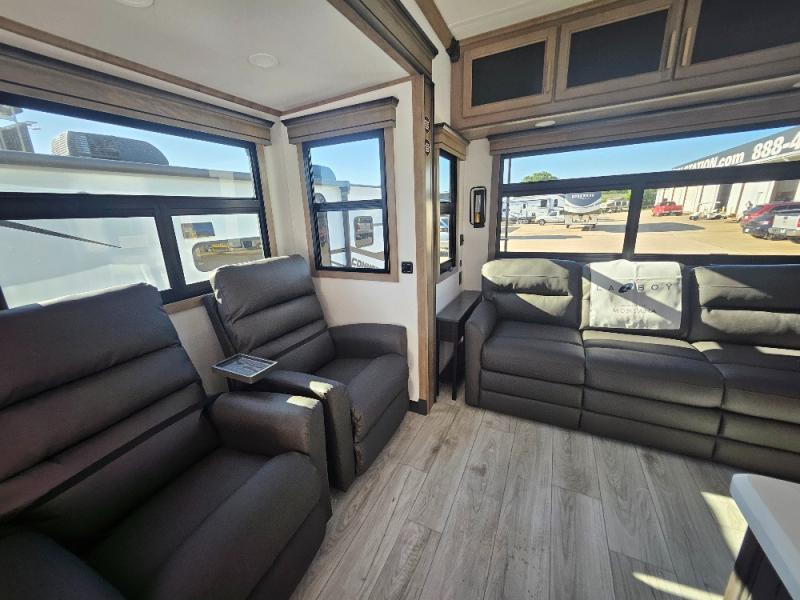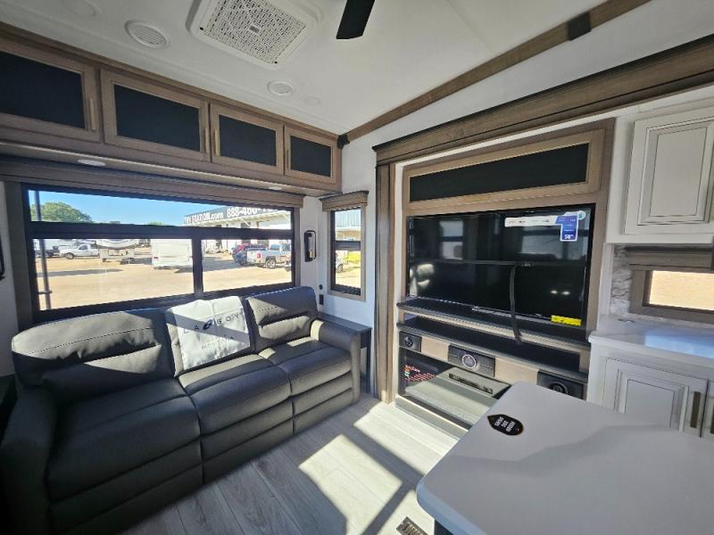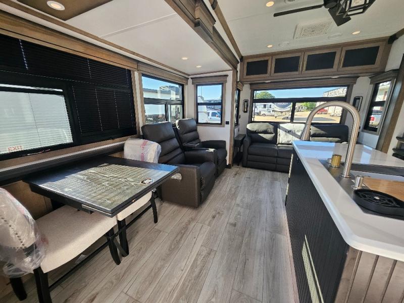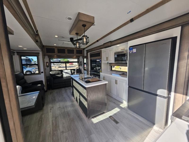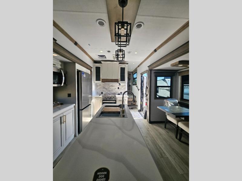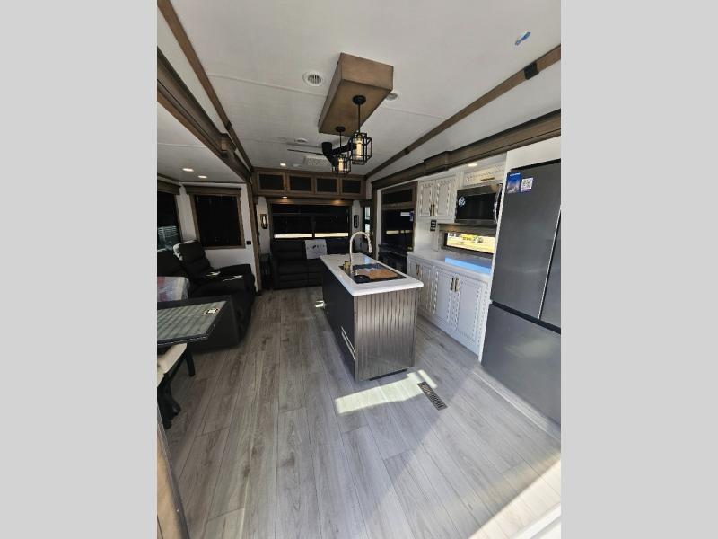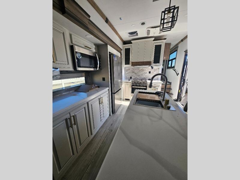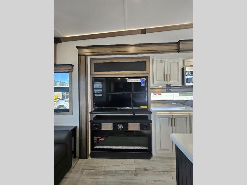 Luxury abounds throughout this fifth wheel! Starting in the kitchen with the island, two pull out pantries with extra countertop space above it, a residential range with hidden storage, and a pull out countertop for more prepping space. The full bathroom has a 48" x 30" fiberglass shower with a seat, decorative glass enclosure, and skylight above it for more natural lighting as two get ready at once with the dual sink vanity. Sleep like a baby in the front private bedroom on the king bed slide with storage underneath and keep your clothes looking their best with two closets and additional storage. The rear living area offers true relaxation with a hide-a-bed sofa and power theater seating across from the entertainment center with a 5,000 BTU decorative fireplace heater and 50" Smart TV to watch your favorite movies!
