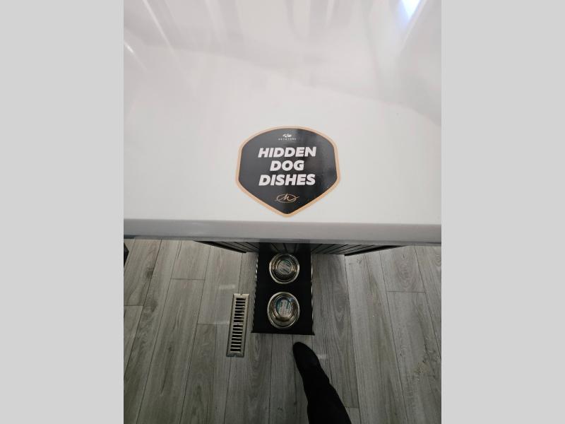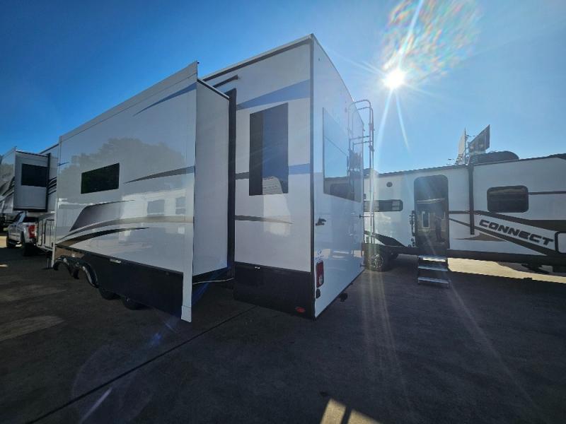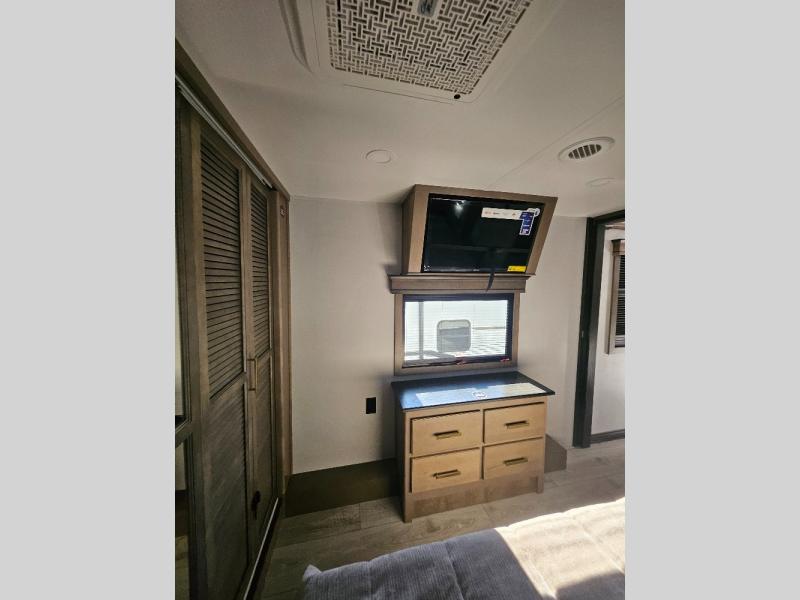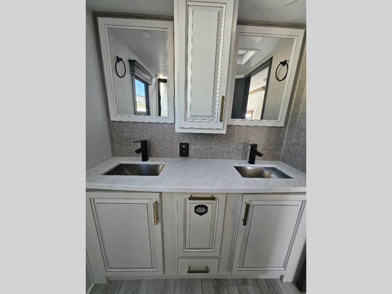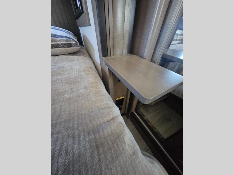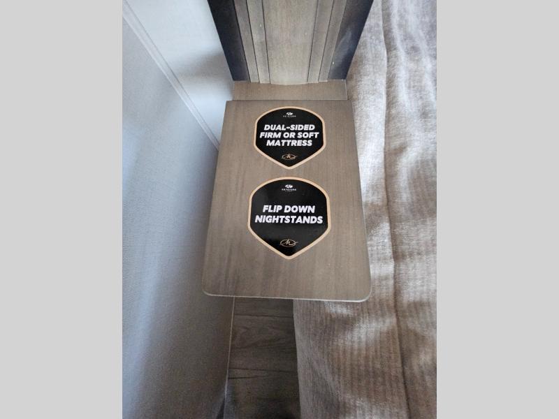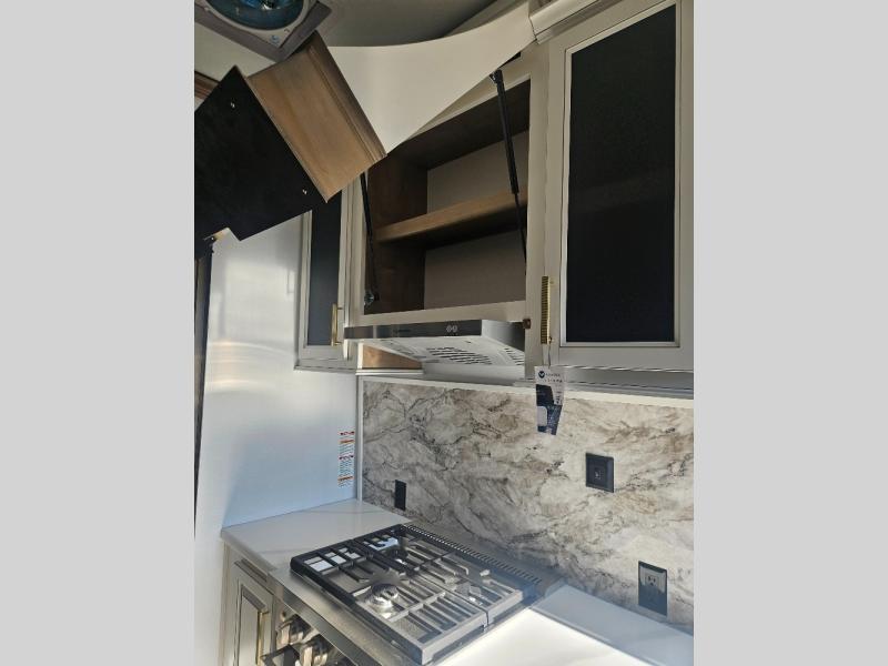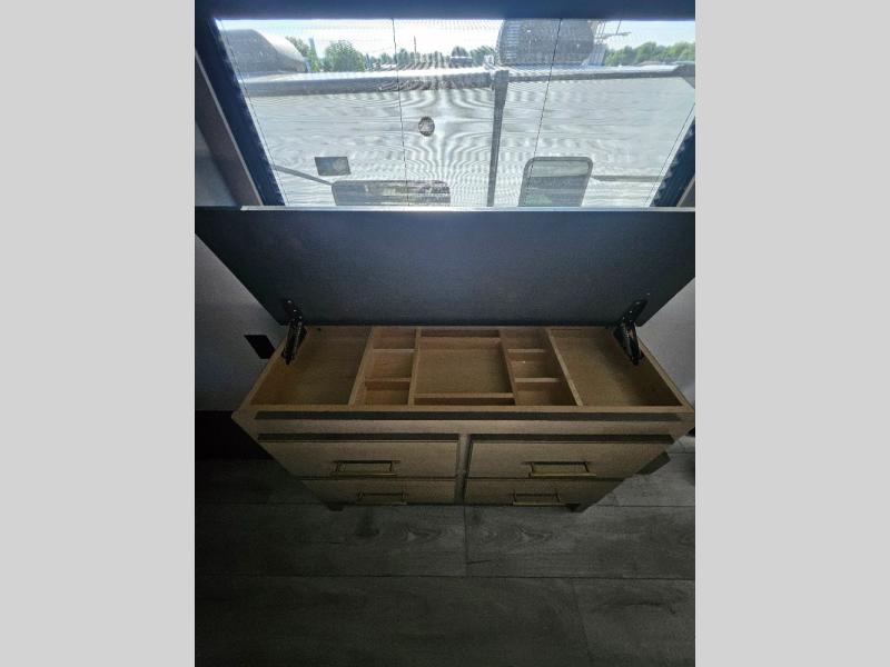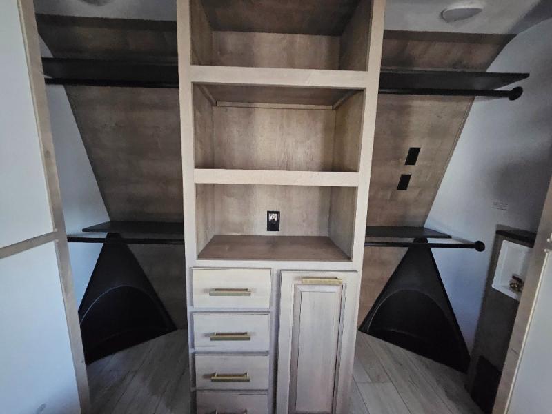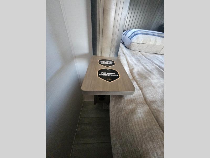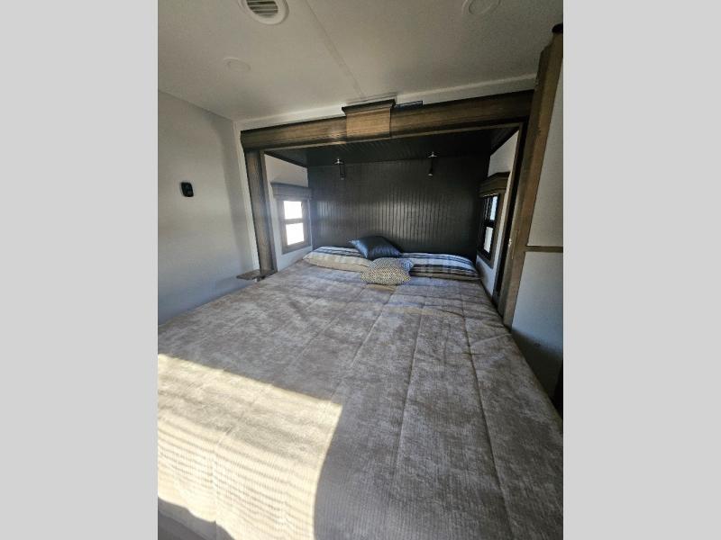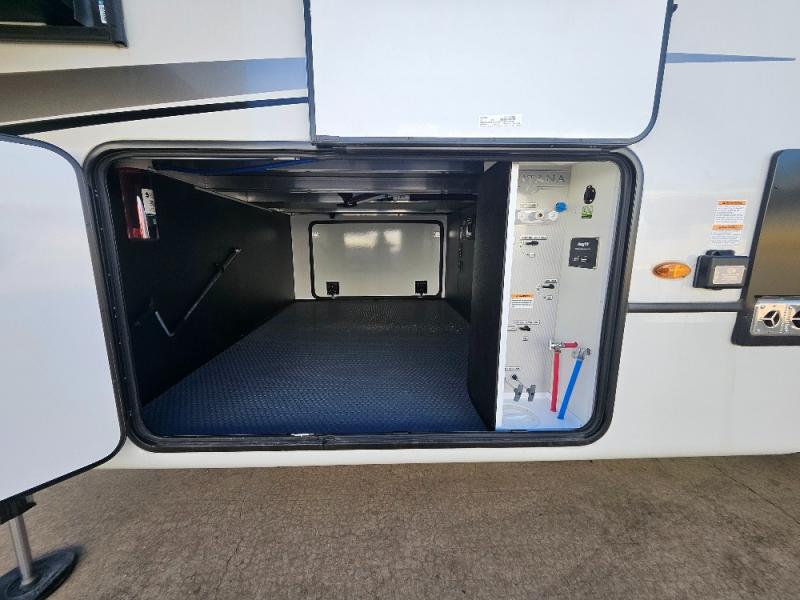 Luxury abounds throughout this fifth wheel! Starting in the kitchen with the island, two pull out pantries with extra countertop space above it, a residential range with hidden storage, and a pull out countertop for more prepping space. The full bathroom has a 48" x 30" fiberglass shower with a seat, decorative glass enclosure, and skylight above it for more natural lighting as two get ready at once with the dual sink vanity. Sleep like a baby in the front private bedroom on the king bed slide with storage underneath and keep your clothes looking their best with two closets and additional storage. The rear living area offers true relaxation with a hide-a-bed sofa and power theater seating across from the entertainment center with a 5,000 BTU decorative fireplace heater and 50" Smart TV to watch your favorite movies!