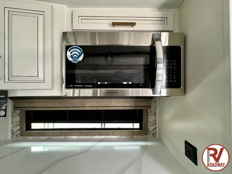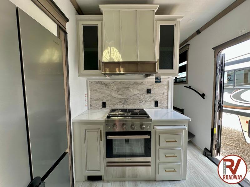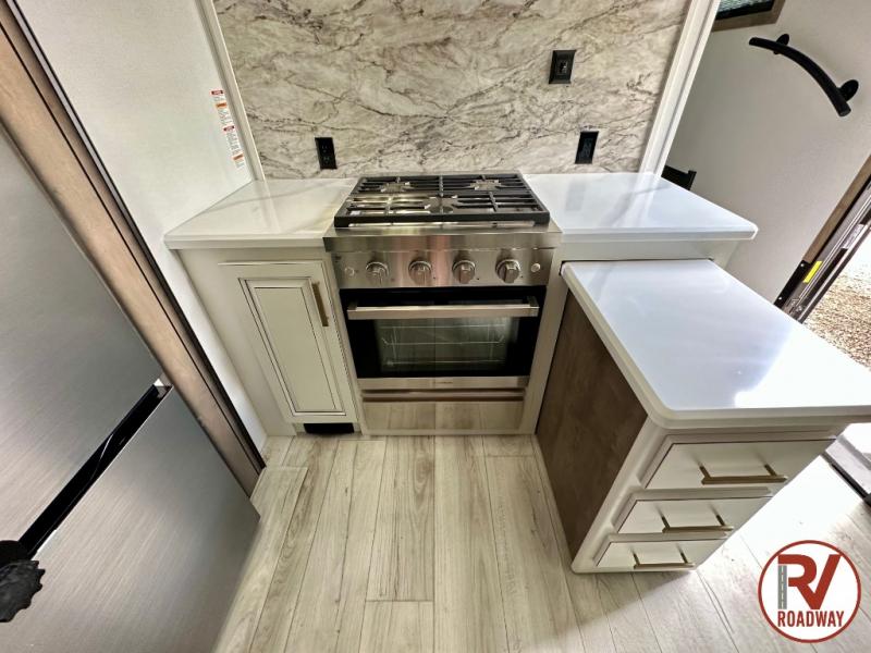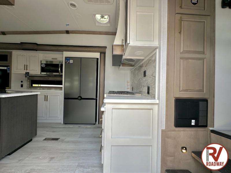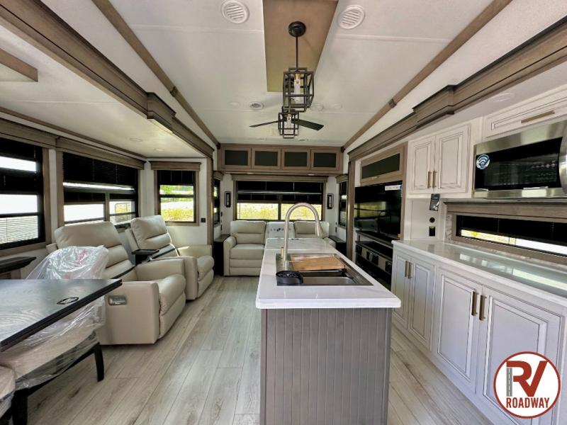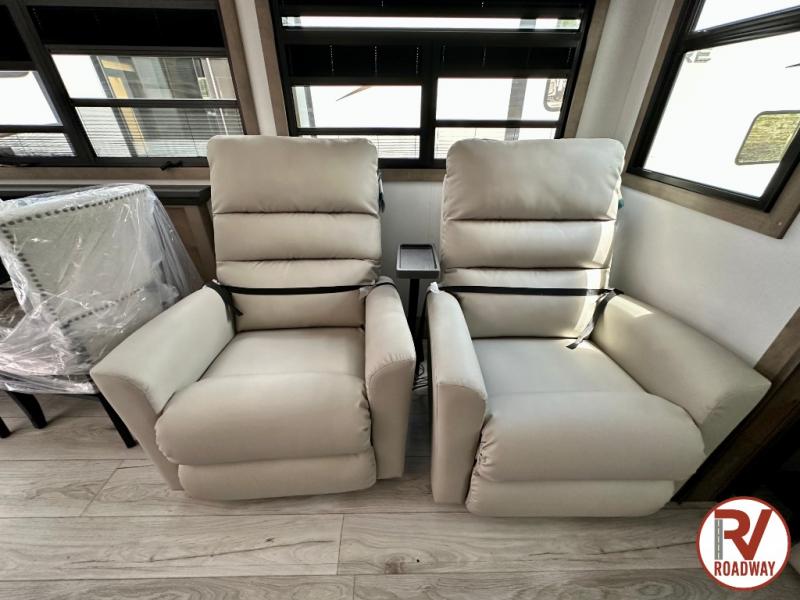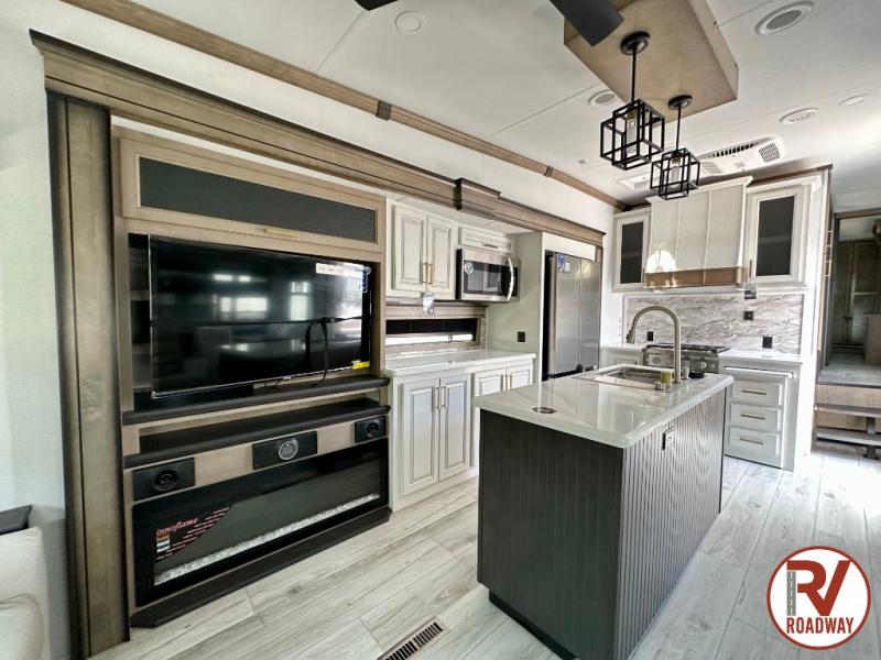 Luxury abounds throughout this fifth wheel! Starting in the kitchen with the island, two pull out pantries with extra countertop space above it, a residential range with hidden storage, and a pull out countertop for more prepping space. The full bathroom has a 48" x 30" fiberglass shower with a seat, decorative glass enclosure, and skylight above it for more natural lighting as two get ready at once with the dual sink vanity. Sleep like a baby in the front private bedroom on the king bed slide with storage underneath and keep your clothes looking their best with two closets and additional storage. The rear living area offers true relaxation with a hide-a-bed sofa and power theater seating across from the entertainment center with a 5,000 BTU decorative fireplace heater and 50" Smart TV to watch your favorite movies!