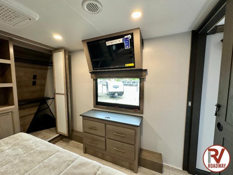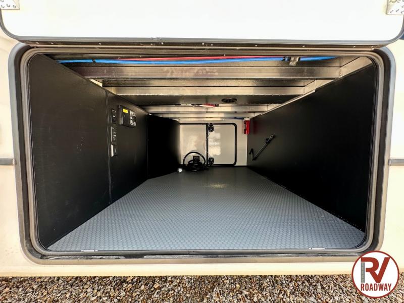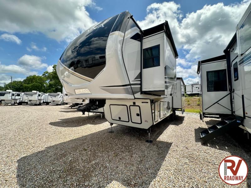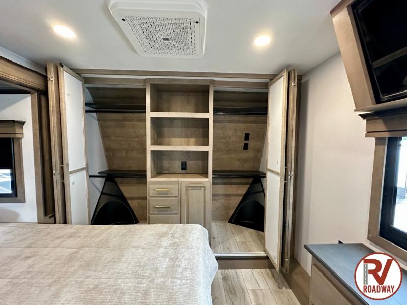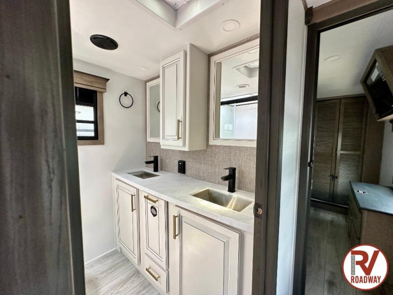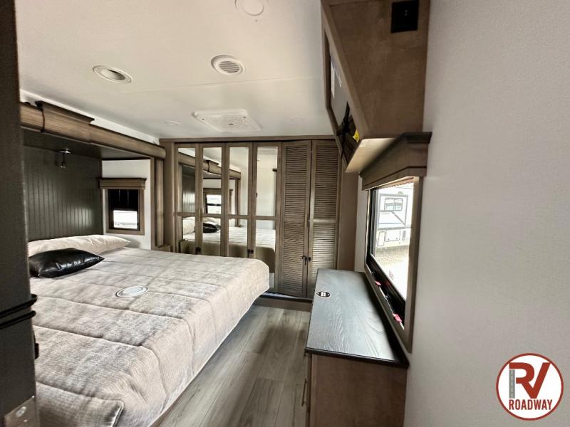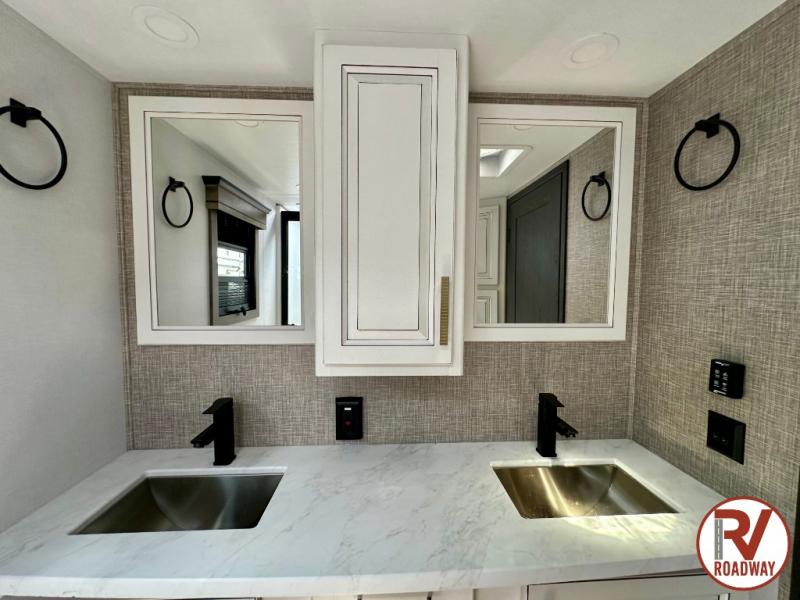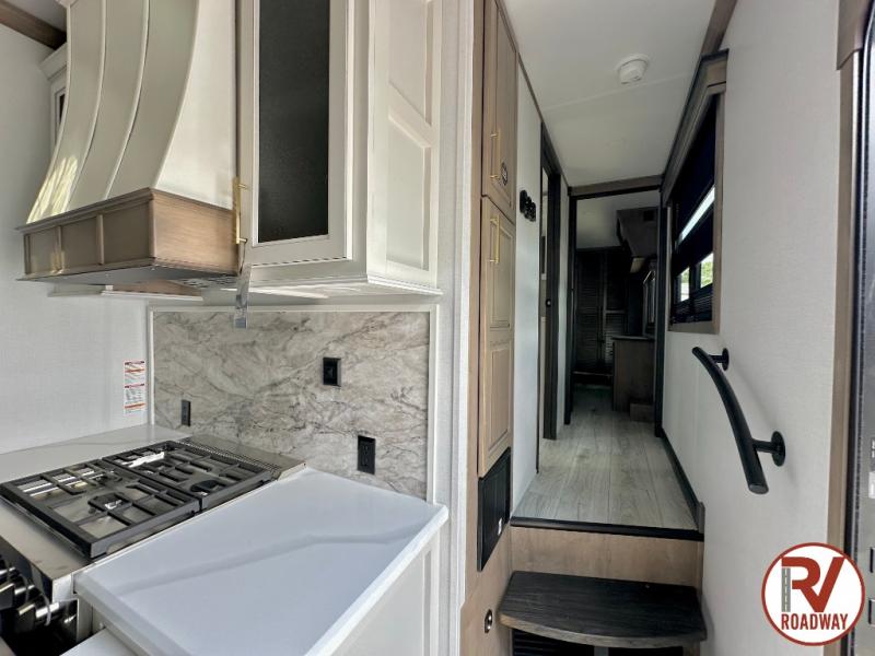 Luxury abounds throughout this fifth wheel! Starting in the kitchen with the island, two pull out pantries with extra countertop space above it, a residential range with hidden storage, and a pull out countertop for more prepping space. The full bathroom has a 48" x 30" fiberglass shower with a seat, decorative glass enclosure, and skylight above it for more natural lighting as two get ready at once with the dual sink vanity. Sleep like a baby in the front private bedroom on the king bed slide with storage underneath and keep your clothes looking their best with two closets and additional storage. The rear living area offers true relaxation with a hide-a-bed sofa and power theater seating across from the entertainment center with a 5,000 BTU decorative fireplace heater and 50" Smart TV to watch your favorite movies!