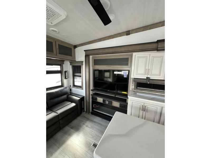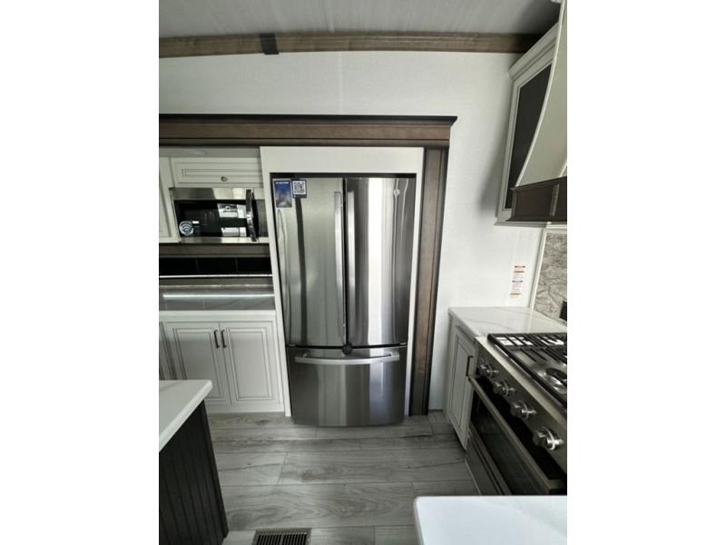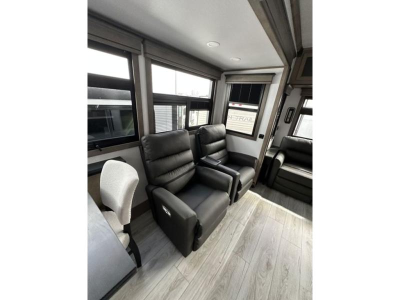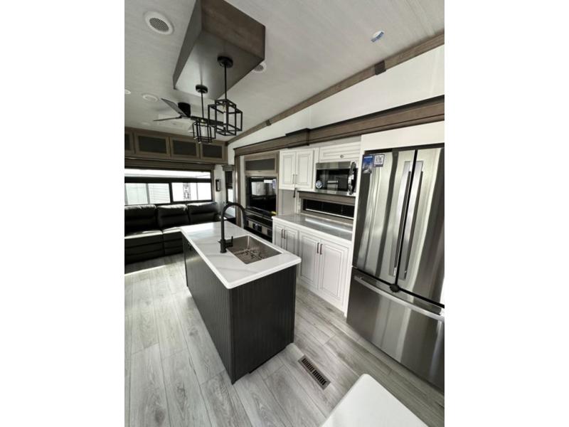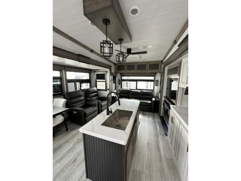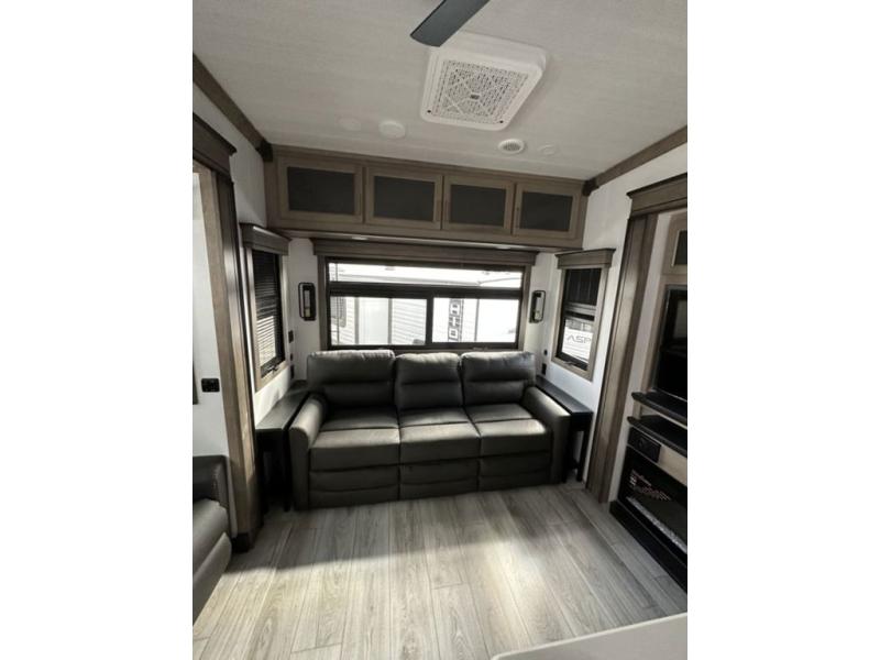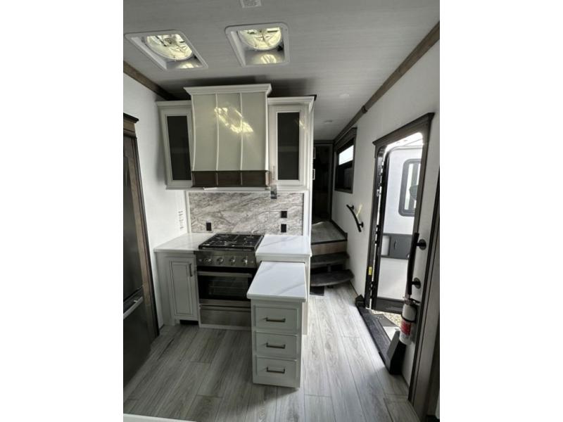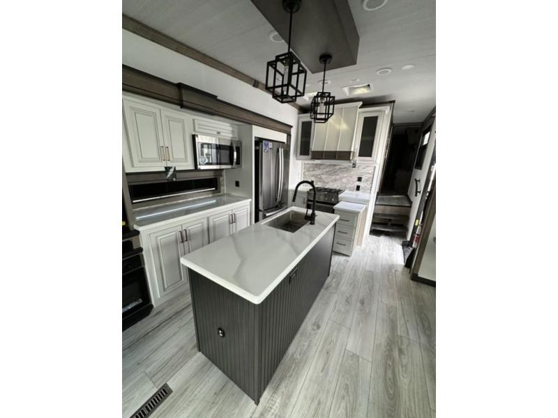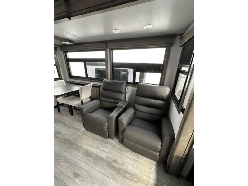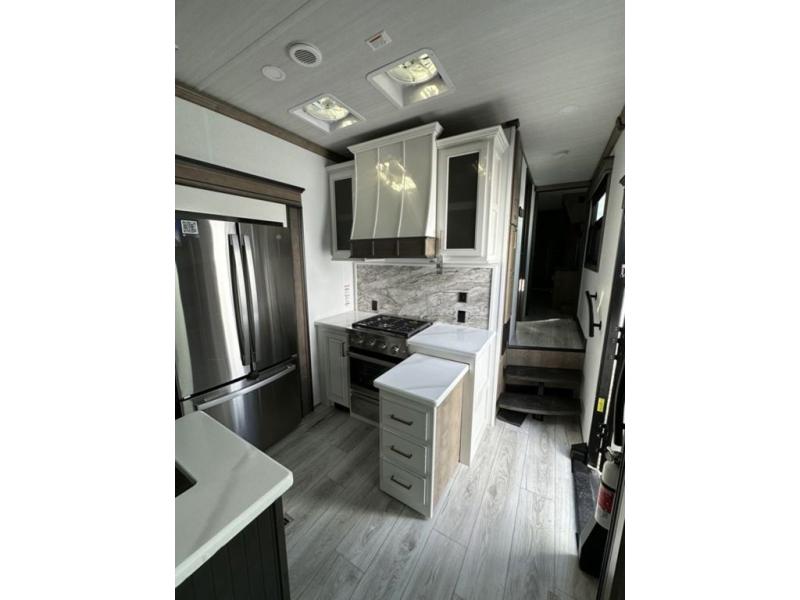 Luxury abounds throughout this fifth wheel! Starting in the kitchen with the island, two pull out pantries with extra countertop space above it, a residential range with hidden storage, and a pull out countertop for more prepping space. The full bathroom has a 48" x 30" fiberglass shower with a seat, decorative glass enclosure, and skylight above it for more natural lighting as two get ready at once with the dual sink vanity. Sleep like a baby in the front private bedroom on the king bed slide with storage underneath and keep your clothes looking their best with two closets and additional storage. The rear living area offers true relaxation with a hide-a-bed sofa and power theater seating across from the entertainment center with a 5,000 BTU decorative fireplace heater and 50" Smart TV to watch your favorite movies!