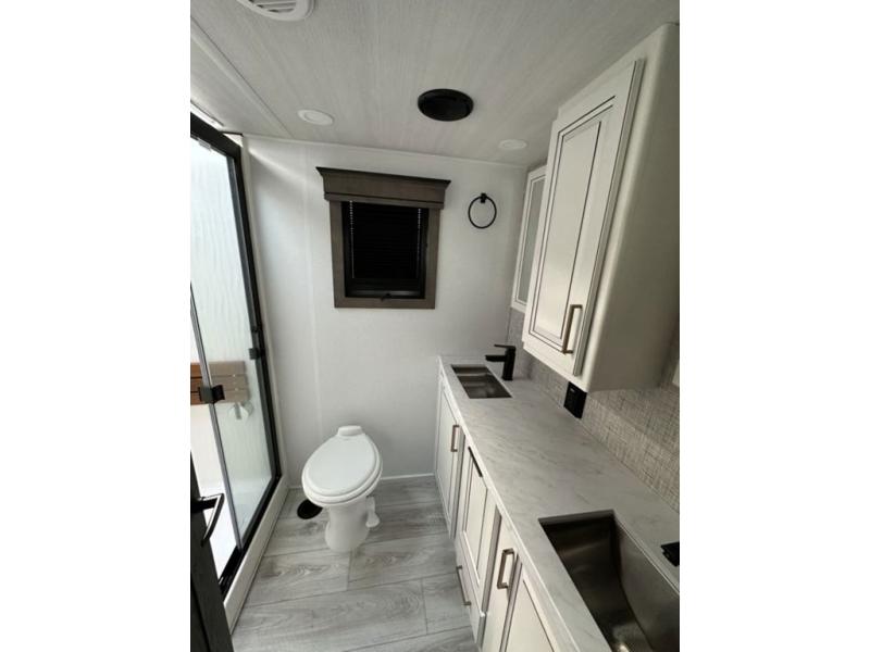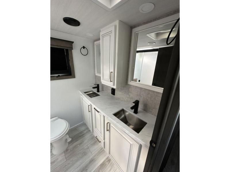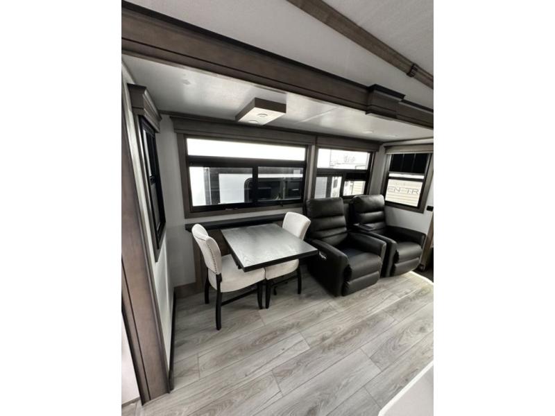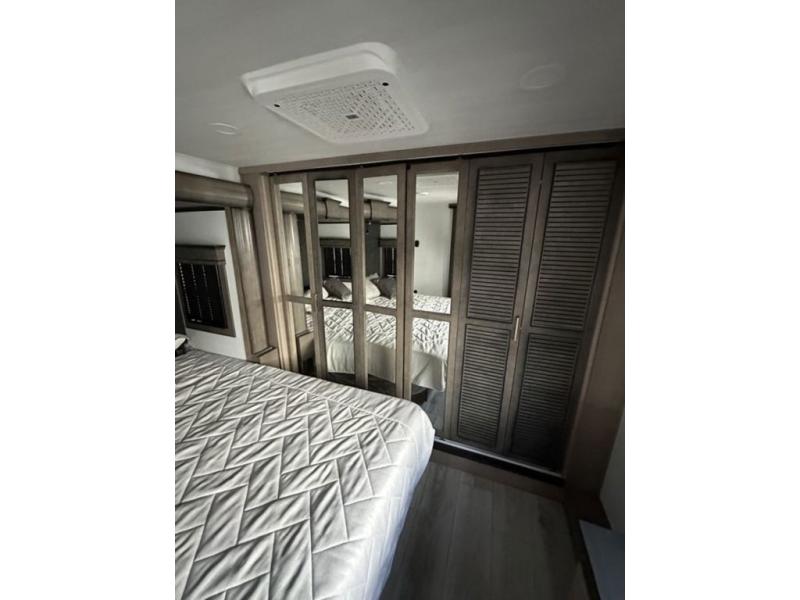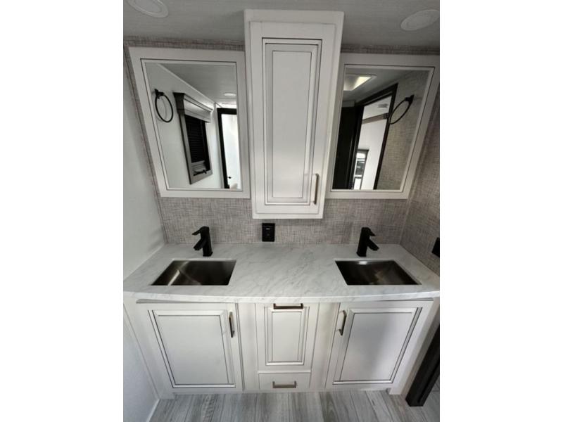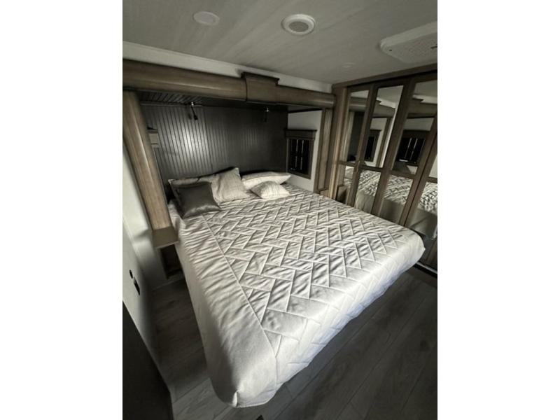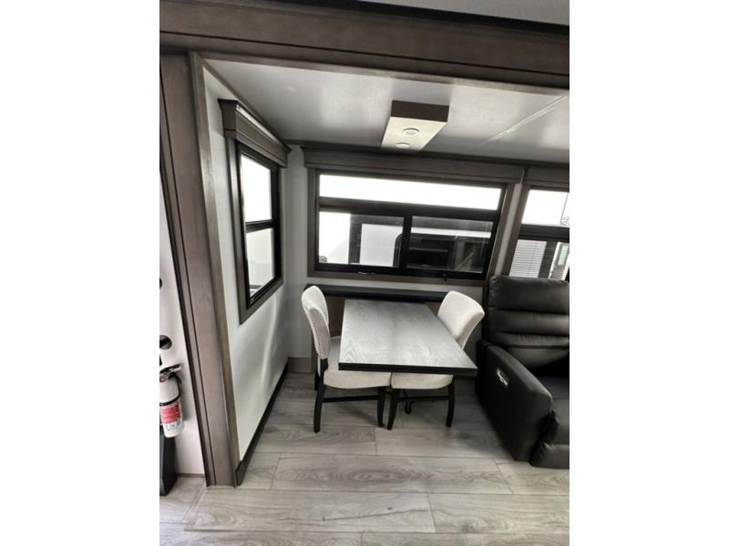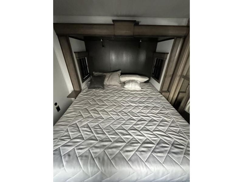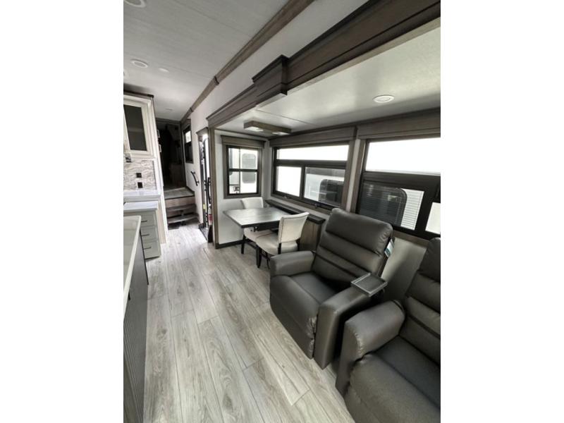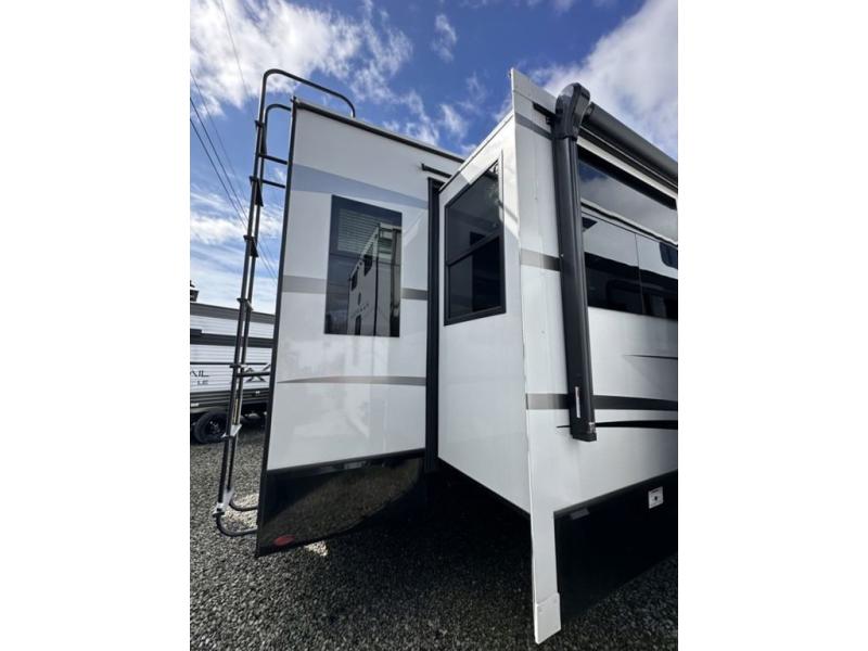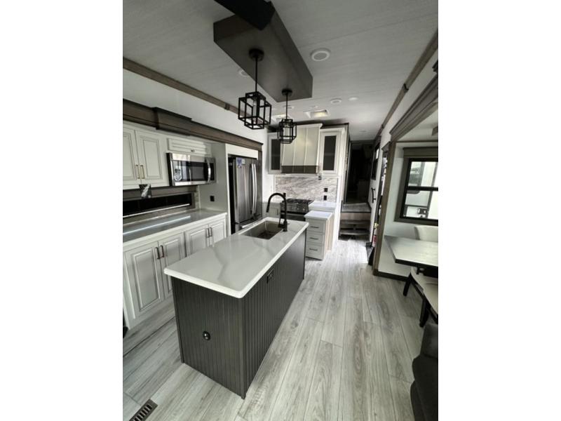 Luxury abounds throughout this fifth wheel! Starting in the kitchen with the island, two pull out pantries with extra countertop space above it, a residential range with hidden storage, and a pull out countertop for more prepping space. The full bathroom has a 48" x 30" fiberglass shower with a seat, decorative glass enclosure, and skylight above it for more natural lighting as two get ready at once with the dual sink vanity. Sleep like a baby in the front private bedroom on the king bed slide with storage underneath and keep your clothes looking their best with two closets and additional storage. The rear living area offers true relaxation with a hide-a-bed sofa and power theater seating across from the entertainment center with a 5,000 BTU decorative fireplace heater and 50" Smart TV to watch your favorite movies!