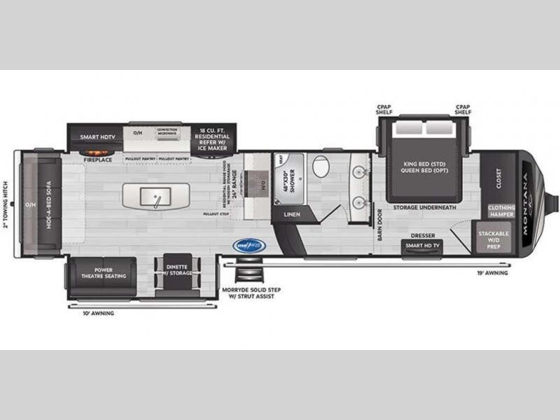 Enjoy luxury, innovation, and the outdoors in any one of Montana's finest fifth wheels. Each set the standard with exceptional features, and exciting factory installed options to provide you a great home on the road. Keystone's exclusive 12" I-beam chassis with z-frame technology has been reengineered to be stronger, lighter and built for "the long haul". A few other construction features you will appreciate include a Road Armor suspension, 2" thick, dual-layered lauan high gloss fiberglass sidewalls, a MaxTurn front cap with KeyShield automotive-grade paint, and a fully walkable roof with an Alpha seamless TPO membrane system. Each feature stylish interiors with two decor choices paired with beautiful hardwood cabinetry, vinyl flooring throughout, central vacuum, plus a La-Z-Boy furniture package for all-around comfort!