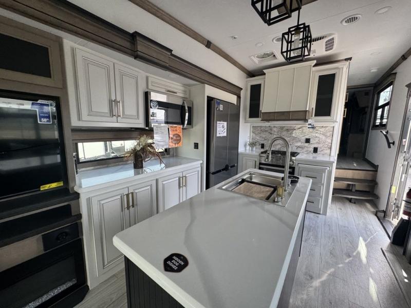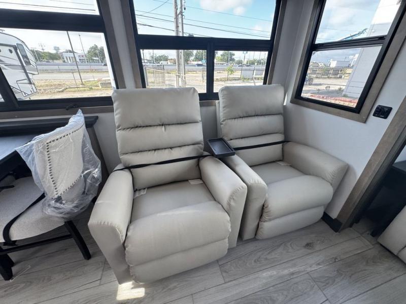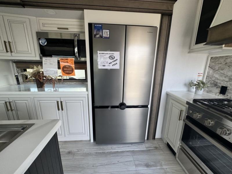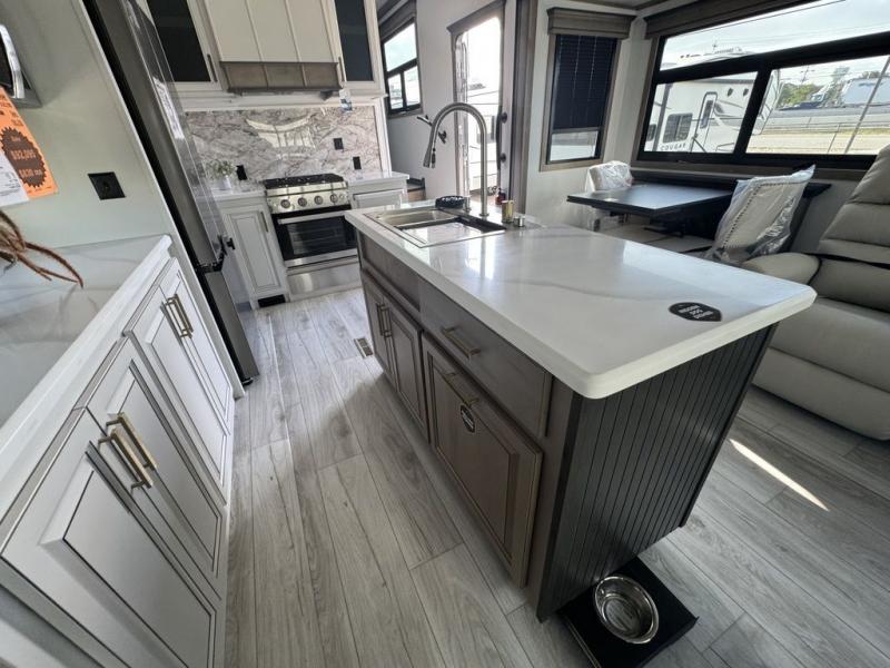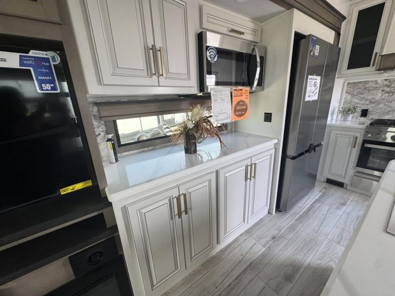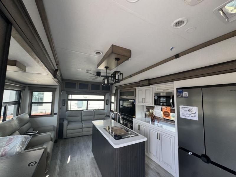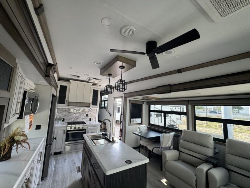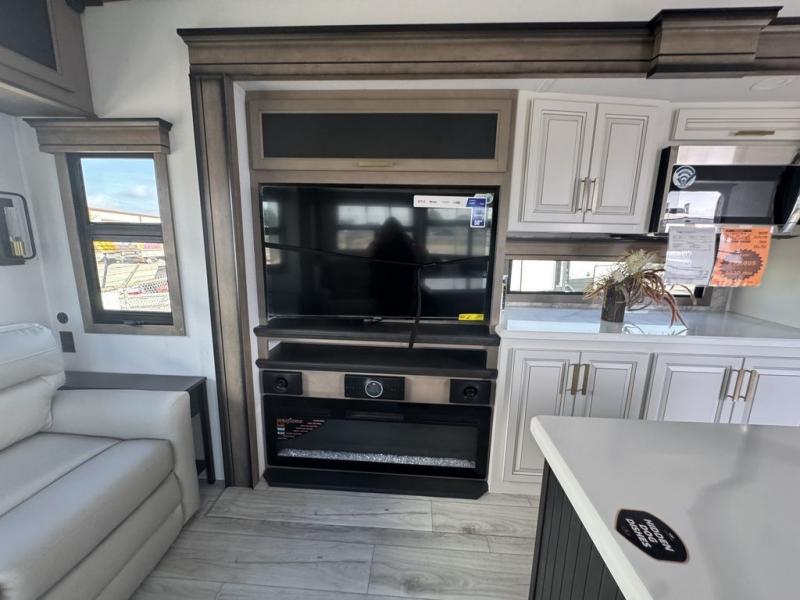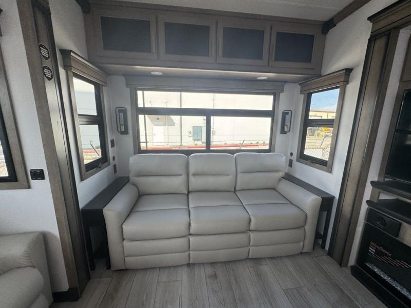 Luxury abounds throughout this fifth wheel! Starting in the kitchen with the island, two pull out pantries with extra countertop space above it, a residential range with hidden storage, and a pull out countertop for more prepping space. The full bathroom has a 48" x 30" fiberglass shower with a seat, decorative glass enclosure, and skylight above it for more natural lighting as two get ready at once with the dual sink vanity. Sleep like a baby in the front private bedroom on the king bed slide with storage underneath and keep your clothes looking their best with two closets and additional storage. The rear living area offers true relaxation with a hide-a-bed sofa and power theater seating across from the entertainment center with a 5,000 BTU decorative fireplace heater and 50" Smart TV to watch your favorite movies!