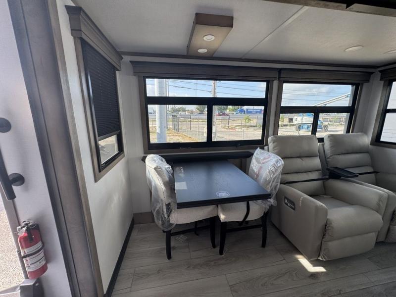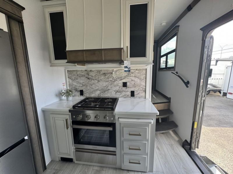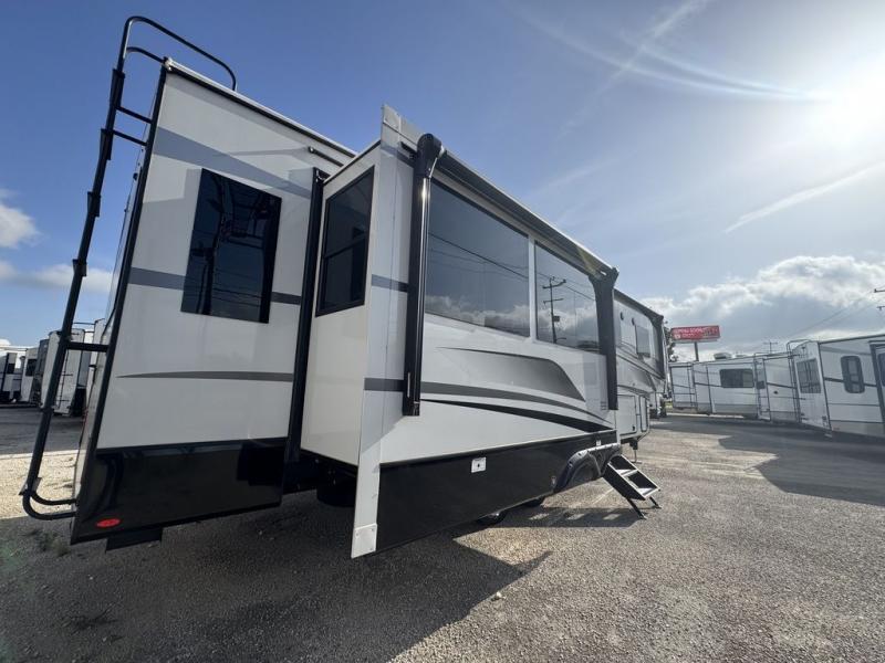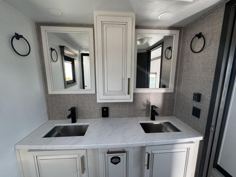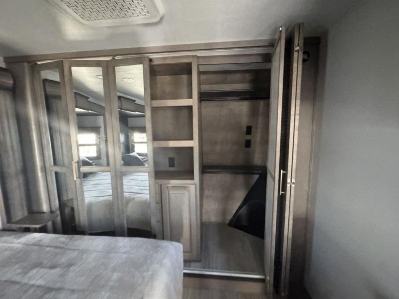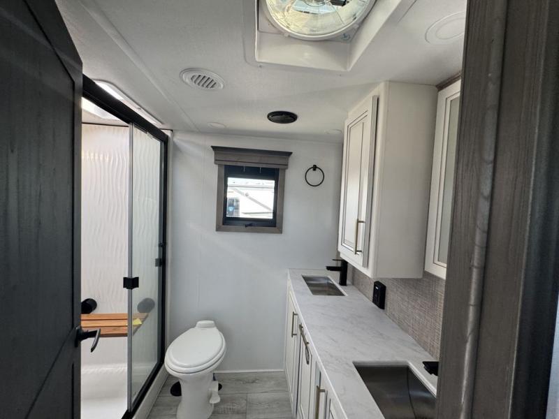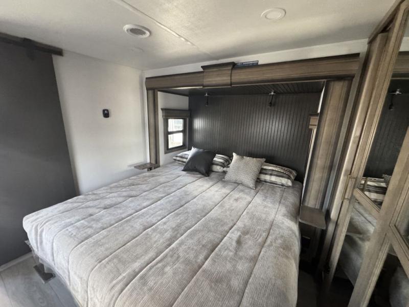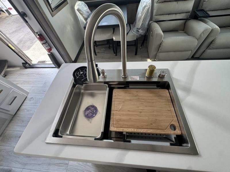 Luxury abounds throughout this fifth wheel! Starting in the kitchen with the island, two pull out pantries with extra countertop space above it, a residential range with hidden storage, and a pull out countertop for more prepping space. The full bathroom has a 48" x 30" fiberglass shower with a seat, decorative glass enclosure, and skylight above it for more natural lighting as two get ready at once with the dual sink vanity. Sleep like a baby in the front private bedroom on the king bed slide with storage underneath and keep your clothes looking their best with two closets and additional storage. The rear living area offers true relaxation with a hide-a-bed sofa and power theater seating across from the entertainment center with a 5,000 BTU decorative fireplace heater and 50" Smart TV to watch your favorite movies!