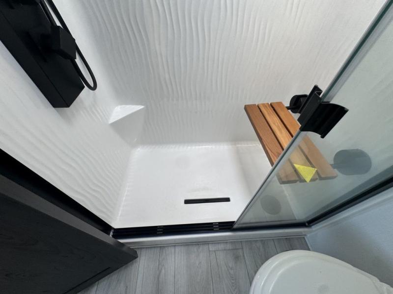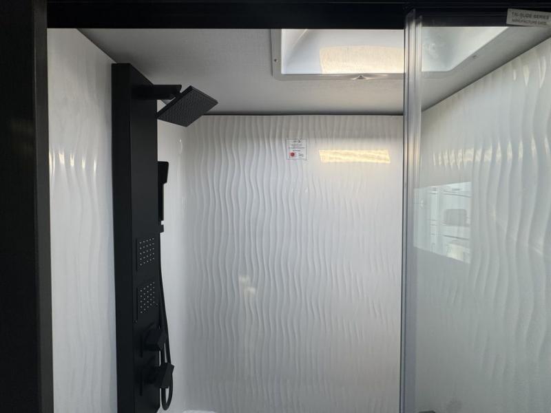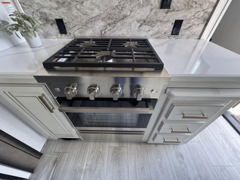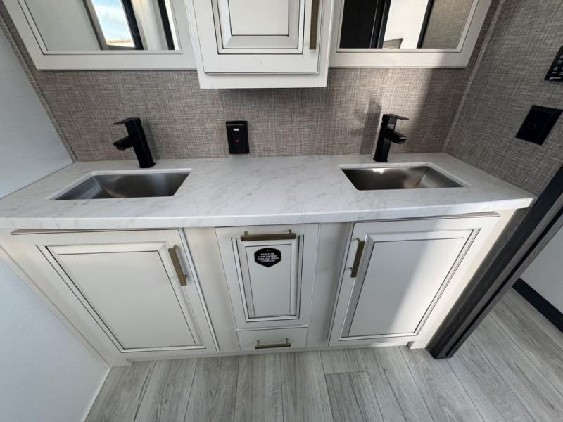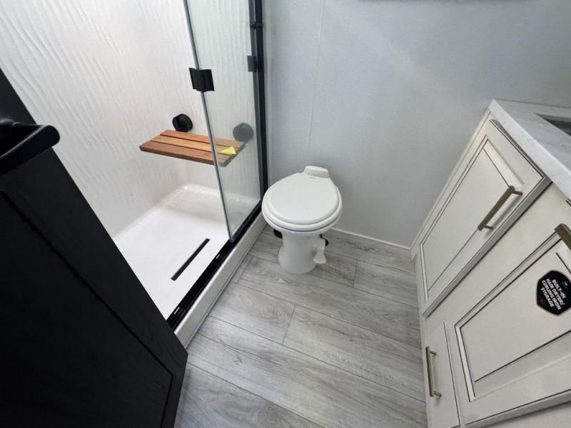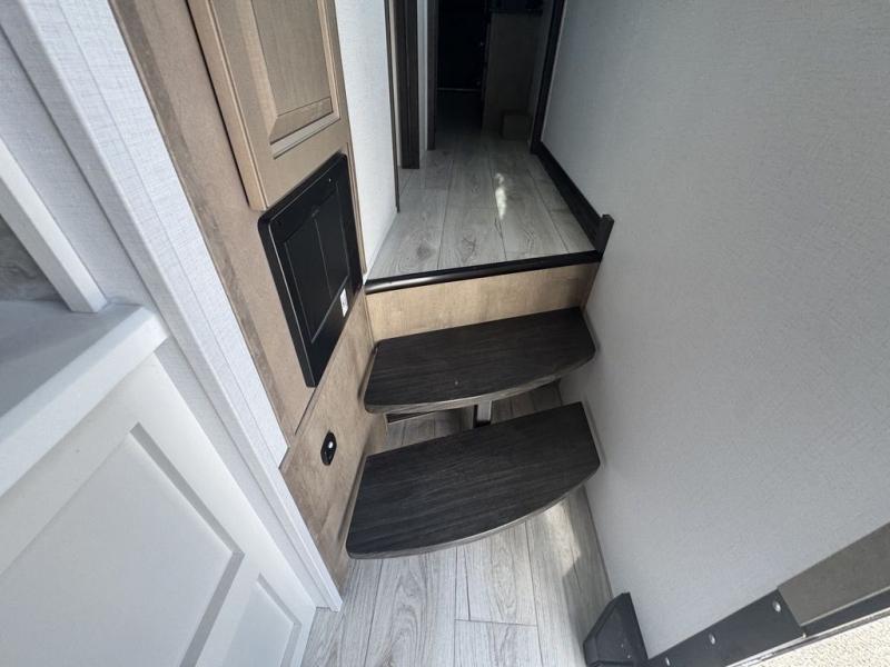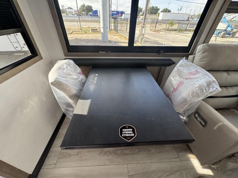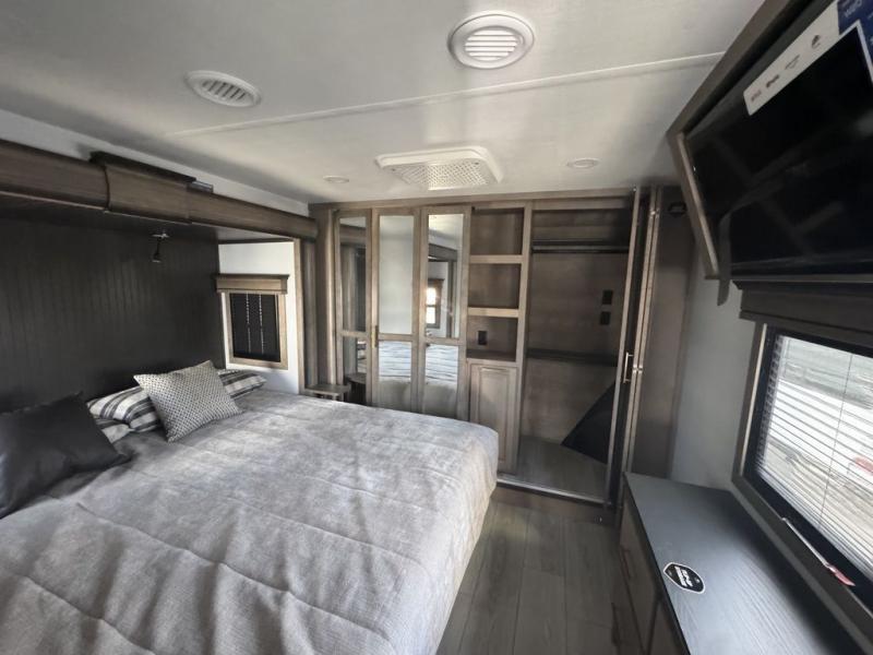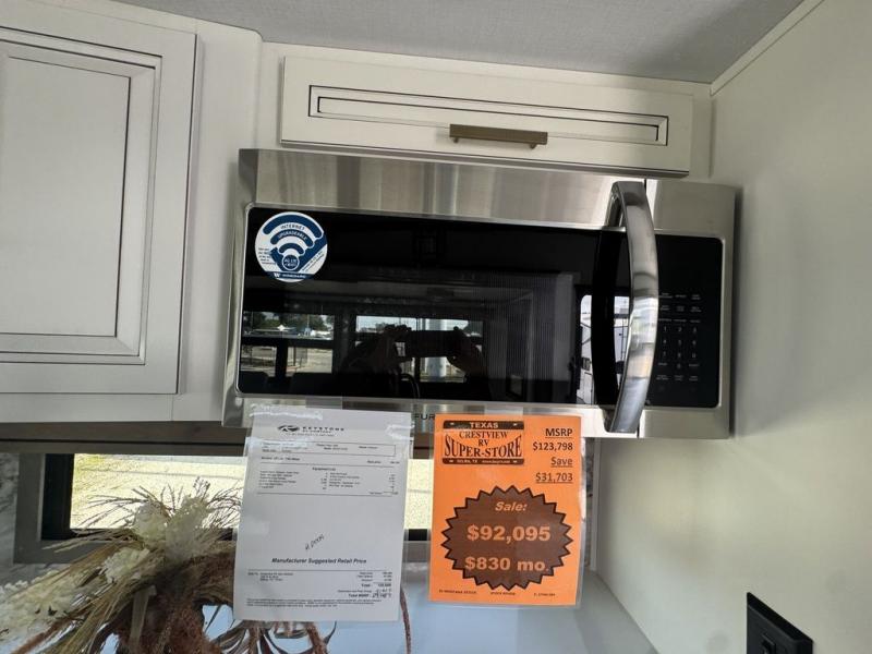 Luxury abounds throughout this fifth wheel! Starting in the kitchen with the island, two pull out pantries with extra countertop space above it, a residential range with hidden storage, and a pull out countertop for more prepping space. The full bathroom has a 48" x 30" fiberglass shower with a seat, decorative glass enclosure, and skylight above it for more natural lighting as two get ready at once with the dual sink vanity. Sleep like a baby in the front private bedroom on the king bed slide with storage underneath and keep your clothes looking their best with two closets and additional storage. The rear living area offers true relaxation with a hide-a-bed sofa and power theater seating across from the entertainment center with a 5,000 BTU decorative fireplace heater and 50" Smart TV to watch your favorite movies!