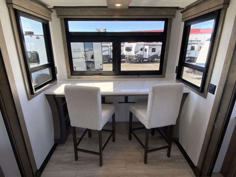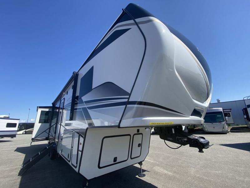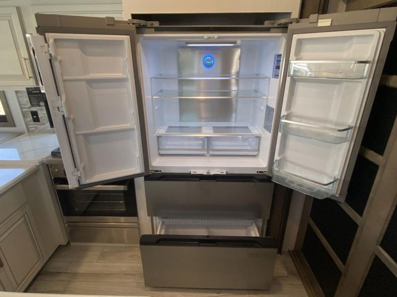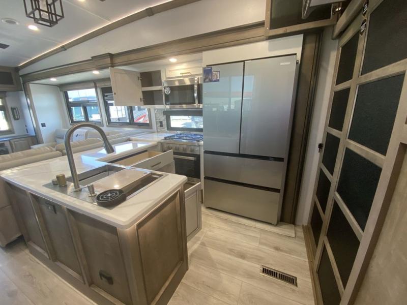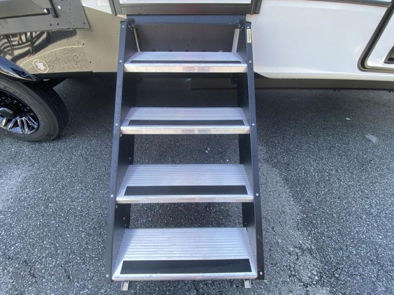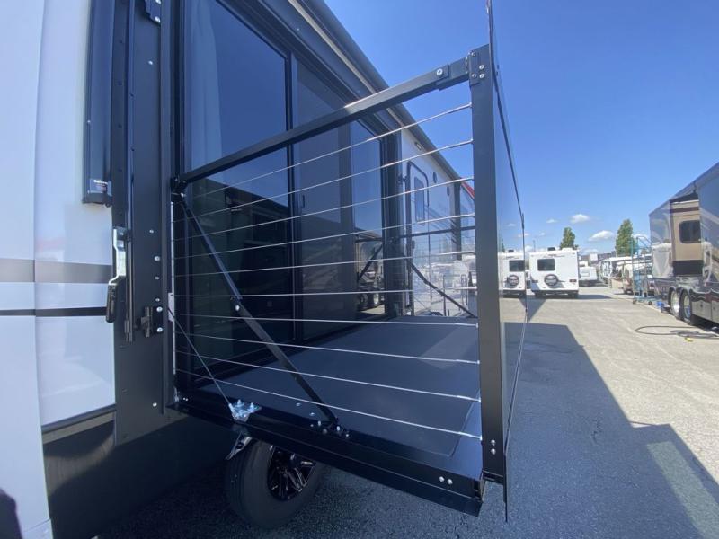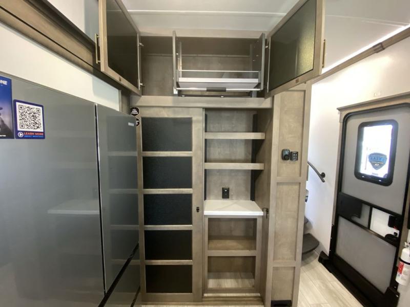 Luxury abounds throughout this fifth wheel starting in the centrally located kitchen featuring an L-shaped counter, a large floor to ceiling pantry with sliding glass doors, a 24" range with an overhead convection microwave, and an 18 cu. ft. residential refrigerator with ice an maker. Just up the steps to the right of the entry, you will find a spacious bathroom featuring a 48" x 30" fiberglass shower with a seat, decorative glass enclosure, linen cabinet, and skylight above it for more natural lighting. Sleep like a baby in the front private bedroom on the king bed slide with storage underneath, and keep your clothes looking their best with the front closets. The rear entertainment living area offers true relaxation with L-shaped seating including a hide-a-bed sofa along the roadside, and powered theater seating facing the entertainment center with a 5,000 BTU decorative fireplace heater and Smart TV to watch your favorite movies! And don't overlook the best part, the powered side patio to entertain guests!