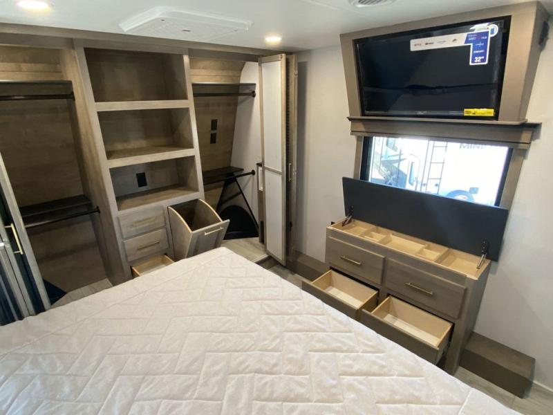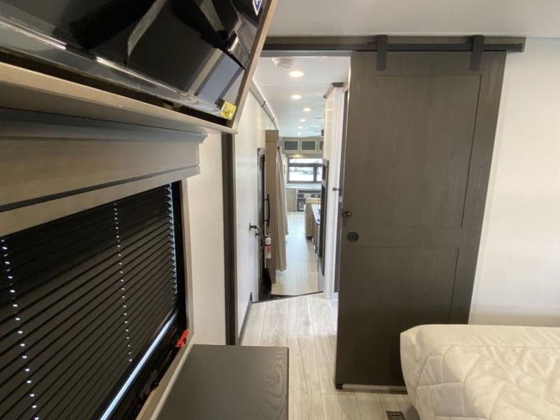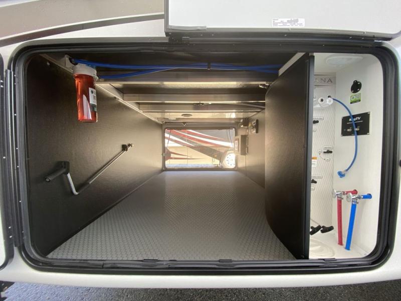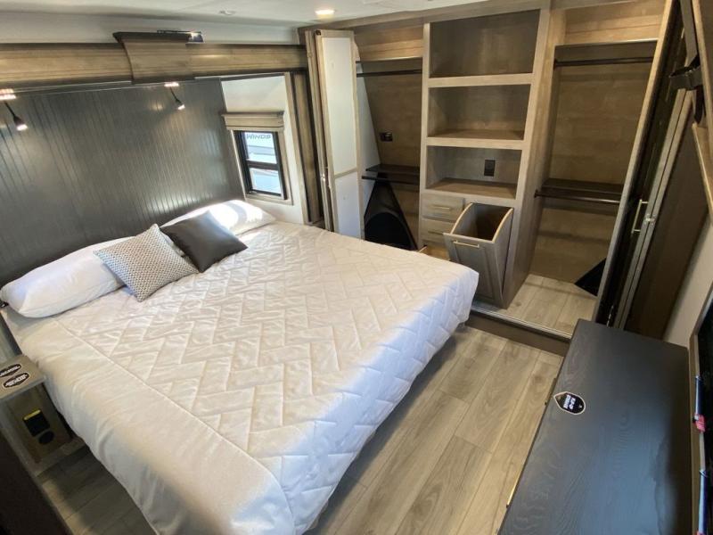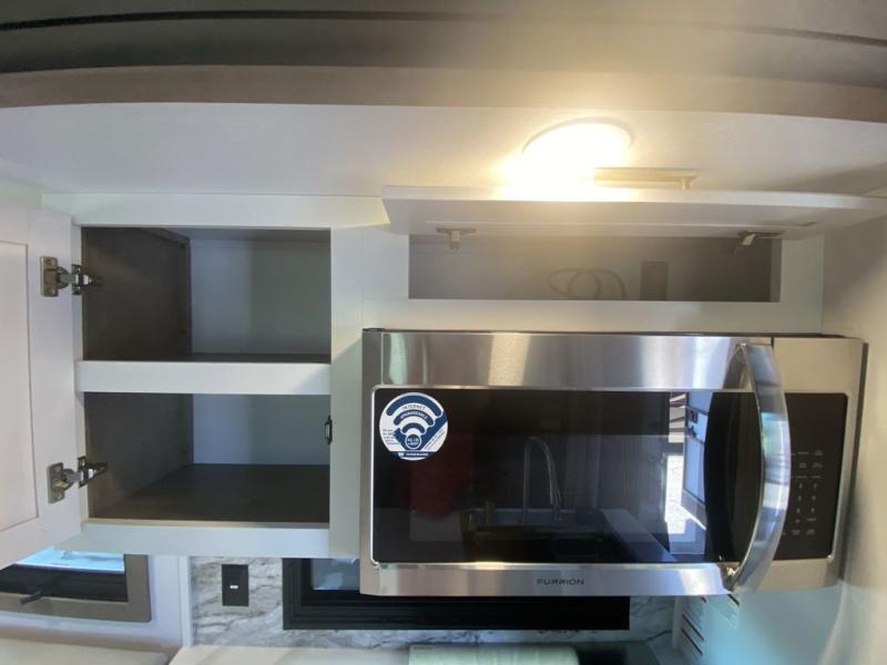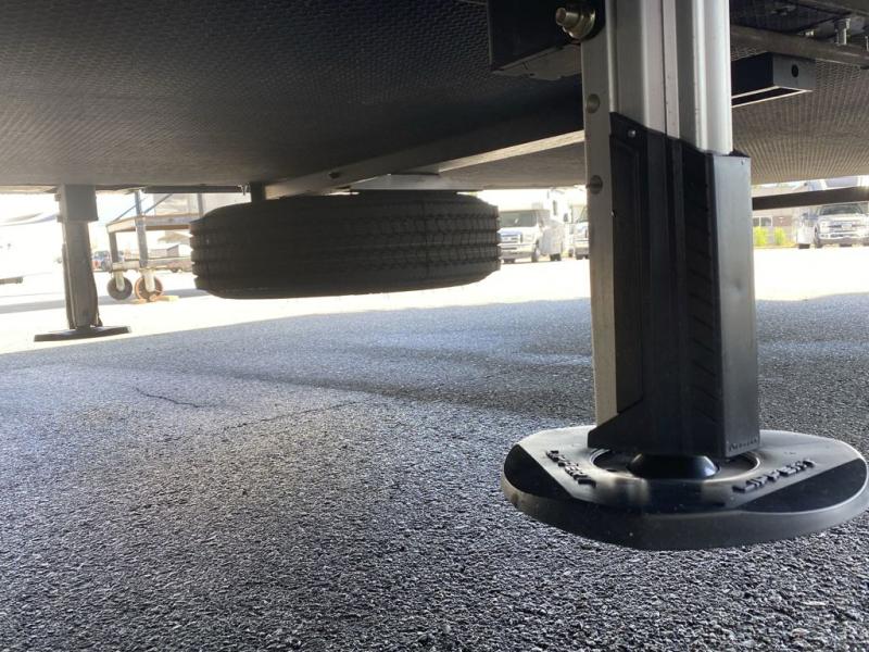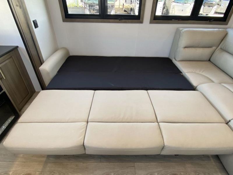 Luxury abounds throughout this fifth wheel starting in the centrally located kitchen featuring an L-shaped counter, a large floor to ceiling pantry with sliding glass doors, a 24" range with an overhead convection microwave, and an 18 cu. ft. residential refrigerator with ice an maker. Just up the steps to the right of the entry, you will find a spacious bathroom featuring a 48" x 30" fiberglass shower with a seat, decorative glass enclosure, linen cabinet, and skylight above it for more natural lighting. Sleep like a baby in the front private bedroom on the king bed slide with storage underneath, and keep your clothes looking their best with the front closets. The rear entertainment living area offers true relaxation with L-shaped seating including a hide-a-bed sofa along the roadside, and powered theater seating facing the entertainment center with a 5,000 BTU decorative fireplace heater and Smart TV to watch your favorite movies! And don't overlook the best part, the powered side patio to entertain guests!