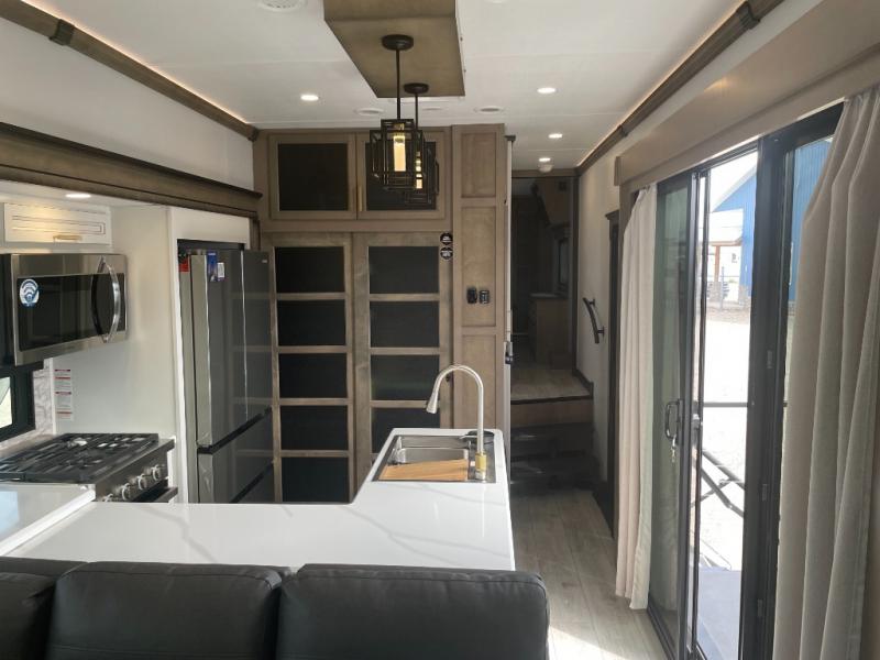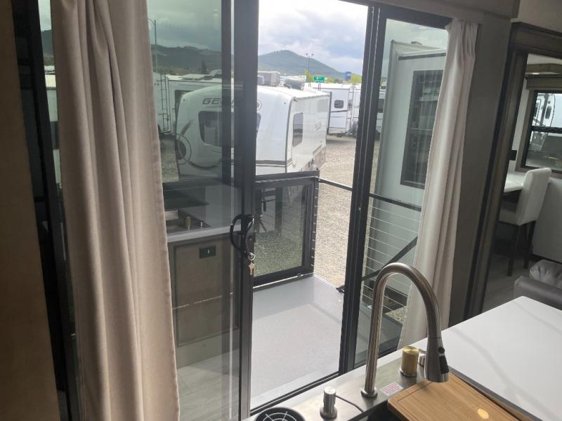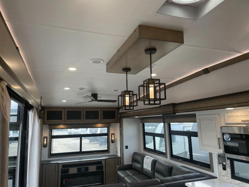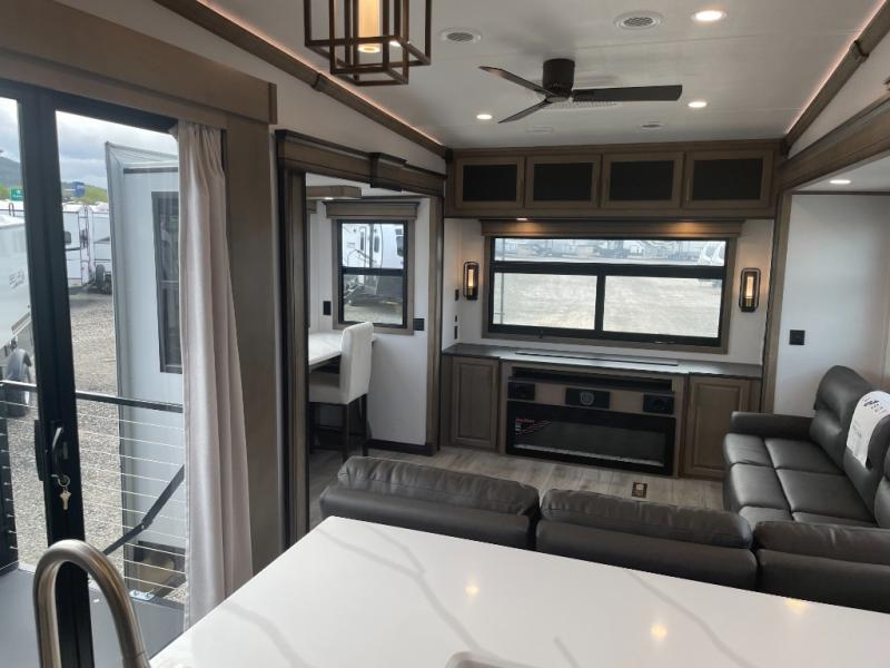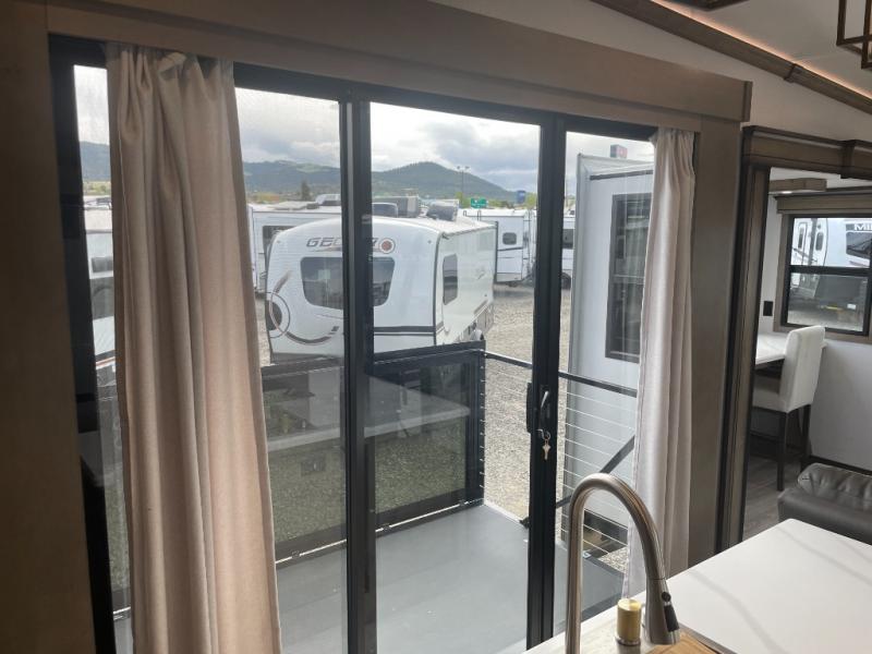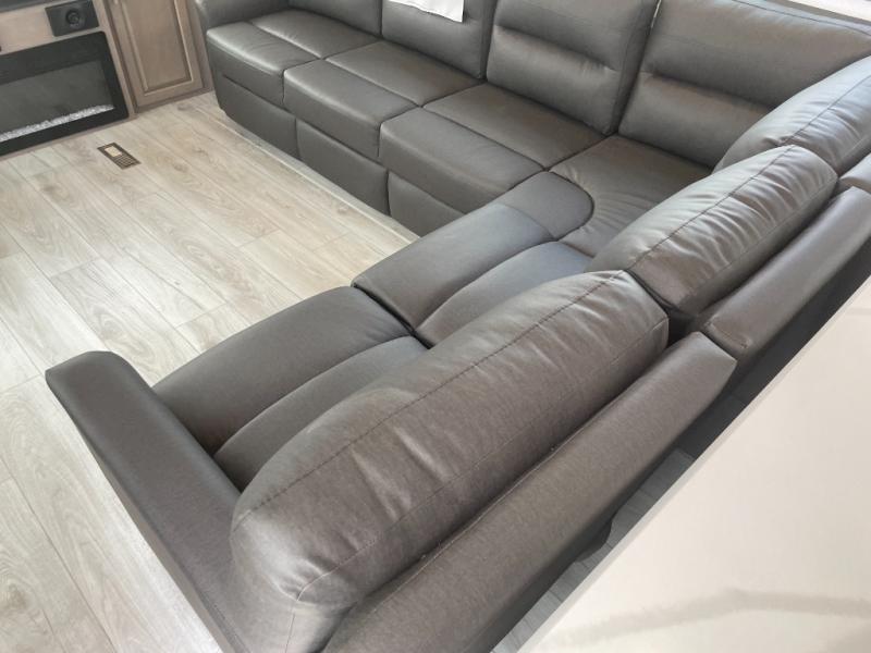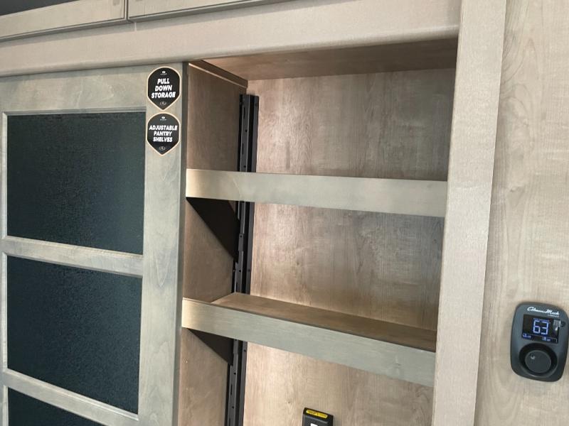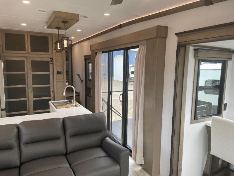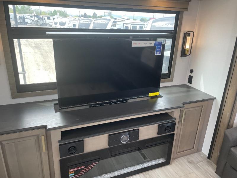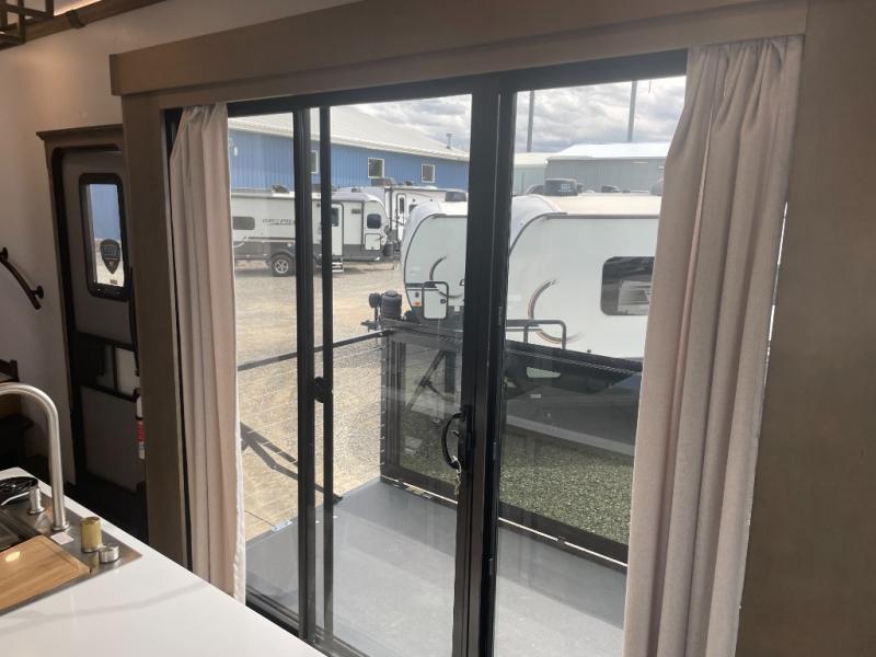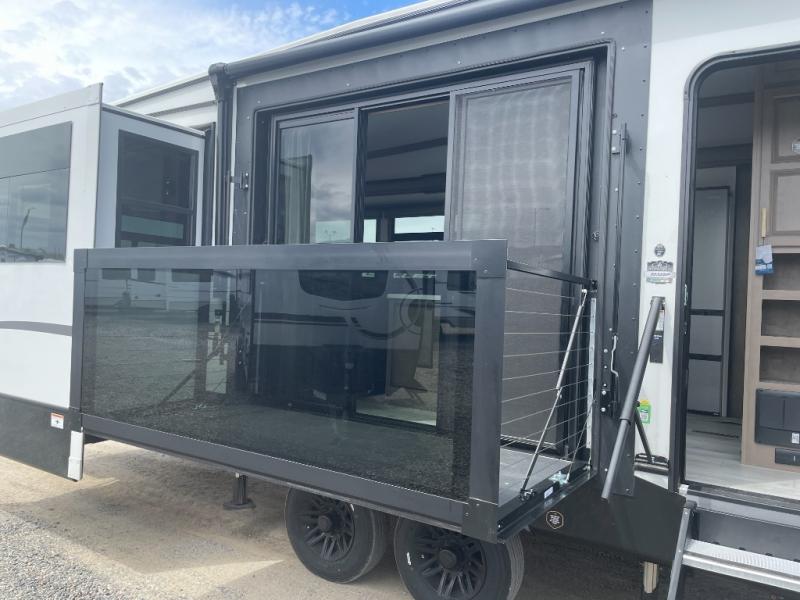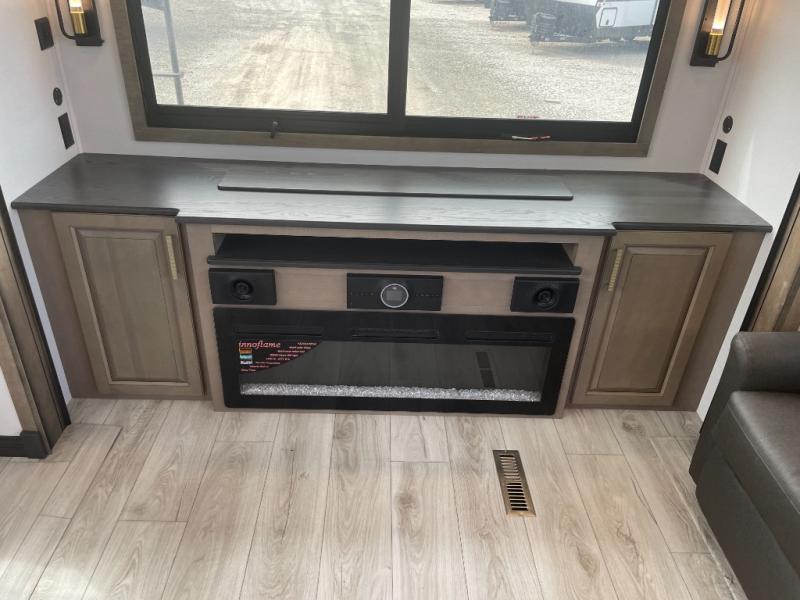 Luxury abounds throughout this fifth wheel starting in the centrally located kitchen featuring an L-shaped counter, a large floor to ceiling pantry with sliding glass doors, a 24" range with an overhead convection microwave, and an 18 cu. ft. residential refrigerator with ice an maker. Just up the steps to the right of the entry, you will find a spacious bathroom featuring a 48" x 30" fiberglass shower with a seat, decorative glass enclosure, linen cabinet, and skylight above it for more natural lighting. Sleep like a baby in the front private bedroom on the king bed slide with storage underneath, and keep your clothes looking their best with the front closets. The rear entertainment living area offers true relaxation with L-shaped seating including a hide-a-bed sofa along the roadside, and powered theater seating facing the entertainment center with a 5,000 BTU decorative fireplace heater and Smart TV to watch your favorite movies! And don't overlook the best part, the powered side patio to entertain guests!