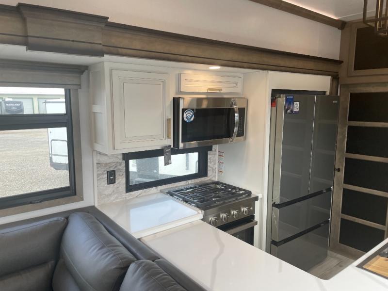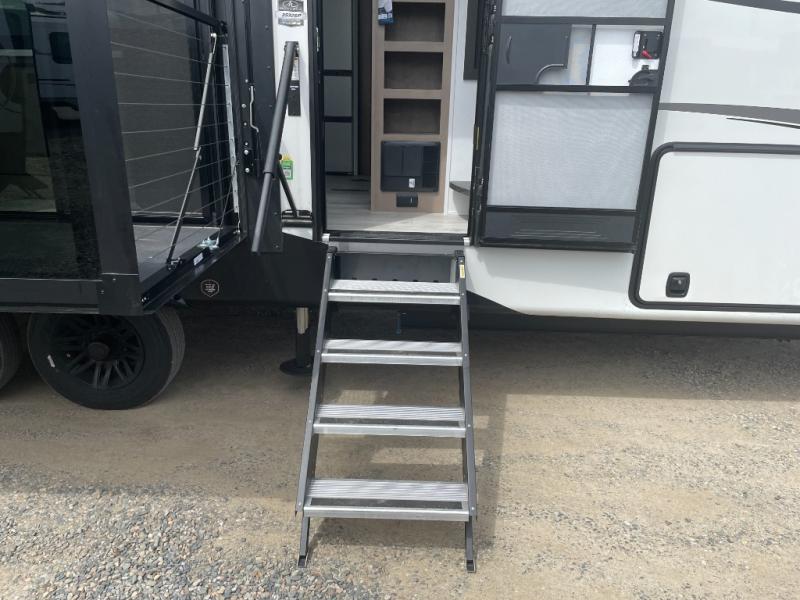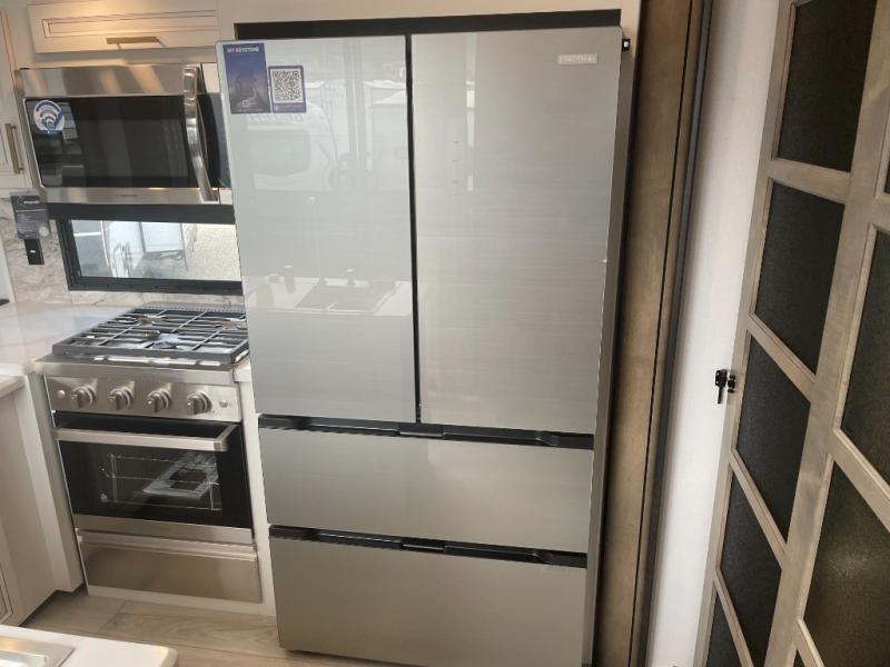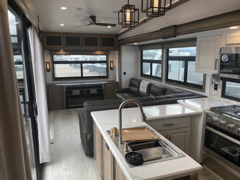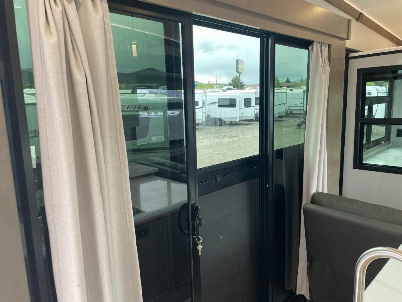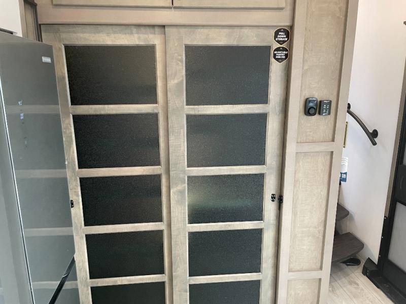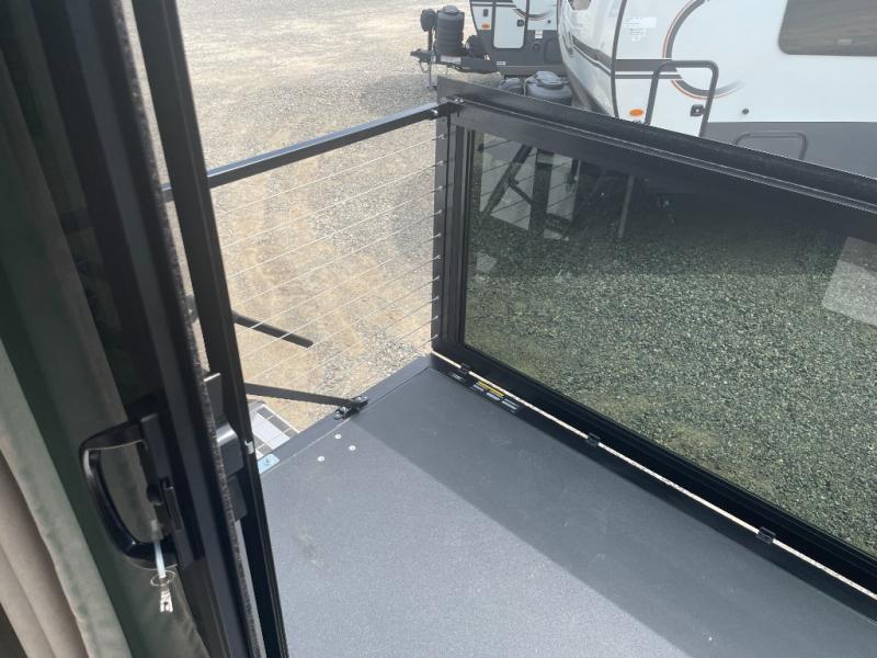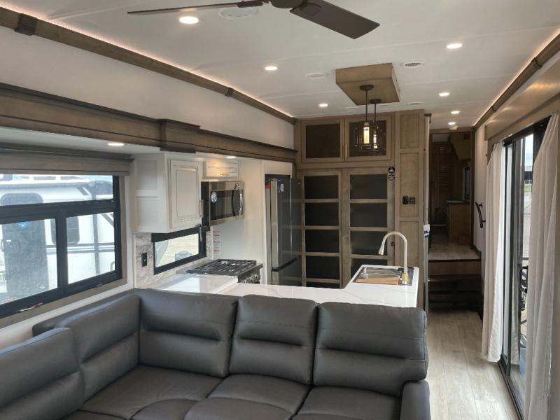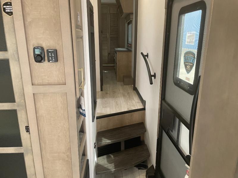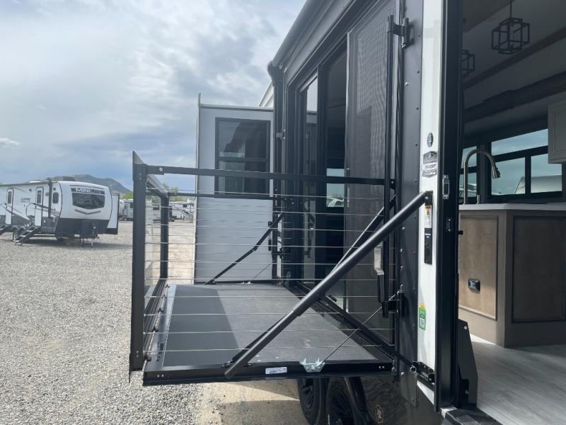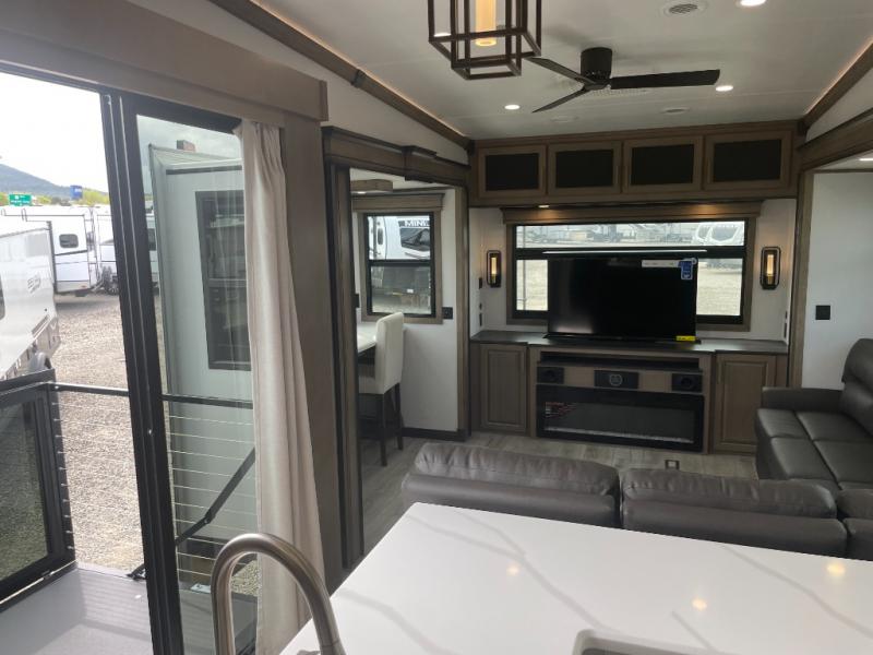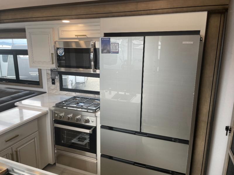 Luxury abounds throughout this fifth wheel starting in the centrally located kitchen featuring an L-shaped counter, a large floor to ceiling pantry with sliding glass doors, a 24" range with an overhead convection microwave, and an 18 cu. ft. residential refrigerator with ice an maker. Just up the steps to the right of the entry, you will find a spacious bathroom featuring a 48" x 30" fiberglass shower with a seat, decorative glass enclosure, linen cabinet, and skylight above it for more natural lighting. Sleep like a baby in the front private bedroom on the king bed slide with storage underneath, and keep your clothes looking their best with the front closets. The rear entertainment living area offers true relaxation with L-shaped seating including a hide-a-bed sofa along the roadside, and powered theater seating facing the entertainment center with a 5,000 BTU decorative fireplace heater and Smart TV to watch your favorite movies! And don't overlook the best part, the powered side patio to entertain guests!