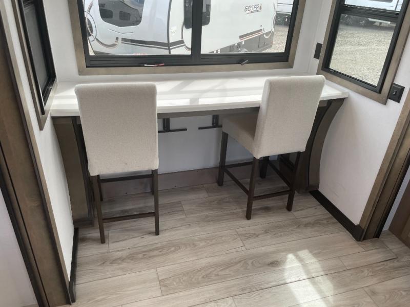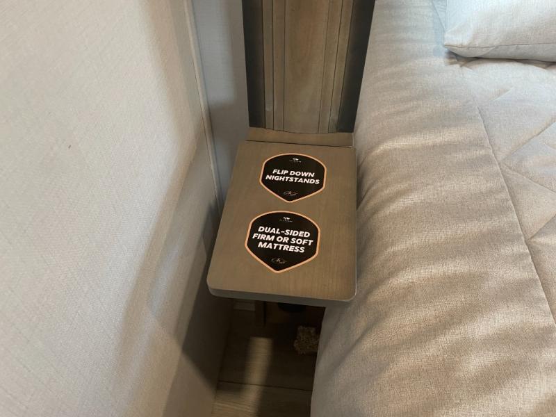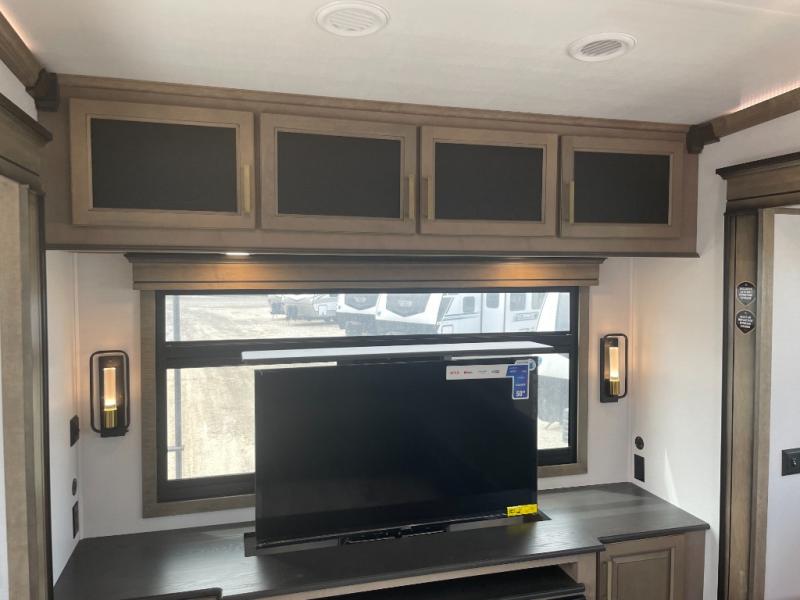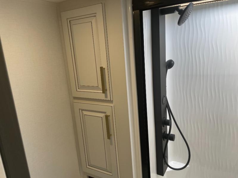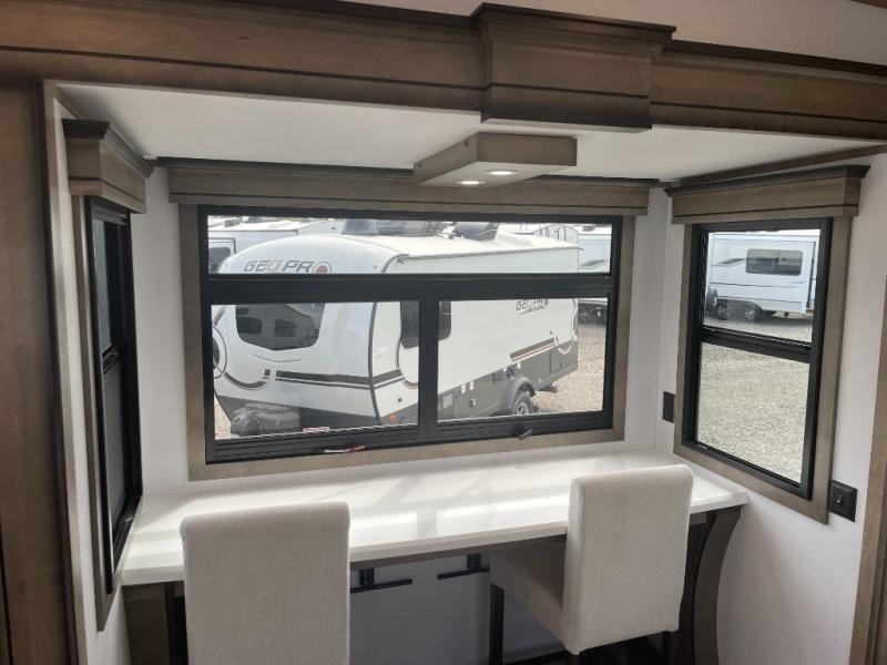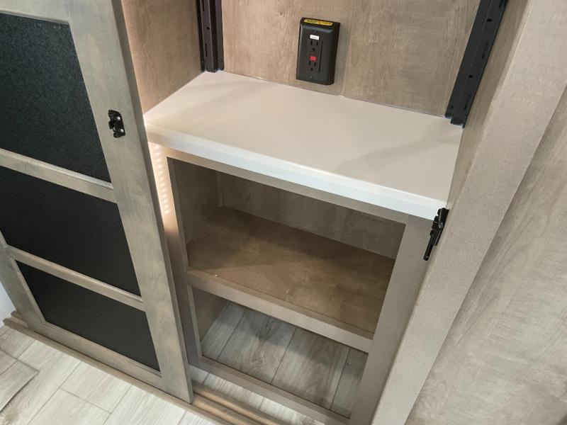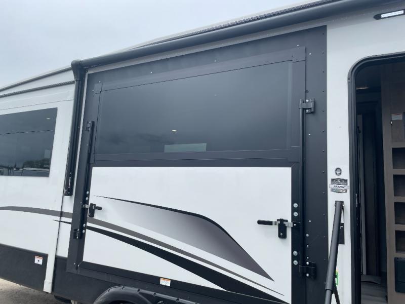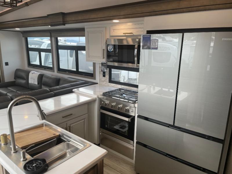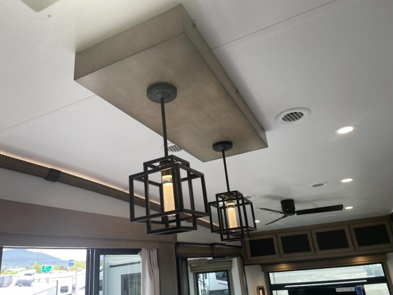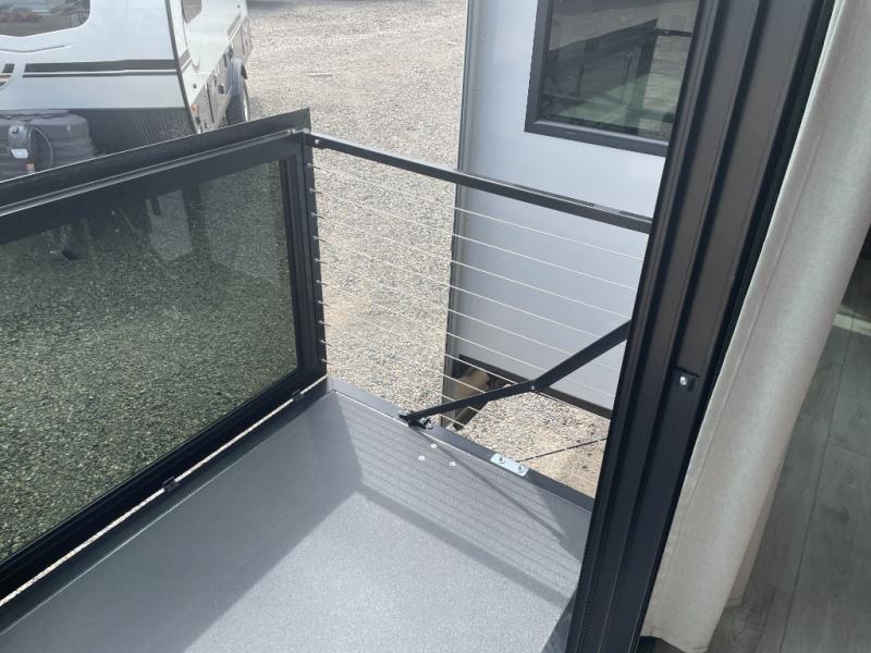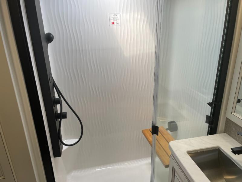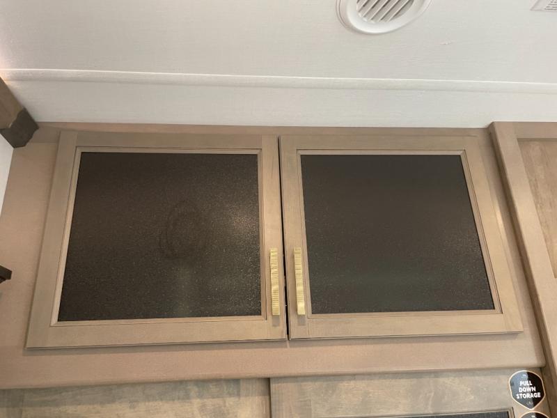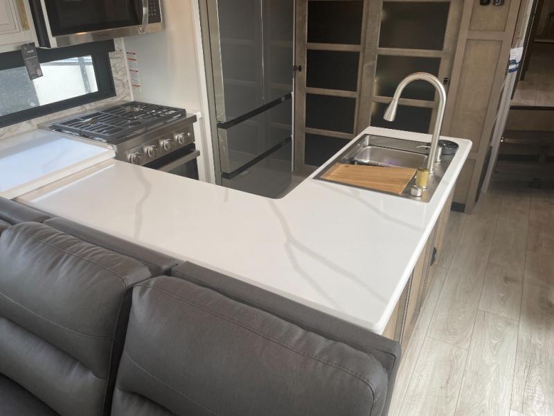 Luxury abounds throughout this fifth wheel starting in the centrally located kitchen featuring an L-shaped counter, a large floor to ceiling pantry with sliding glass doors, a 24" range with an overhead convection microwave, and an 18 cu. ft. residential refrigerator with ice an maker. Just up the steps to the right of the entry, you will find a spacious bathroom featuring a 48" x 30" fiberglass shower with a seat, decorative glass enclosure, linen cabinet, and skylight above it for more natural lighting. Sleep like a baby in the front private bedroom on the king bed slide with storage underneath, and keep your clothes looking their best with the front closets. The rear entertainment living area offers true relaxation with L-shaped seating including a hide-a-bed sofa along the roadside, and powered theater seating facing the entertainment center with a 5,000 BTU decorative fireplace heater and Smart TV to watch your favorite movies! And don't overlook the best part, the powered side patio to entertain guests!