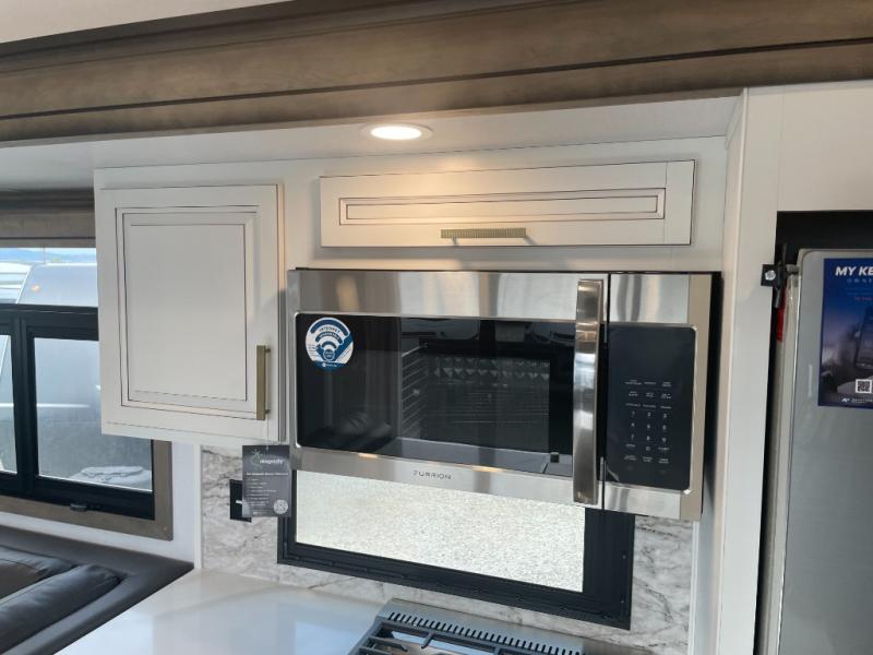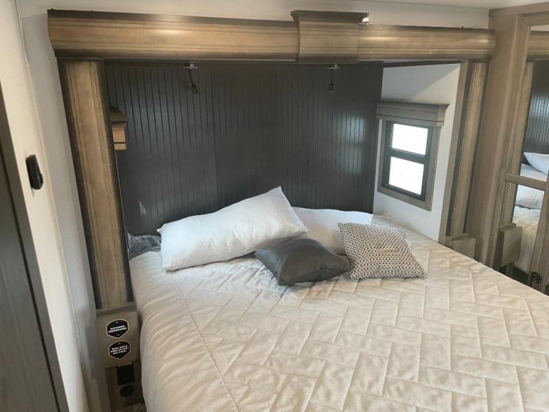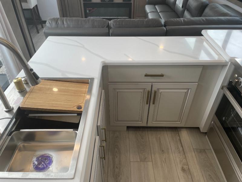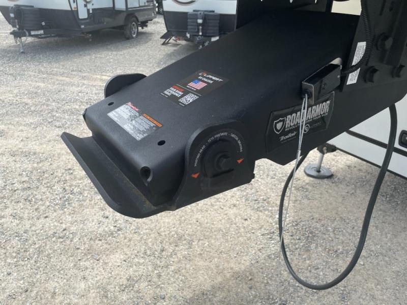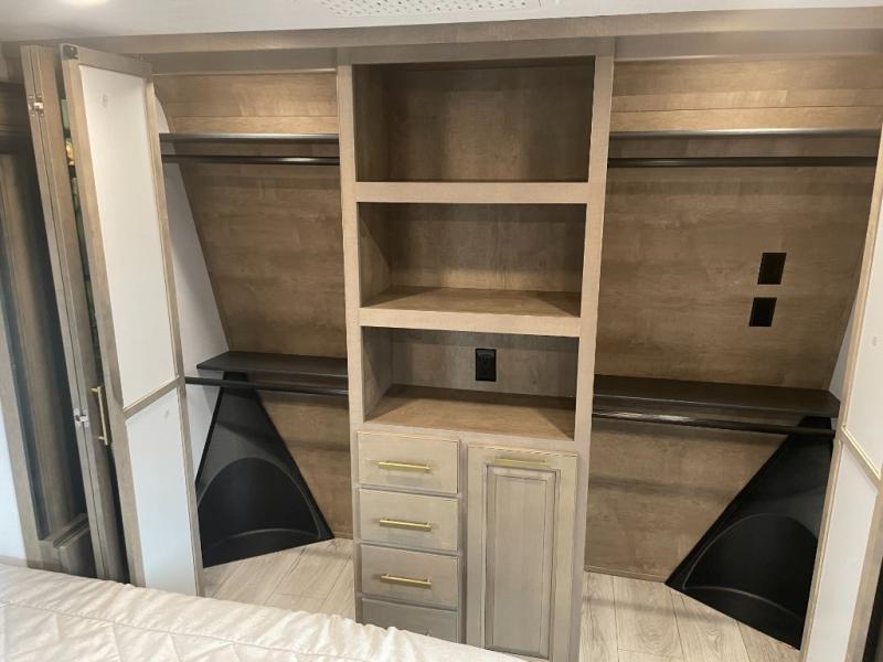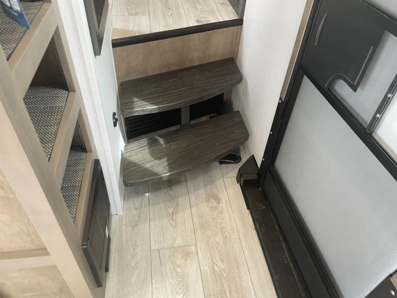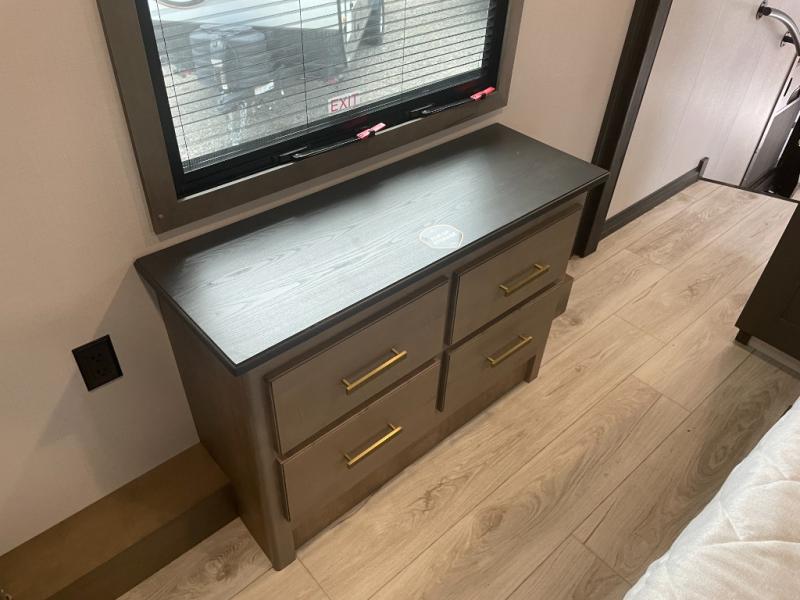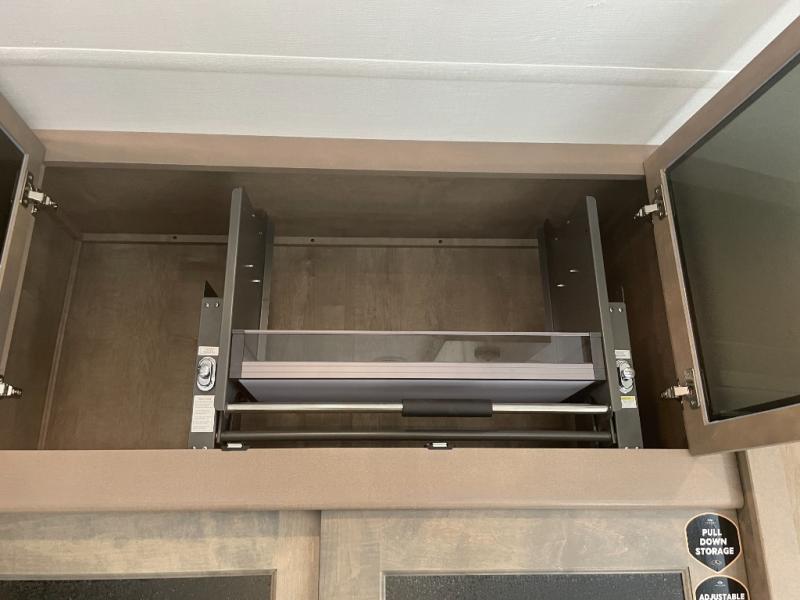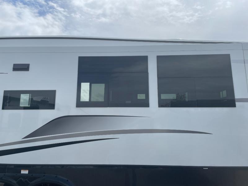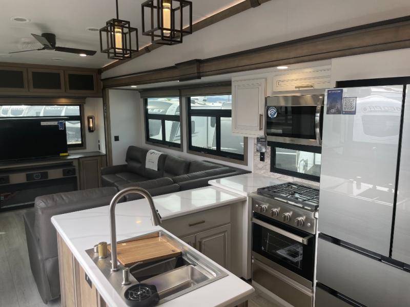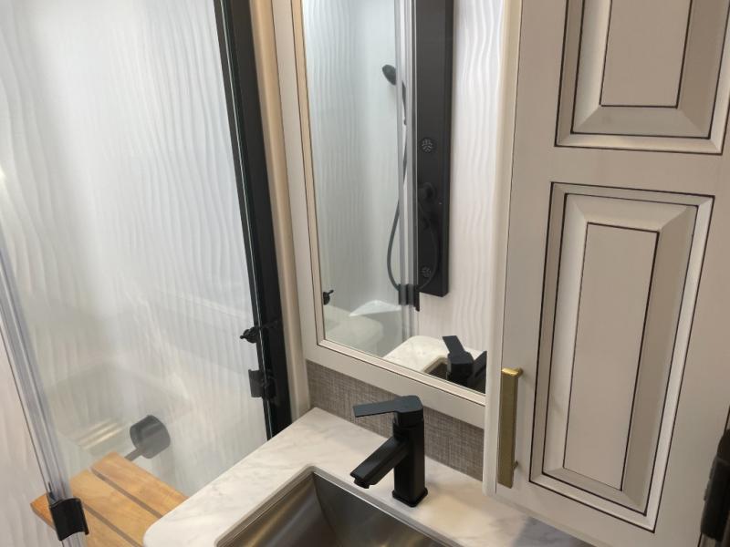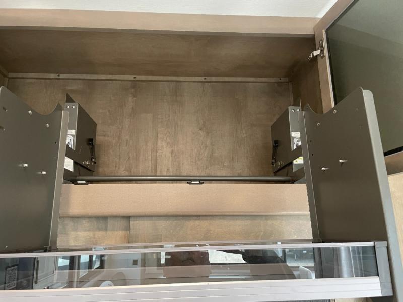 Luxury abounds throughout this fifth wheel starting in the centrally located kitchen featuring an L-shaped counter, a large floor to ceiling pantry with sliding glass doors, a 24" range with an overhead convection microwave, and an 18 cu. ft. residential refrigerator with ice an maker. Just up the steps to the right of the entry, you will find a spacious bathroom featuring a 48" x 30" fiberglass shower with a seat, decorative glass enclosure, linen cabinet, and skylight above it for more natural lighting. Sleep like a baby in the front private bedroom on the king bed slide with storage underneath, and keep your clothes looking their best with the front closets. The rear entertainment living area offers true relaxation with L-shaped seating including a hide-a-bed sofa along the roadside, and powered theater seating facing the entertainment center with a 5,000 BTU decorative fireplace heater and Smart TV to watch your favorite movies! And don't overlook the best part, the powered side patio to entertain guests!